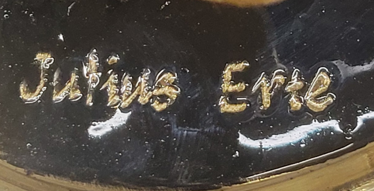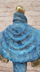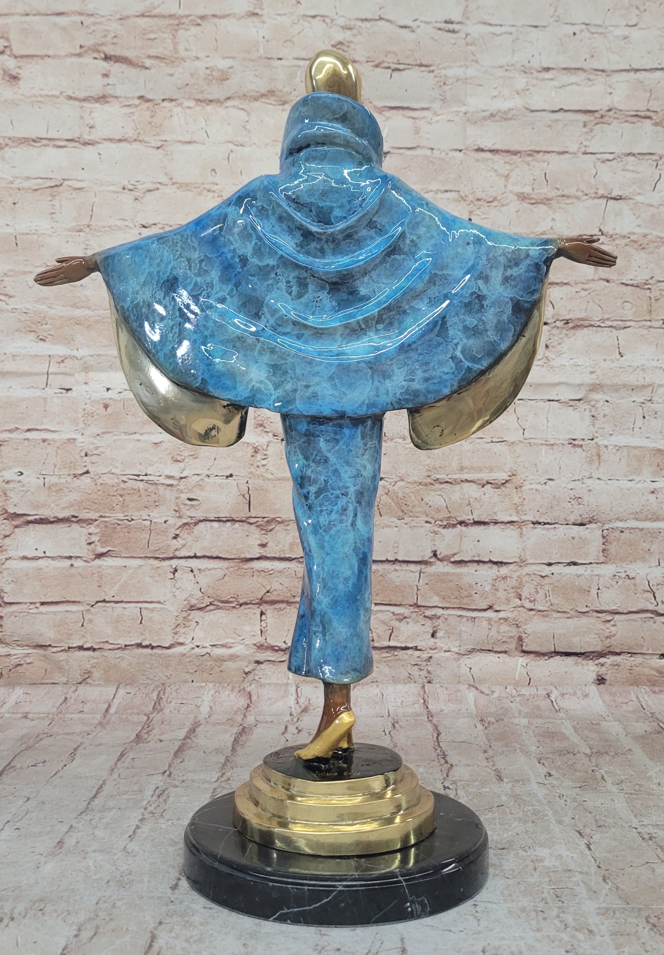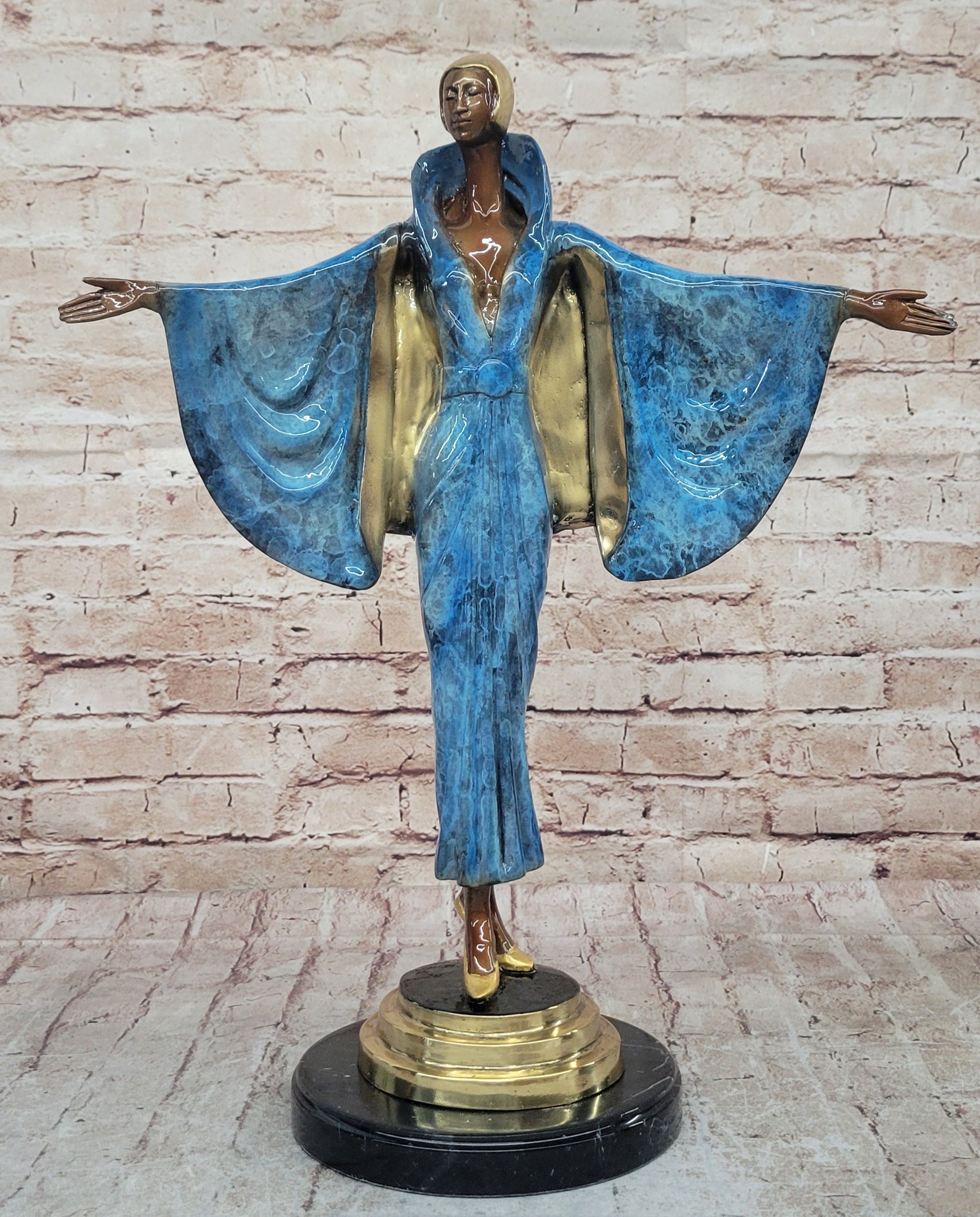 She stands at the end of the runway, capturing the essence of haute couture. With her arms gracefully extended, she radiates confidence and style. Her long dress, adorned in a golden brown patina, accentuates her slender waistline, while the vintage-inspired high collar adds a touch of classic elegance reminiscent of old Hollywood glamour. Draped over her shoulders, a black shawl cascades with fluidity, its rich patina capturing the illusion of movement. As the camera bulbs flash, she embraces the attention and glamor of center stage, closing her eyes in a moment of pure bliss. This exquisite fashionista sculpture is a true masterpiece, meticulously handcrafted from 100% bronze. Created using the esteemed "Lost Wax Method," every detail is carefully sculpted to perfection, showcasing the artist's exceptional skill and craftsmanship. Mounted on a solid marble base, this captivating piece commands attention and admiration. It bears the distinguished signature of Jullet Erte, an artist renowned for capturing the beauty and allure of the fashion world. Own a piece of fashion history with this remarkable bronze sculpture. Its timeless beauty and artistry make it a stunning addition to any collection or as a focal point in your home or gallery. Let this fashion-forward masterpiece transport you to the world of high fashion and elegance, where style knows no bounds.