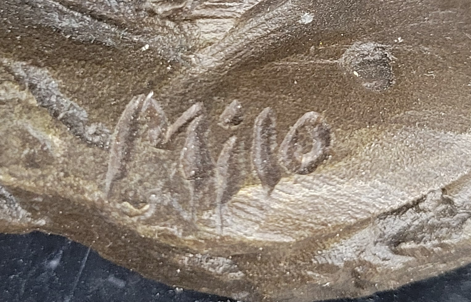 Mounted on a polished green marble base, the sculpture gains an extra touch of sophistication, contrasting beautifully with the bronze. Milo’s signature adorns this work, affirming its authenticity and quality. This piece serves as a beautiful reminder of the horse's noble and free spirit and makes an ideal centerpiece for any collection, home, or office setting.Bronze Dimensions with Marble Base: Height 12" X Width 14"