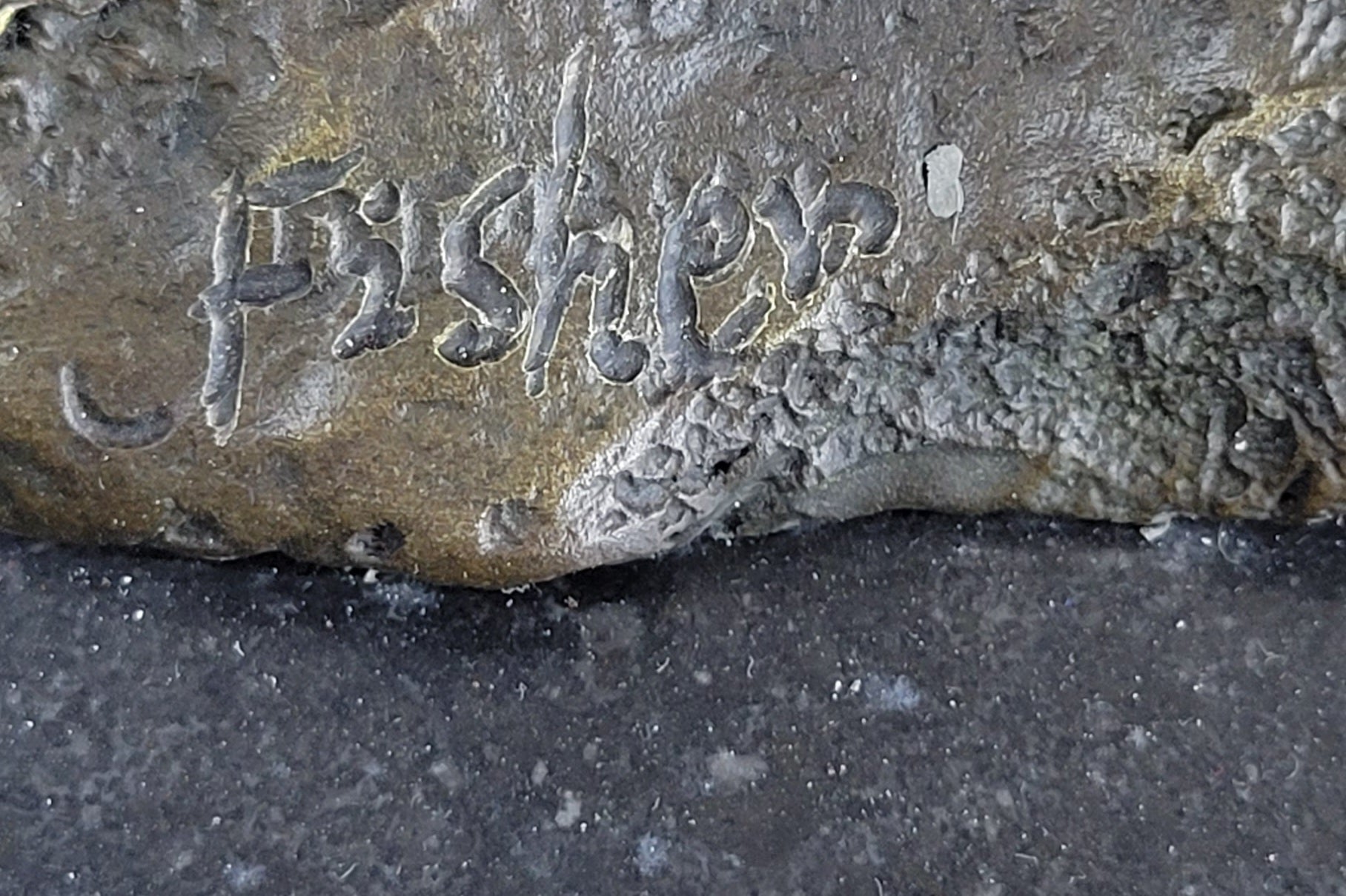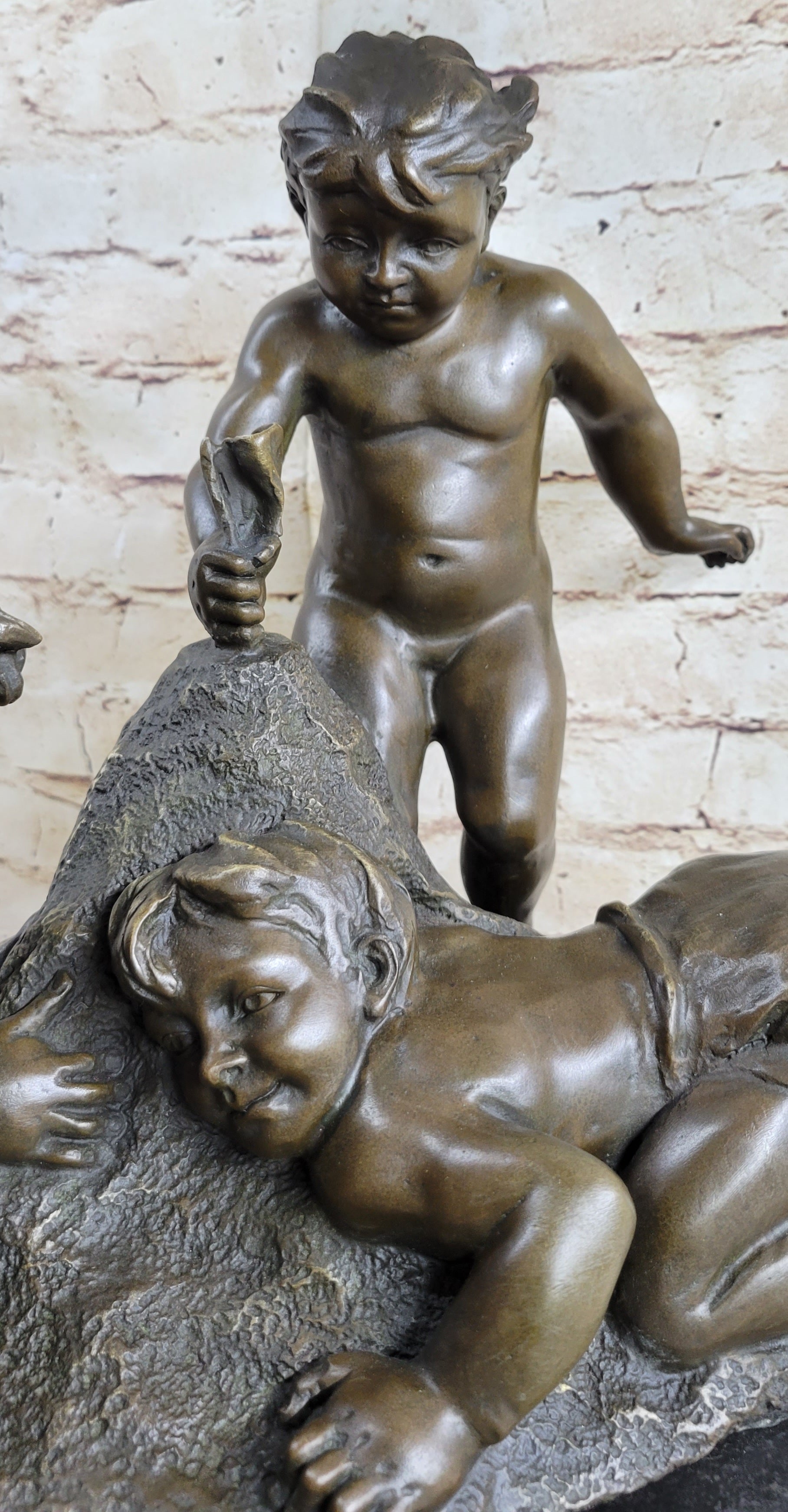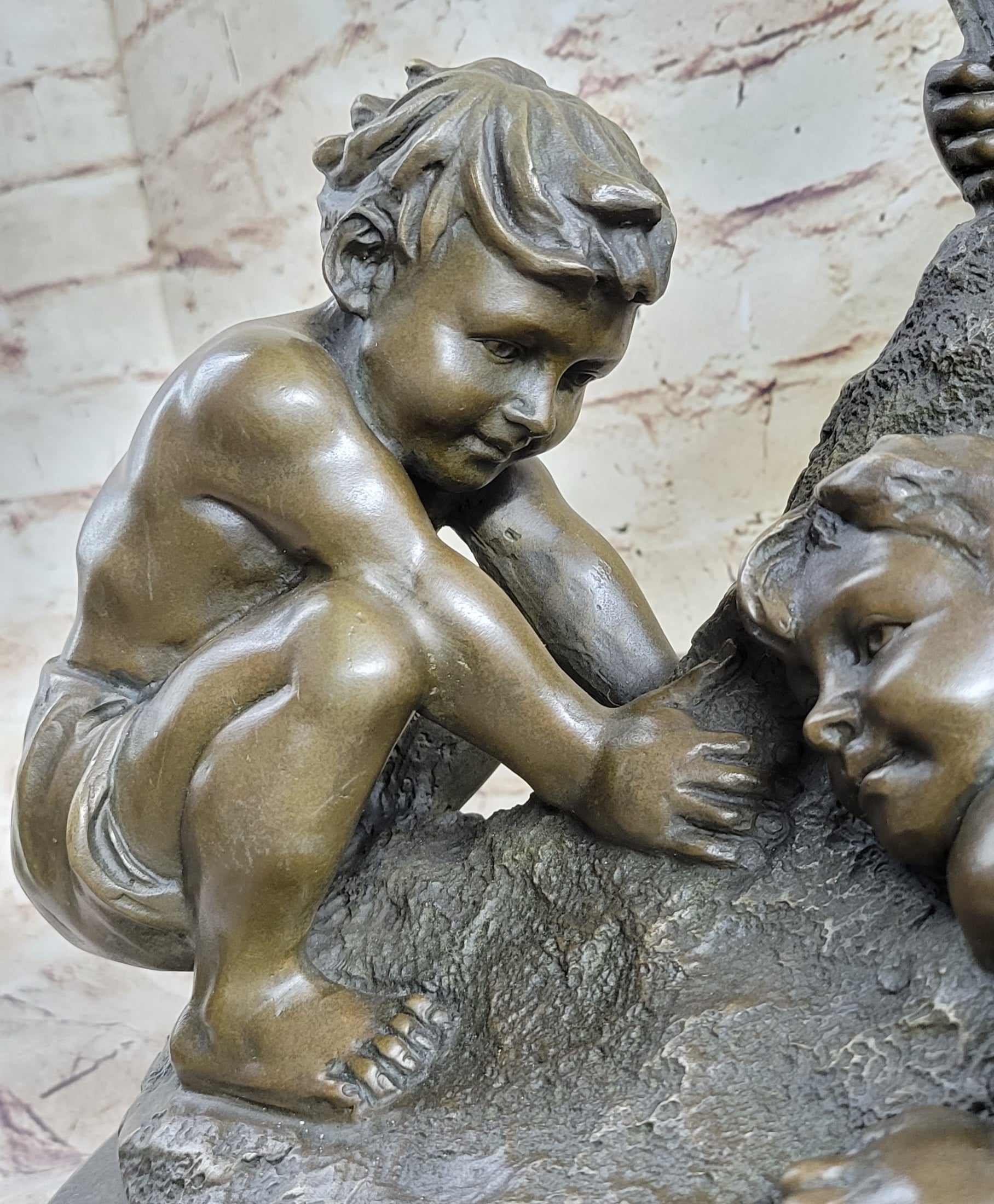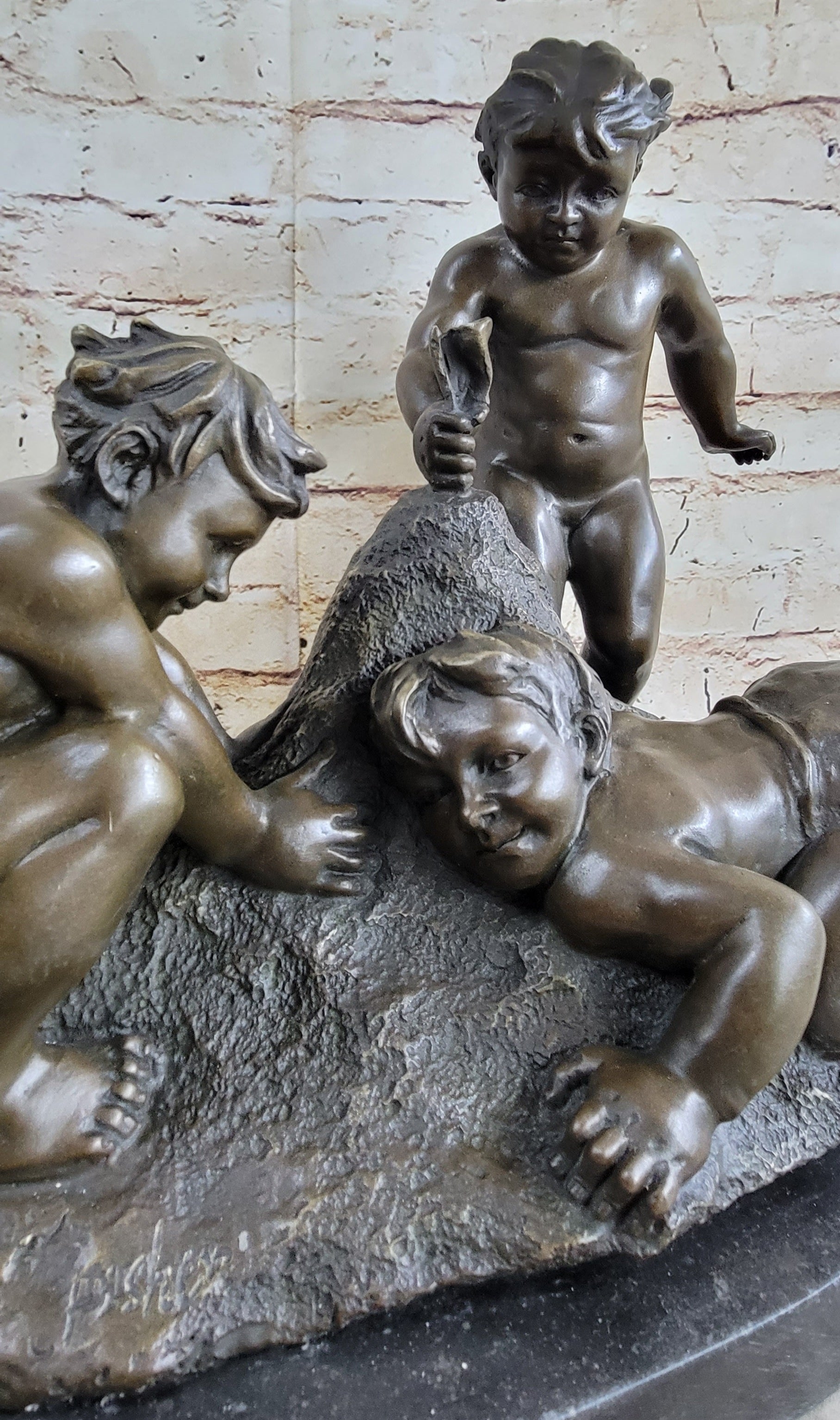 Signed by the artist Fisher, this sculpture not only serves as a beautiful decorative piece but also as a poignant symbol of the joys of childhood and the bonds of friendship. Whether displayed in a home, office, or public space, it is sure to captivate viewers of all ages, evoking memories of carefree days spent in the company of friends and the simple pleasures of youthful imagination.Bronze Dimensions with Marble Base: Height 13" X Width 14"