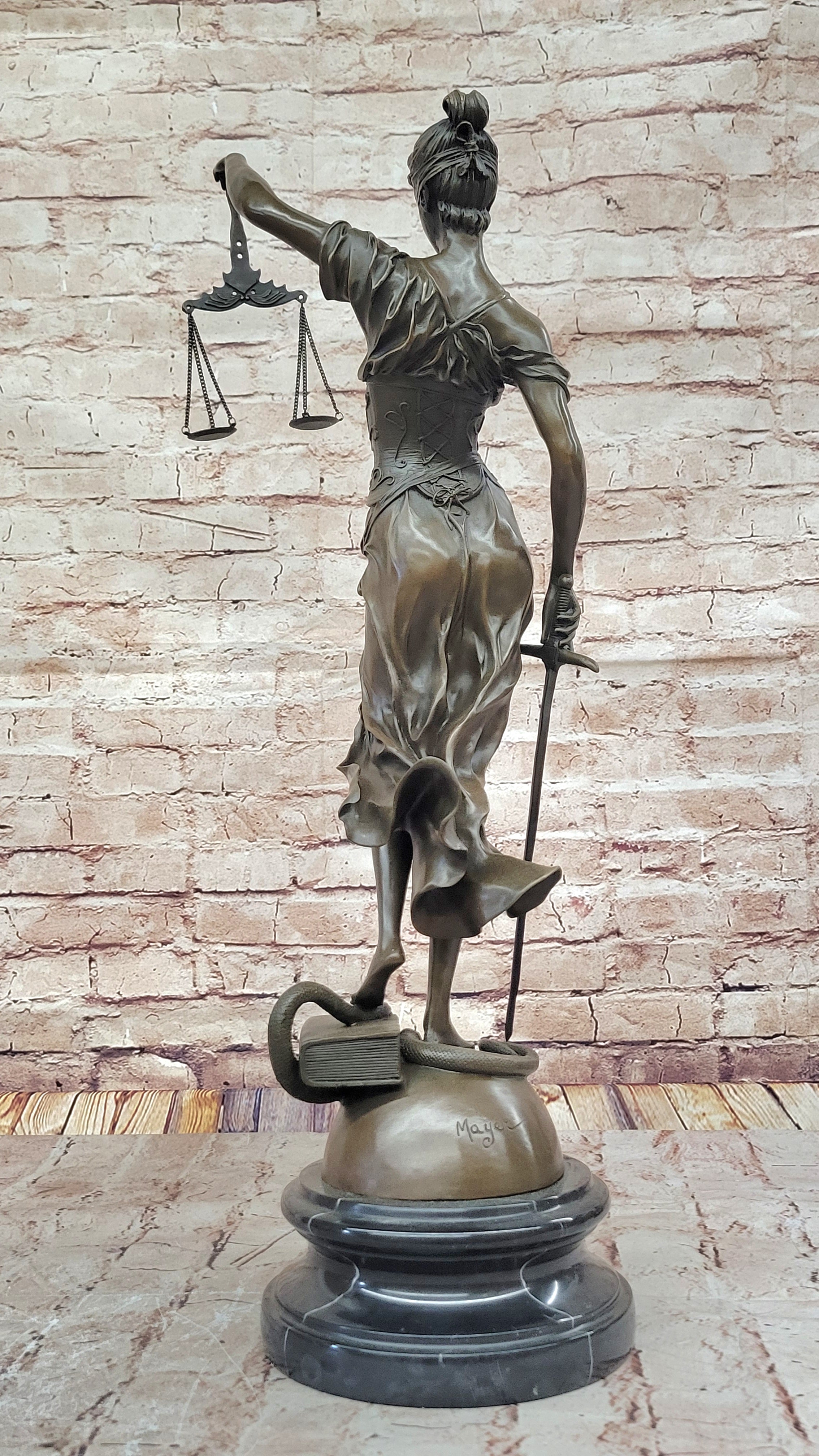 This bronze sculpture portrays Lady Justice, the symbolic embodiment of moral force in judicial systems, representing truth, fairness, and objectivity. The blindfolded figure is seen balancing scales in her left hand, wielding a sword, and standing on a book with a snake coiling around her feet. The scales symbolize the weighing of support and opposition in a case, while the blindfold represents the impartiality and objectivity of justice. The sword signifies the power of reason, and the book represents history, standing against wrongdoings or supporting past virtues. The snake symbolizes hatred, with Lady Justice's foot preventing it from gaining a foothold. Crafted using the lost-wax casting method, the sculpture features a brown patina finish and is mounted on a black marble base, bearing the signature Mayer.