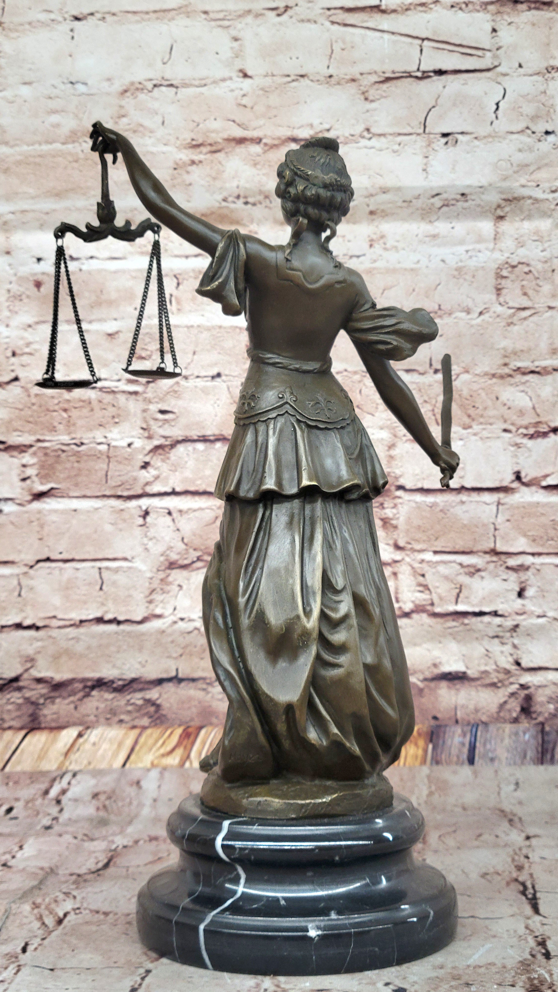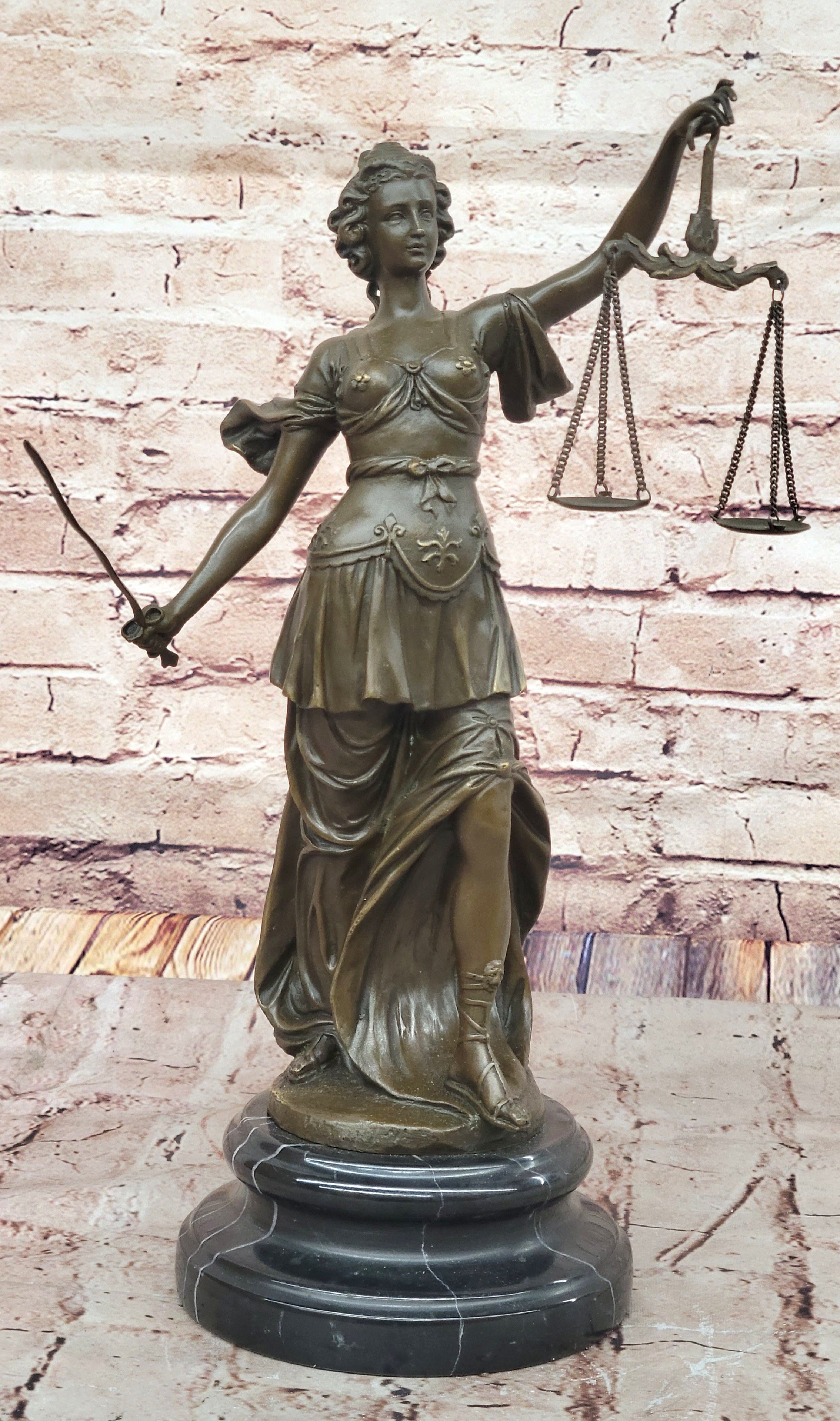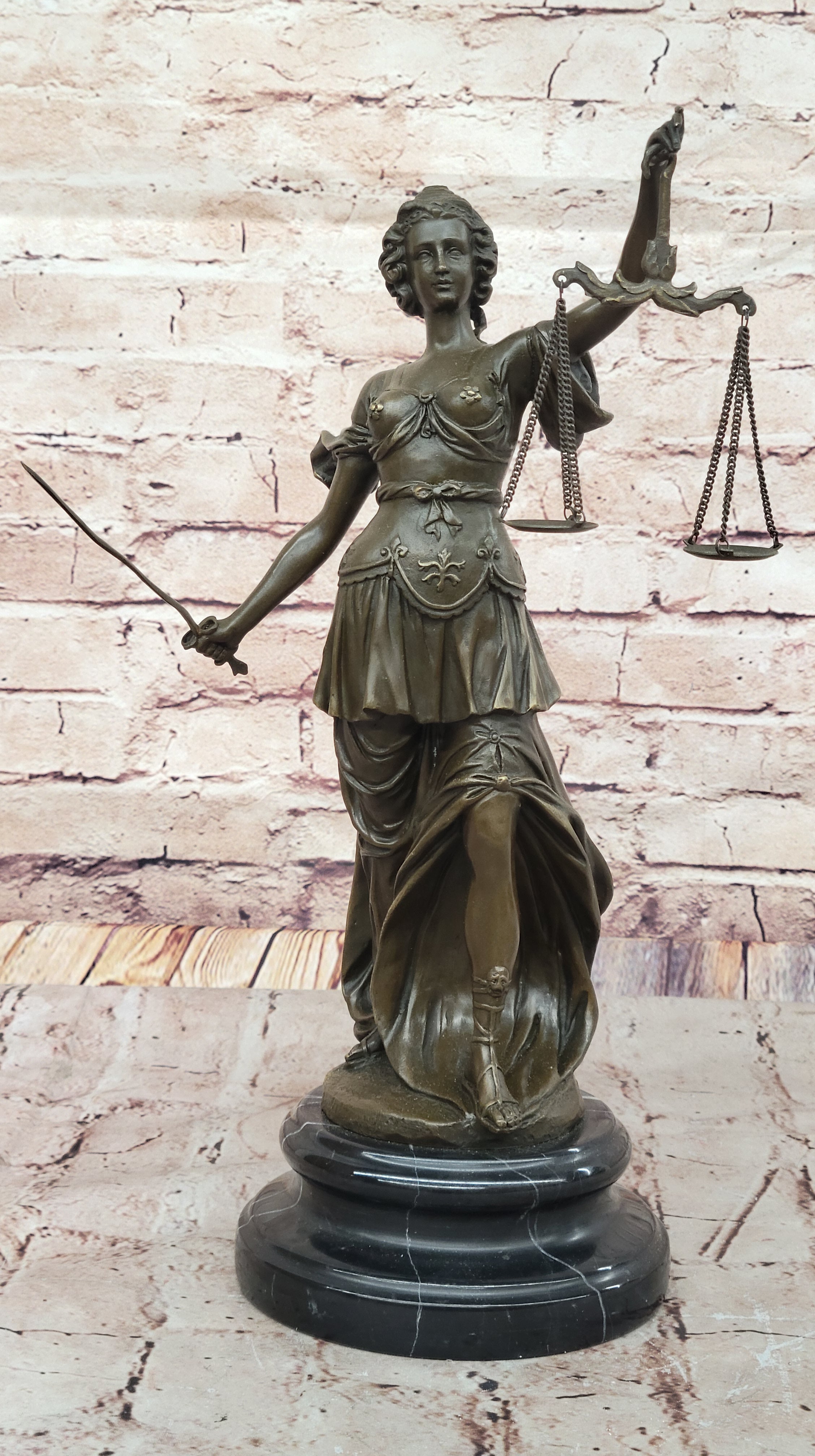 This impressive bronze sculpture captures Lady Justice, the Roman goddess of Justice, in all her symbolic glory. Lady Justice stands tall and proud, holding a sword in her right hand and balancing the scales of truth and fairness with her left. She is also depicted stepping on a book and a snake that coils around her feet. Each of these elements has deep meaning in the justice system, with the scales representing impartiality, the sword representing the power of reason and justice, the book representing history, and the snake symbolizing hatred.