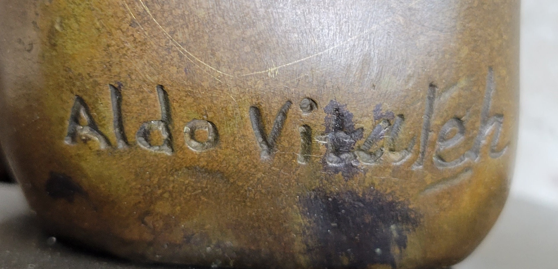 The sculpture stands on a sleek black marble base, providing a sturdy and elegant foundation. Signed by the artist Aldo Vitaleh, this piece is a testament to his skill and creativity, making it a striking addition to any art collection or display space.Bronze Dimensions with Marble Base: Height 18" X Width 10"