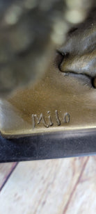 Every aspect of this sculpture is carefully handcrafted using the renowned lost wax method. While each sculpture may have slight variations, this only adds to its uniqueness and charm. The black marble base, being a natural material, ensures that no two pieces are exactly alike. This extraordinary artwork brings a lifetime of pleasure and serves as a testament to the skill and creativity of the renowned artist, Milo.