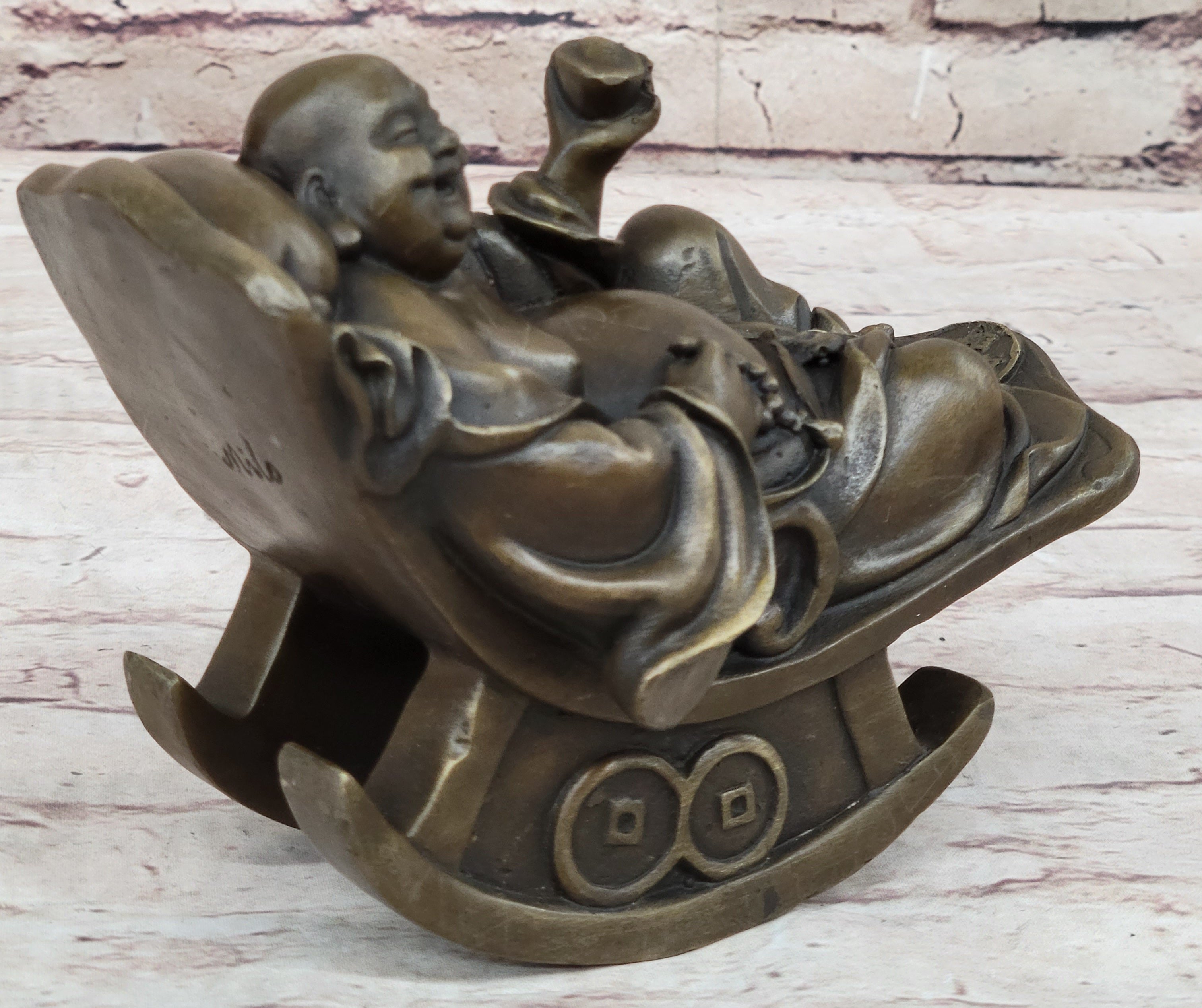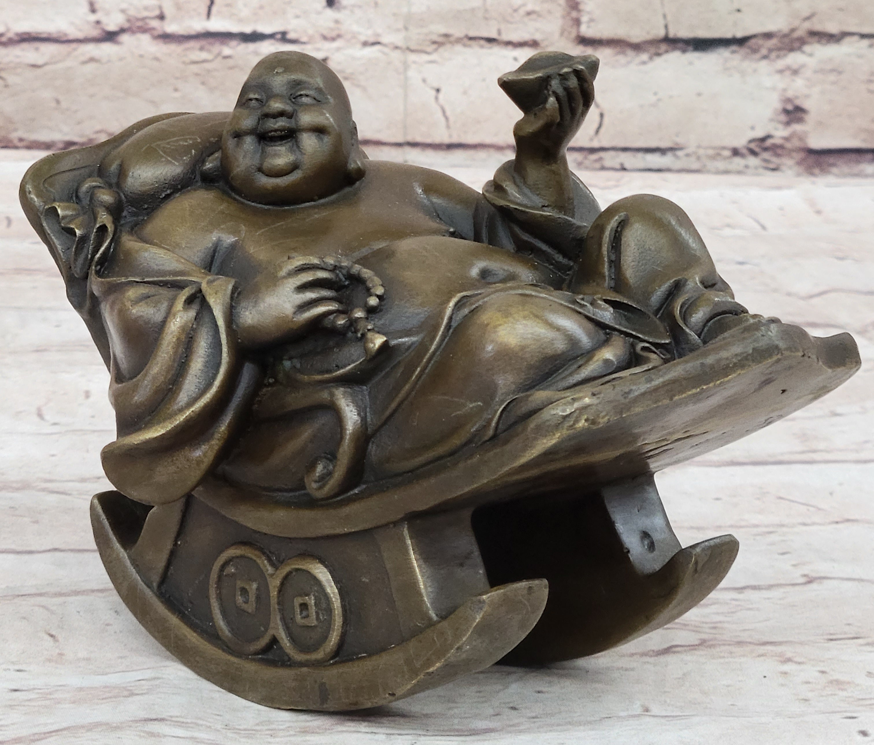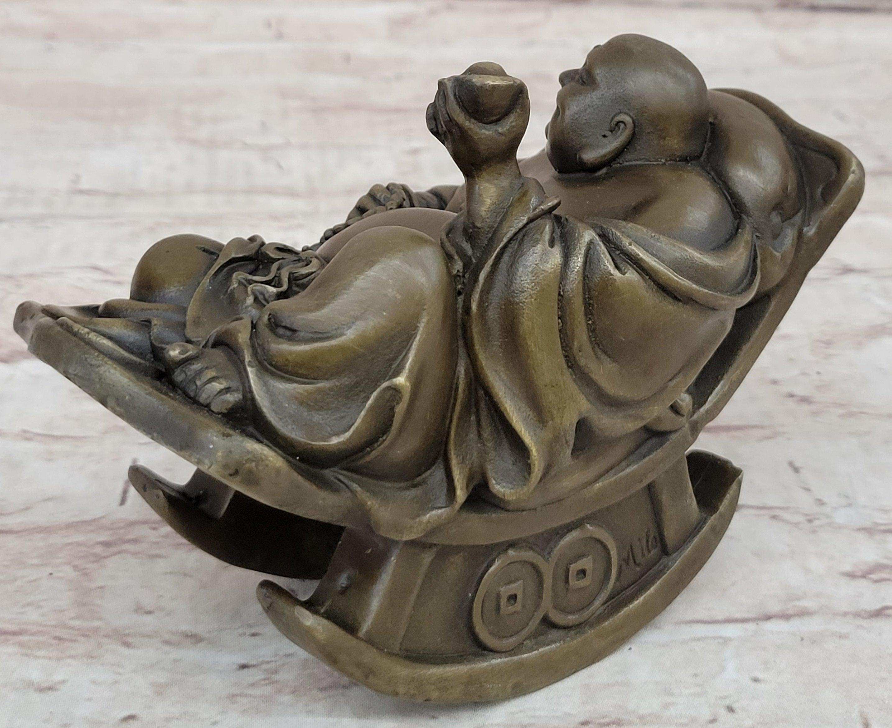 Laughing Buddha on Rocking Chair Bronze Figurine Statue Sculpture Original Art