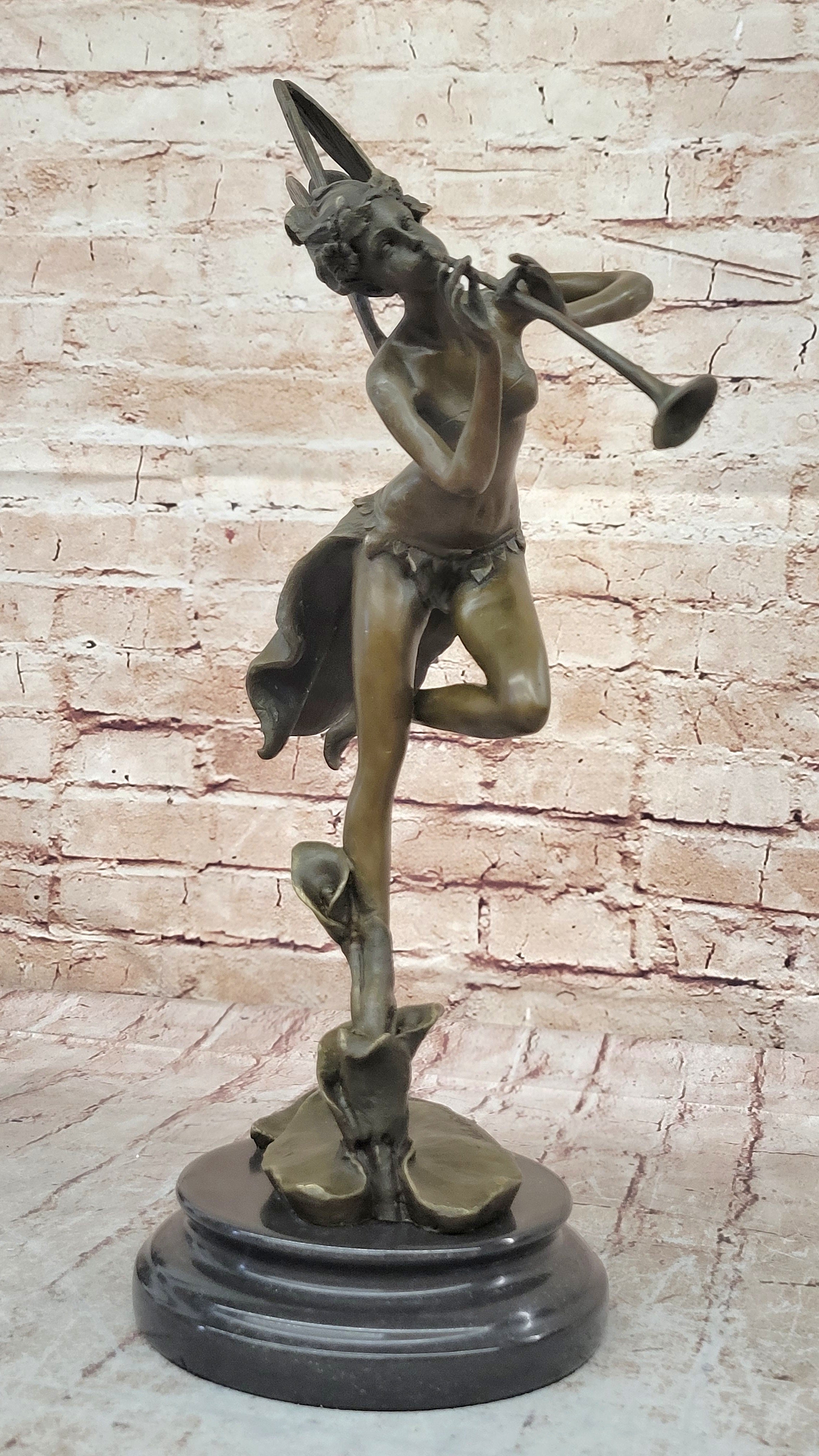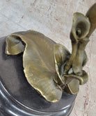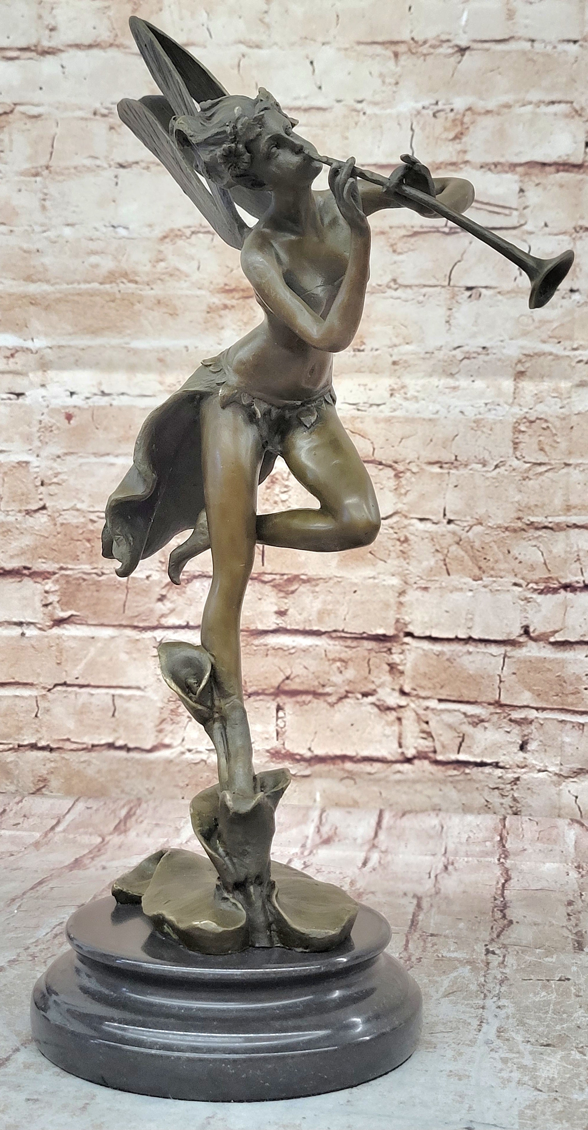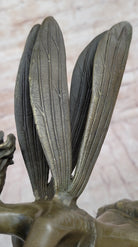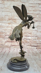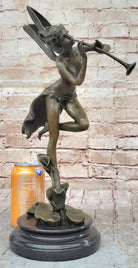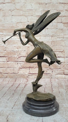 Trumpeting Winged Angel Fairy Garden Statue Bronze Sculpture Signed Art 15" x 10"