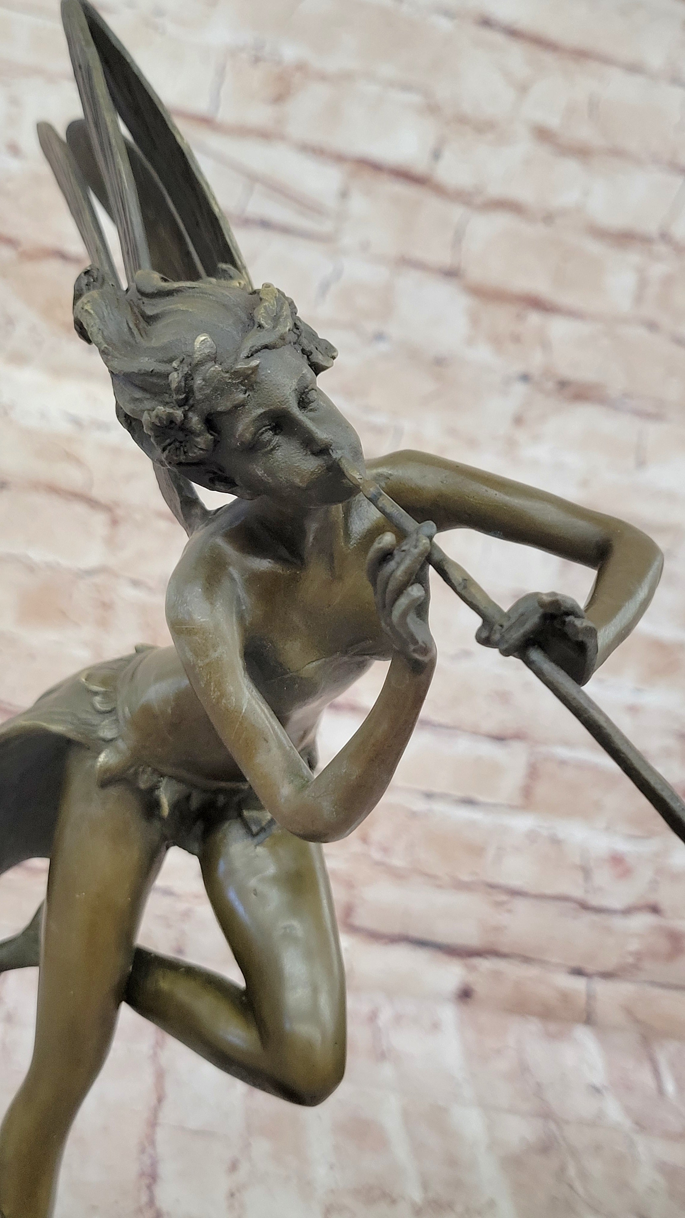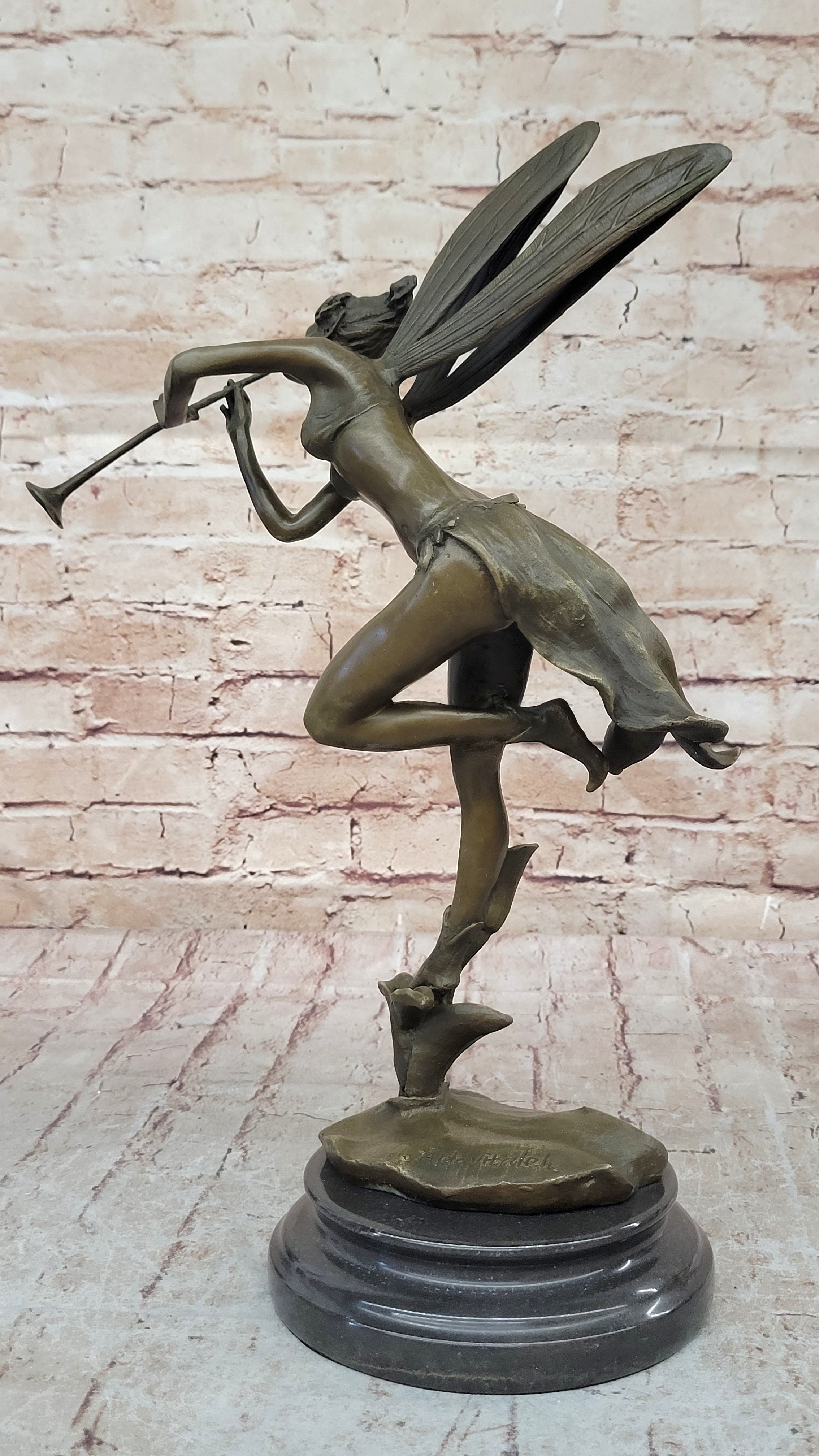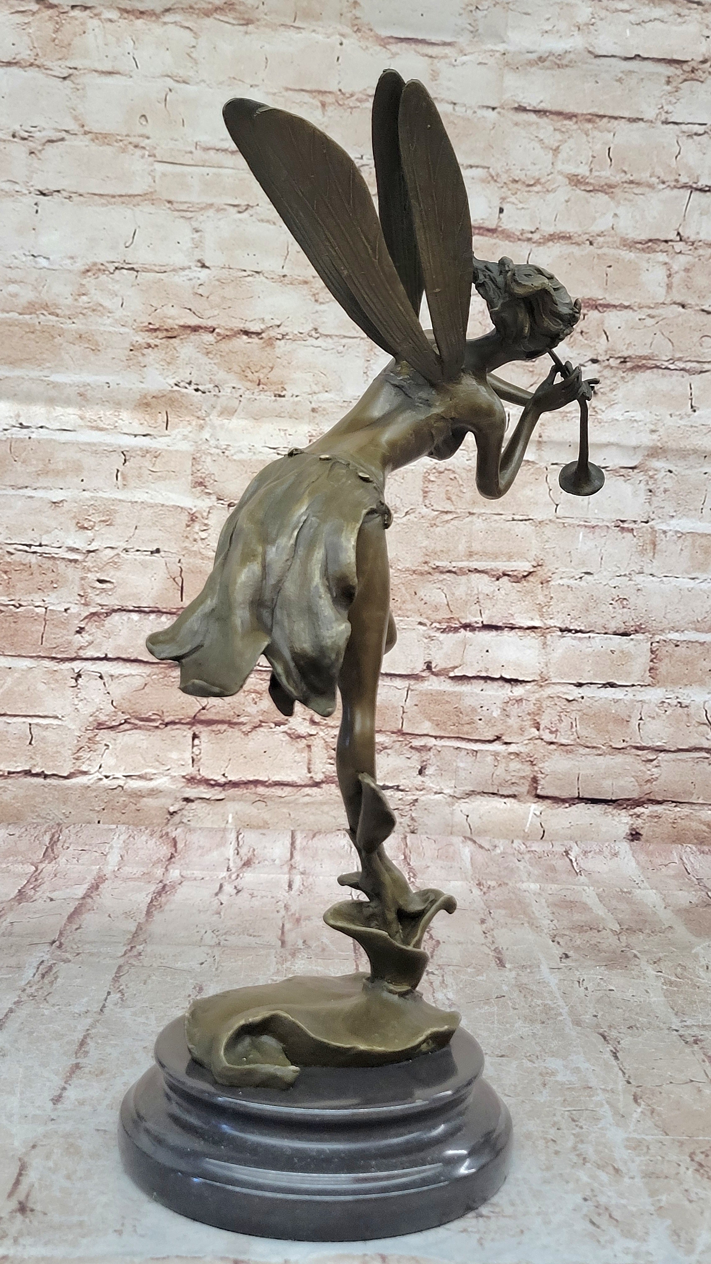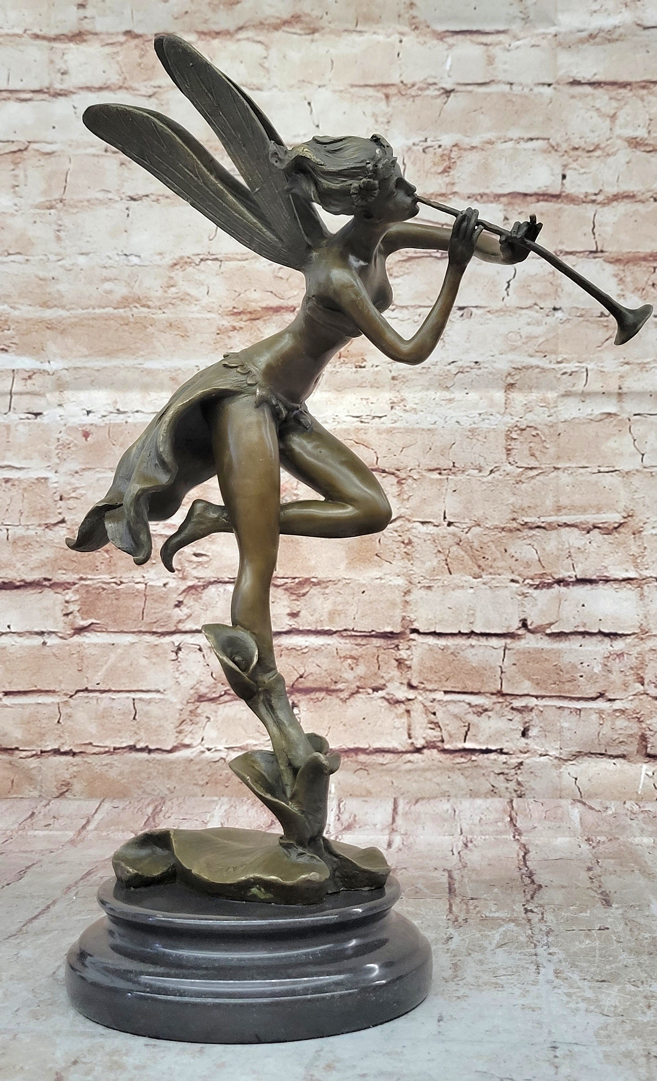 Expertly crafted using the revered "lost wax method," this sculpture captures the ethereal essence of the fairy's noble mission. The intricate details of her robe, the delicate lines of her wings, and the poised stance she embodies are all immortalized in the timeless medium of bronze. The captivating brown patina finish adds a sense of depth and antiquity, enhancing the sculpture's allure and making it a true testament to the artist's skill.