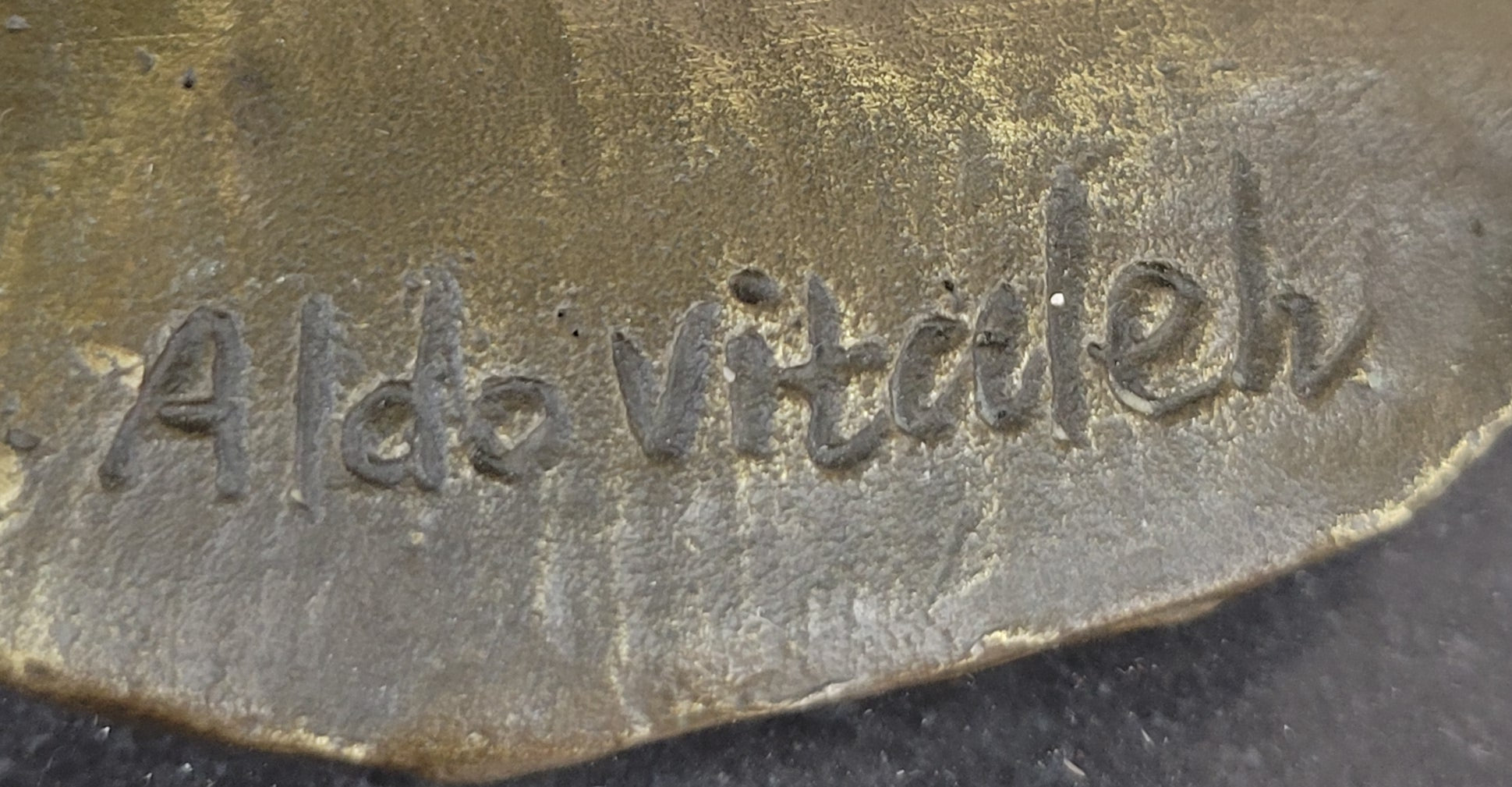 Elevating her significance, the sculpture is elegantly mounted on a black marble base, allowing her to stand as a steadfast protector amidst the earthly realm. The artist's signature, Aldo Vitaleh, is a mark of authenticity and excellence, affirming the sculpture's status as a genuine work of art. This enchanting bronze masterpiece not only embodies the spirit of divine intervention but also serves as a stunning testament to the beauty and power of art to transcend the ordinary.Bronze Dimensions with Marble Base: Height 15" X Width 10"
