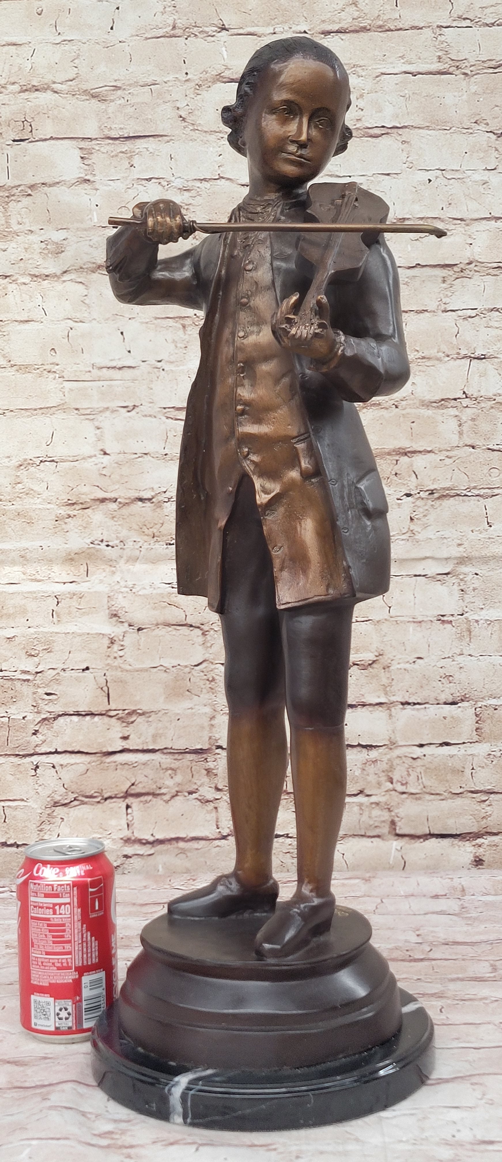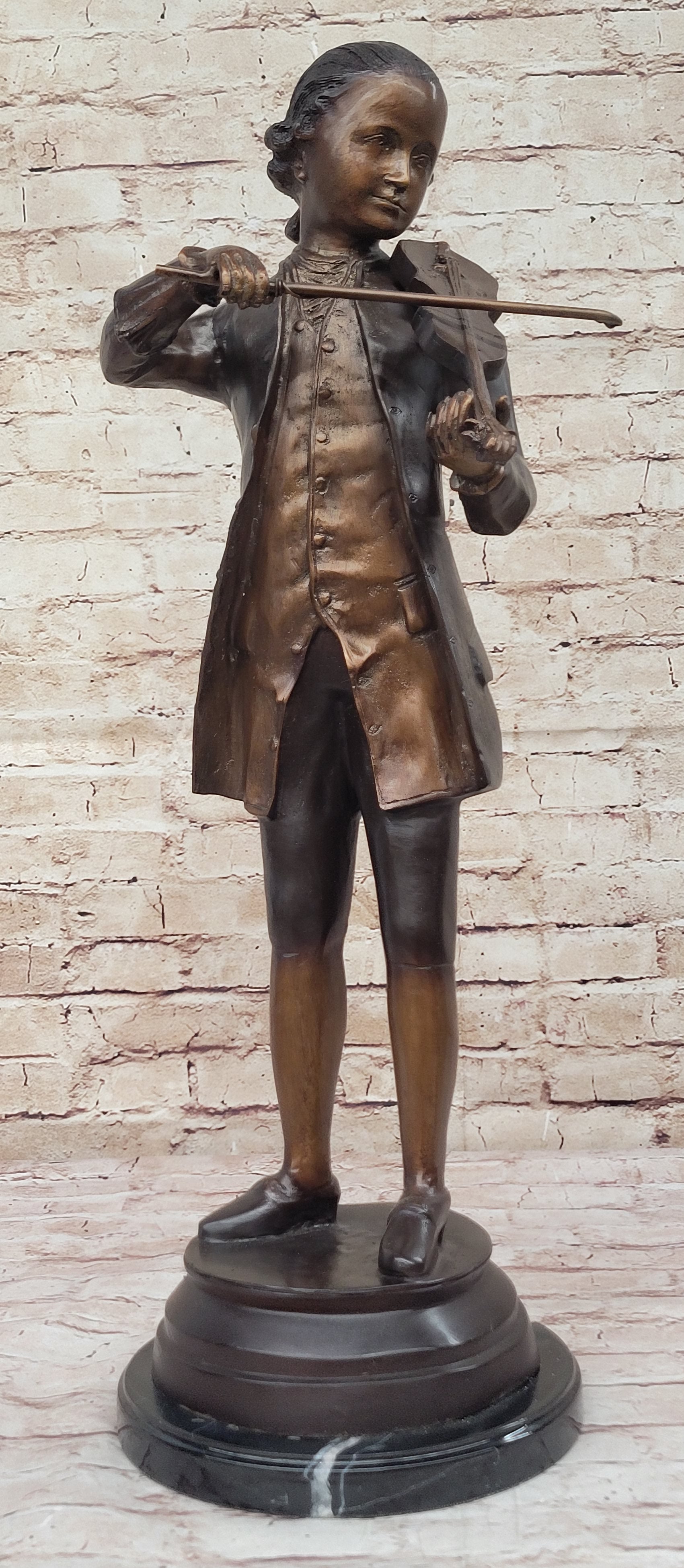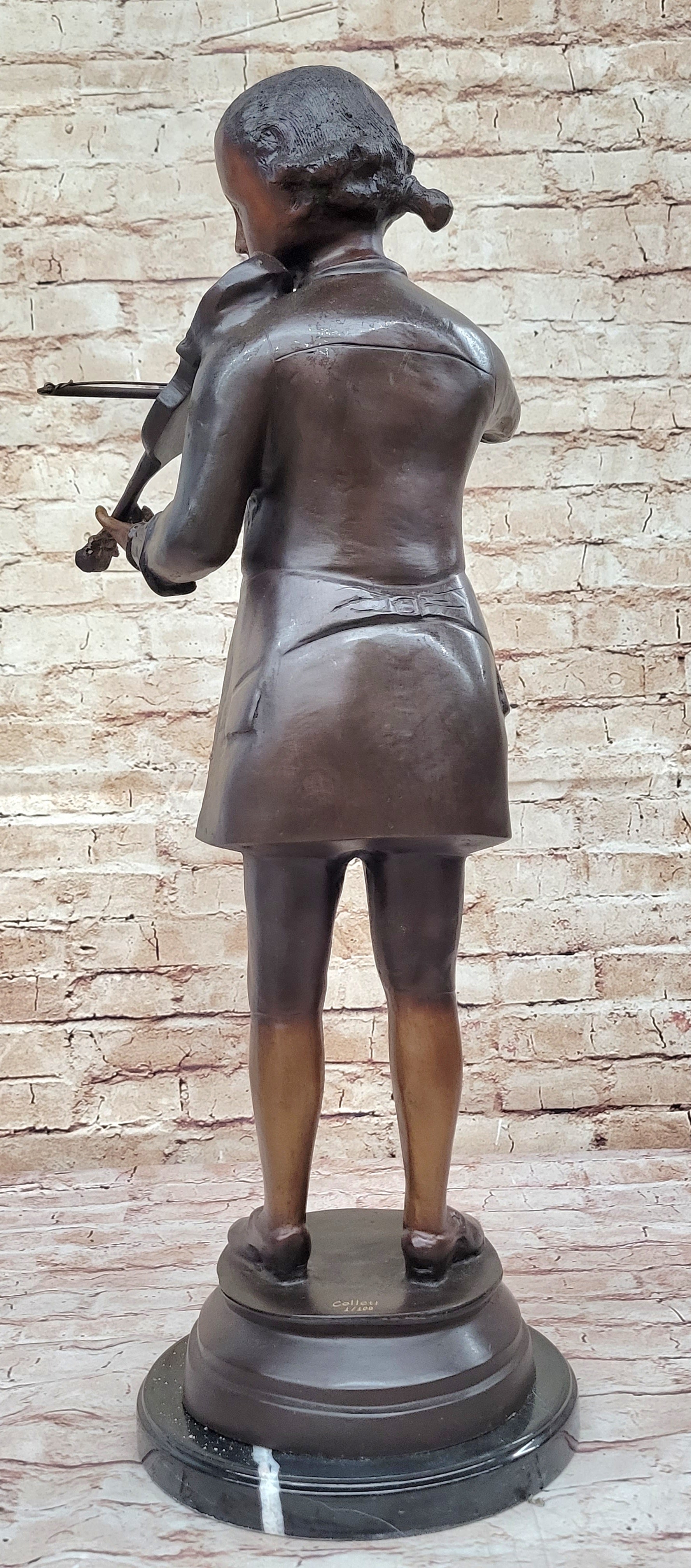 Indulge in the timeless elegance of the Limited Edition "Mozart with Violin" Bronze Sculpture, masterfully created by the renowned artist Collett. This exquisite piece is a celebration of classical music, capturing the essence of Mozart's passion and genius. The sculpture showcases intricate details, from the delicate features of the violin to the expressive contours of the renowned composer, all meticulously handcrafted using the lost wax method. Each sculpture is signed and numbered by the artist, adding an exclusive touch to this collector's item. Resting gracefully on a sleek black marble base, the sculpture boasts a stunning two-tone brown patina, highlighting the depth and texture of the bronze, making it an extraordinary addition to any art collection or home decor. Embrace the harmonious allure of the "Mozart with Violin" Bronze Sculpture, a true testament to the artist's dedication to capturing the essence of musical brilliance. With a poised and engaging stance, Mozart is brought to life, exuding an aura of creativity and musical virtuosity. The carefully crafted violin, an extension of his artistic expression, resonates with the dedication and passion that defined the maestro's legacy. This limited edition sculpture, created through the meticulous lost wax method, embodies the timeless legacy of Mozart's compositions, making it an exquisite centerpiece for music enthusiasts and art connoisseurs alike. Elevate your space with the unparalleled artistry of the "Mozart with Violin" Bronze Sculpture, showcasing the creative finesse and meticulous craftsmanship of the esteemed artist Collett. This exquisite piece captures the essence of Mozart's musical genius, with every intricate detail reflecting the grace and sophistication of his timeless compositions. The sculpture, delicately handcrafted using the lost wax method, features a captivating two-color brown patina that highlights the depth and beauty of the bronze. Mounted on a sleek black marble base, this limited edition, signed, and numbered sculpture is a striking tribute to the enduring legacy of one of the world's greatest composers.