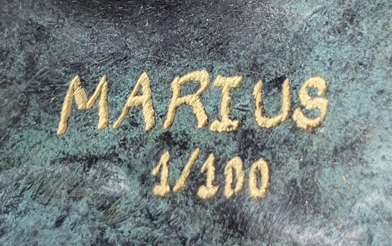 Crafted using the hot cast method, this sculpture exemplifies the artist's dedication to precision and artistry. The intricate process of hot casting allows for the intricate details of the deer and the rocky base to be faithfully reproduced, resulting in a truly remarkable and lifelike representation. The nuanced use of multi-color brown and green patinas, complemented by subtle silver accents, adds depth and character to the sculpture, enhancing its visual appeal and creating a sense of natural beauty. Marius' signature serves as a testament to the craftsmanship and artistry invested in this stunning bronze sculpture, making it a prized addition to any art collection or display.