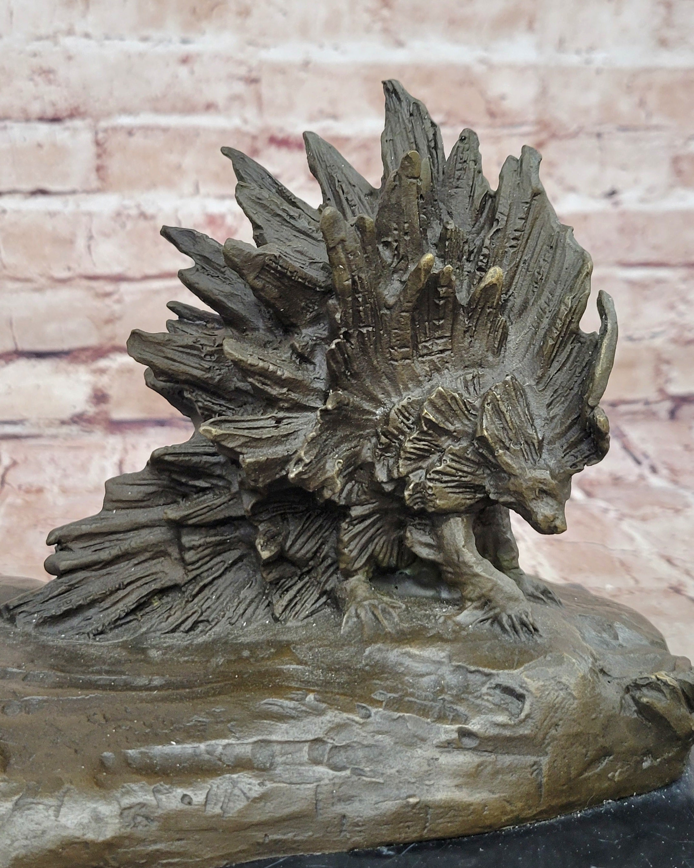Lion vs. Porcupine Bronze Statue Sculpture Wildlife Art Decor on Marble Base