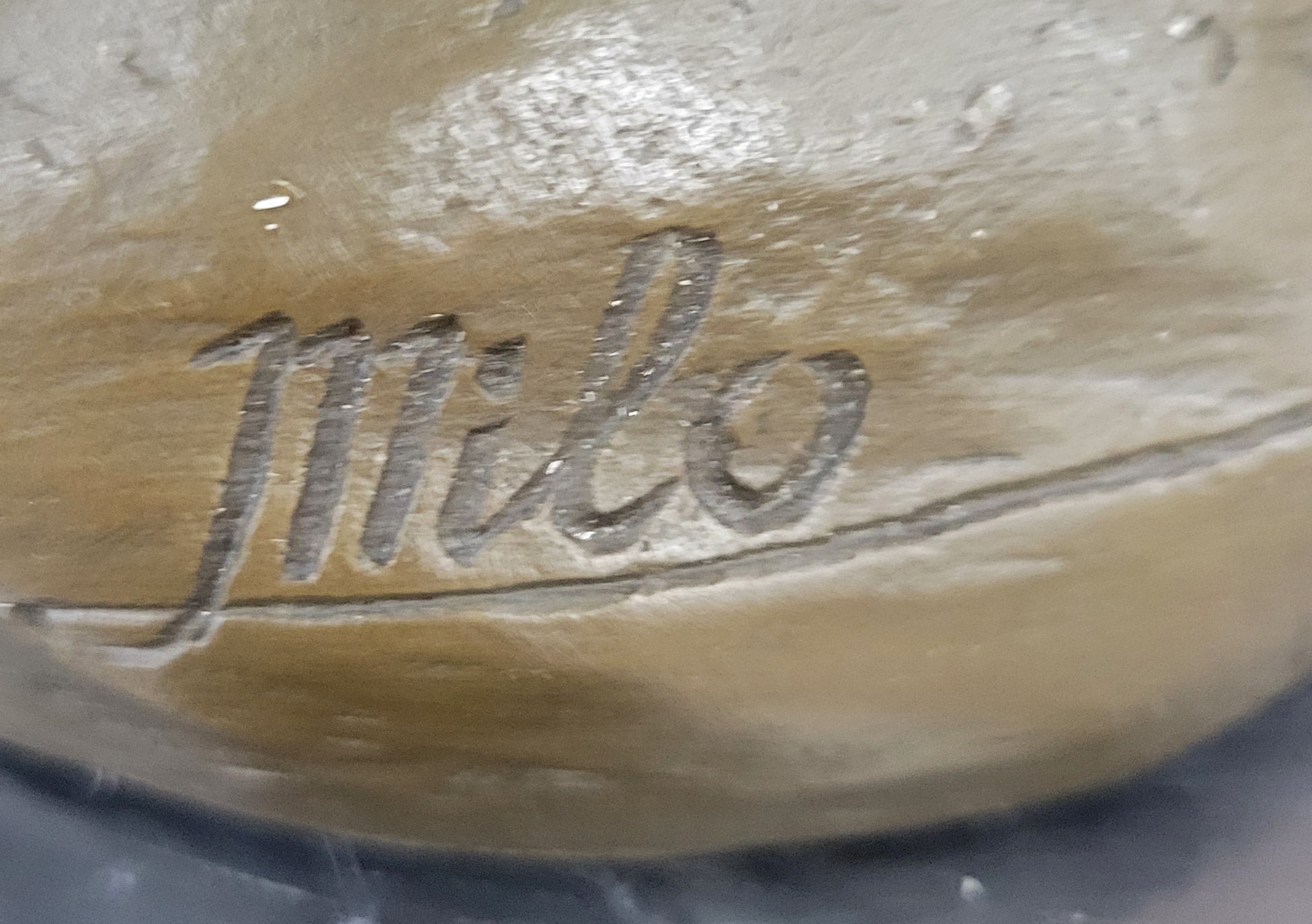 Mounted on a rectangular black marble base, this captivating sculpture commands attention and admiration. It bears the signature of the renowned artist, Milo, ensuring its authenticity and artistic excellence.