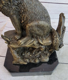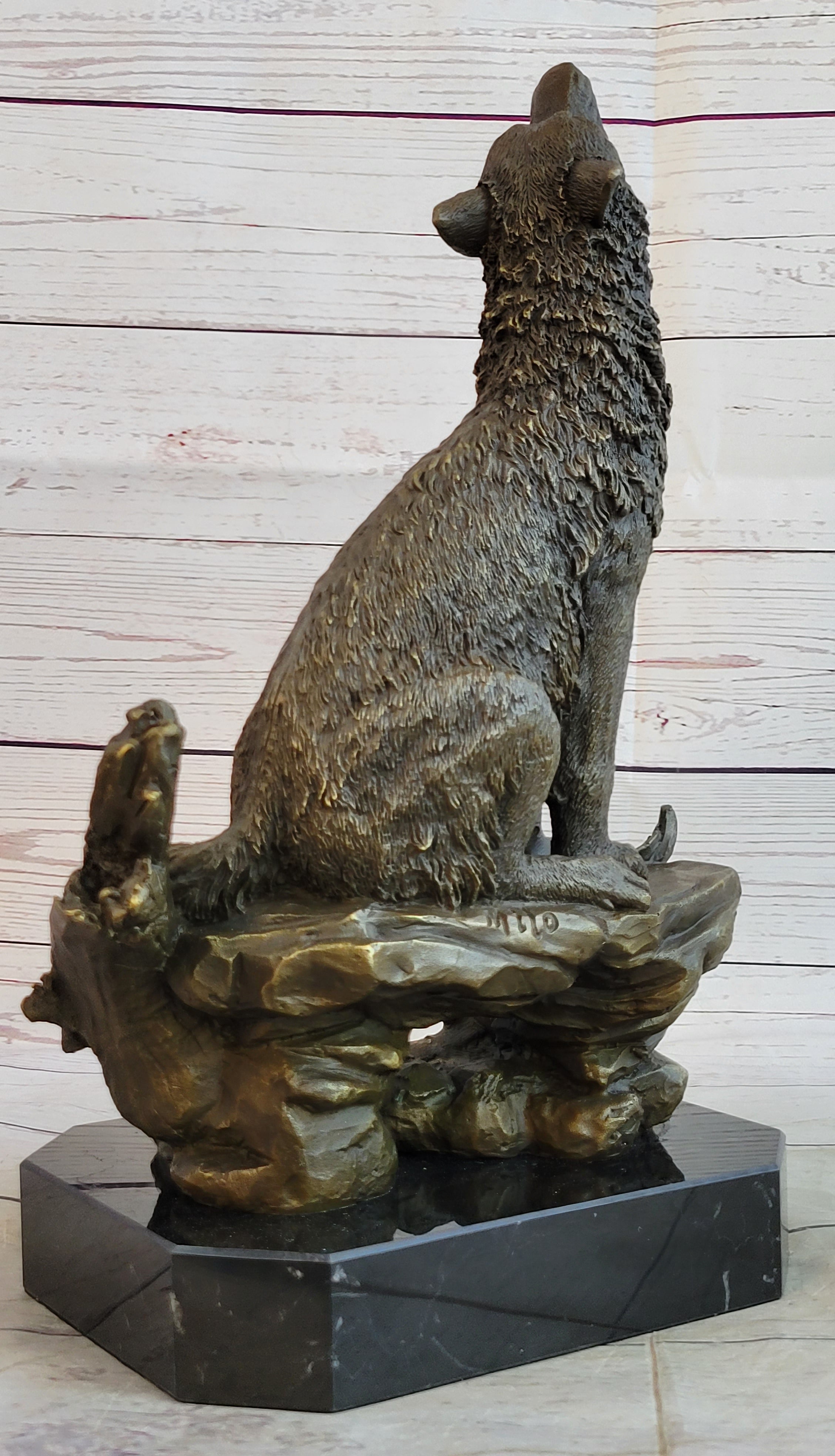 Enhance your home decor with this captivating Large Original Milo Wildlife Wolf on Cliff Bronze Sculpture. This exquisite piece showcases the beauty and power of the wolf, crafted with meticulous attention to detail by renowned artist Milo. The sculpture depicts a wolf standing majestically on a cliff, capturing its wild spirit and untamed nature. With a rich brown patina finish, the sculpture exudes warmth and authenticity, complemented by the elegant black marble base that adds a touch of sophistication.