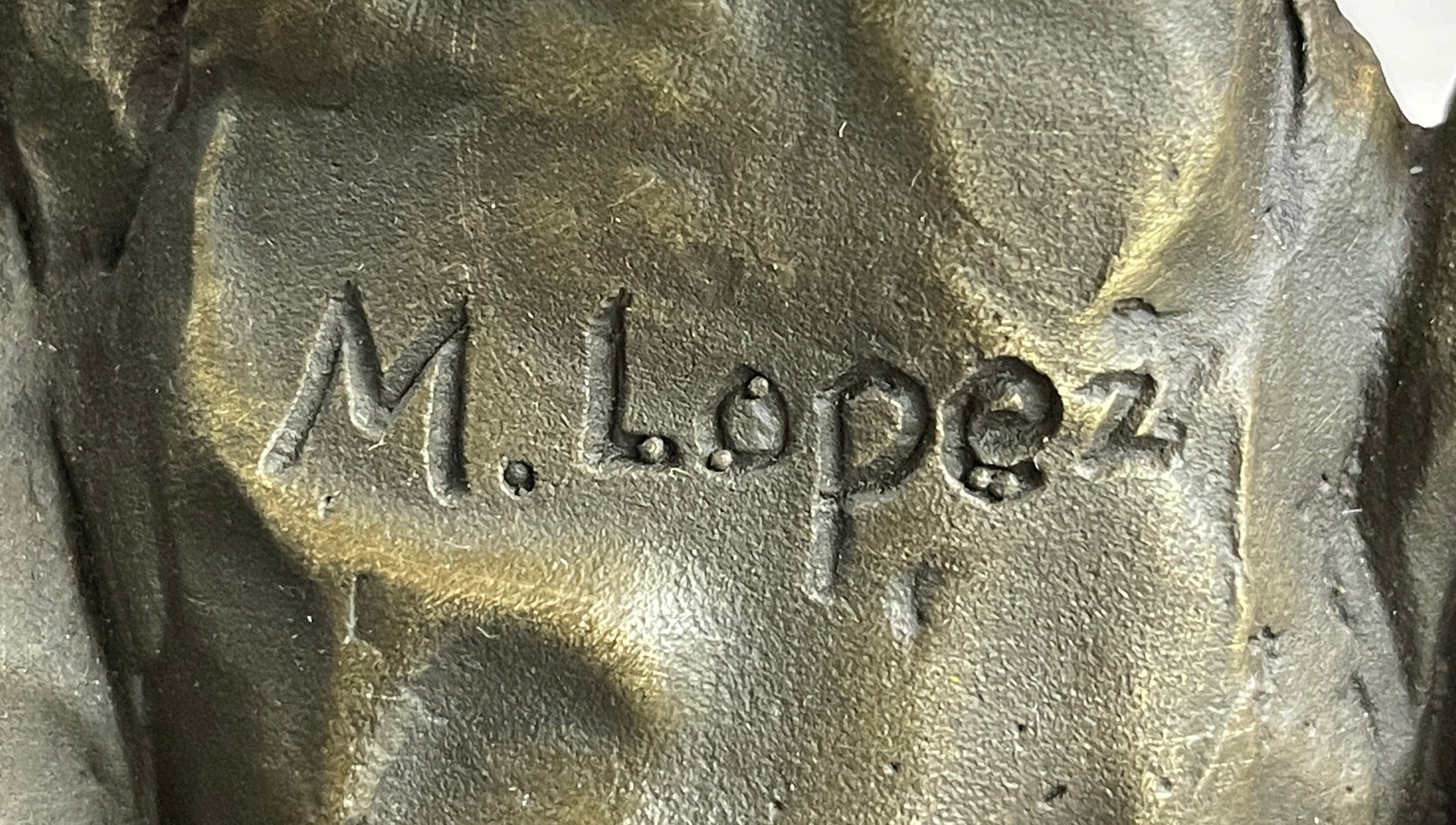 Crafted by skilled artisans, this magnificent bronze sculpture is meticulously shaped using the ancient lost-wax casting technique, ensuring its authenticity and exquisite craftsmanship. The feathers are delicately stained with a brown patina tarnish, lending a captivating touch of realism. Resting majestically on a sleek black marble base, this sculpture stands as a testament to the artist Miguel Lopez's vision and talent, with his signature underscoring its artistic authenticity.