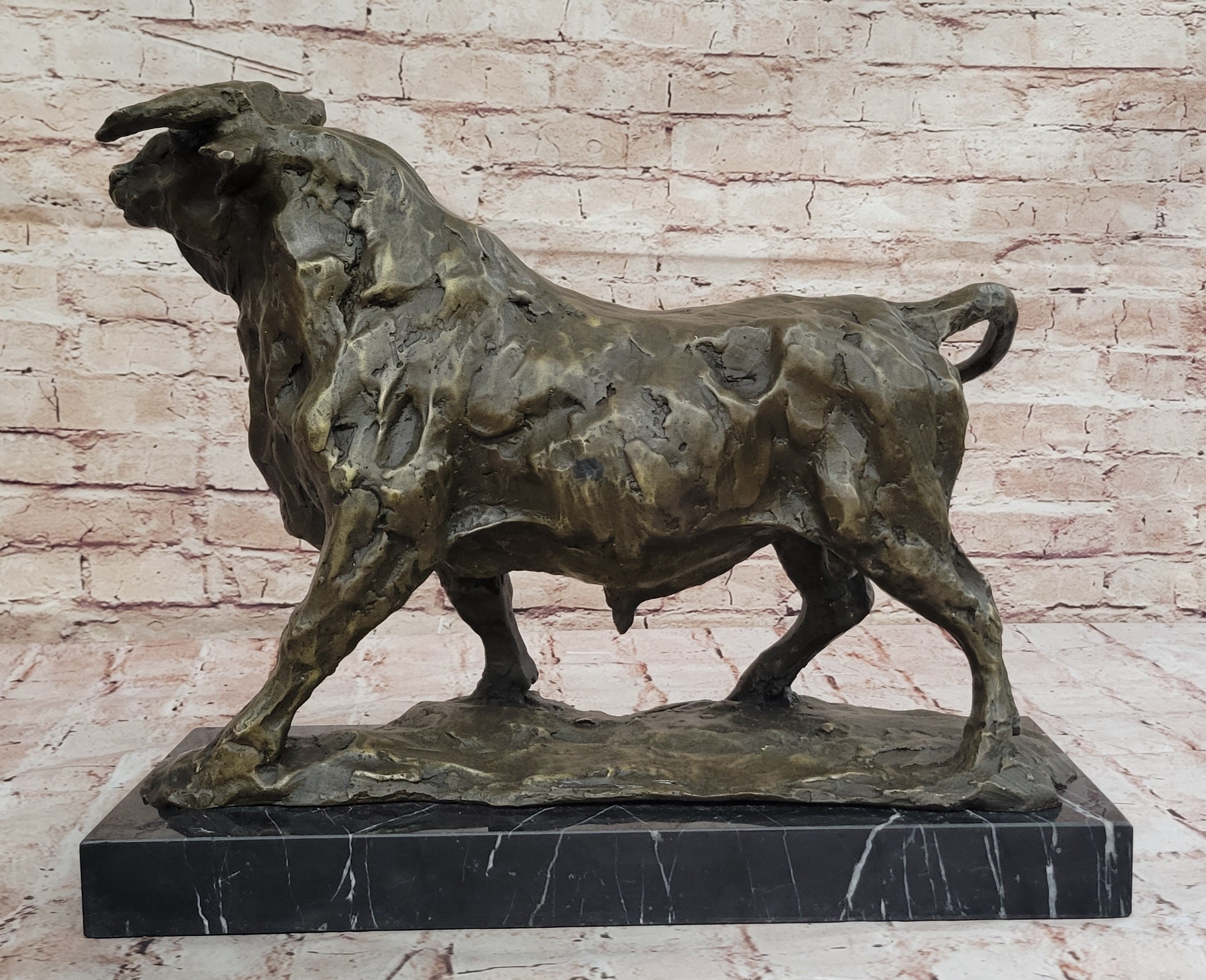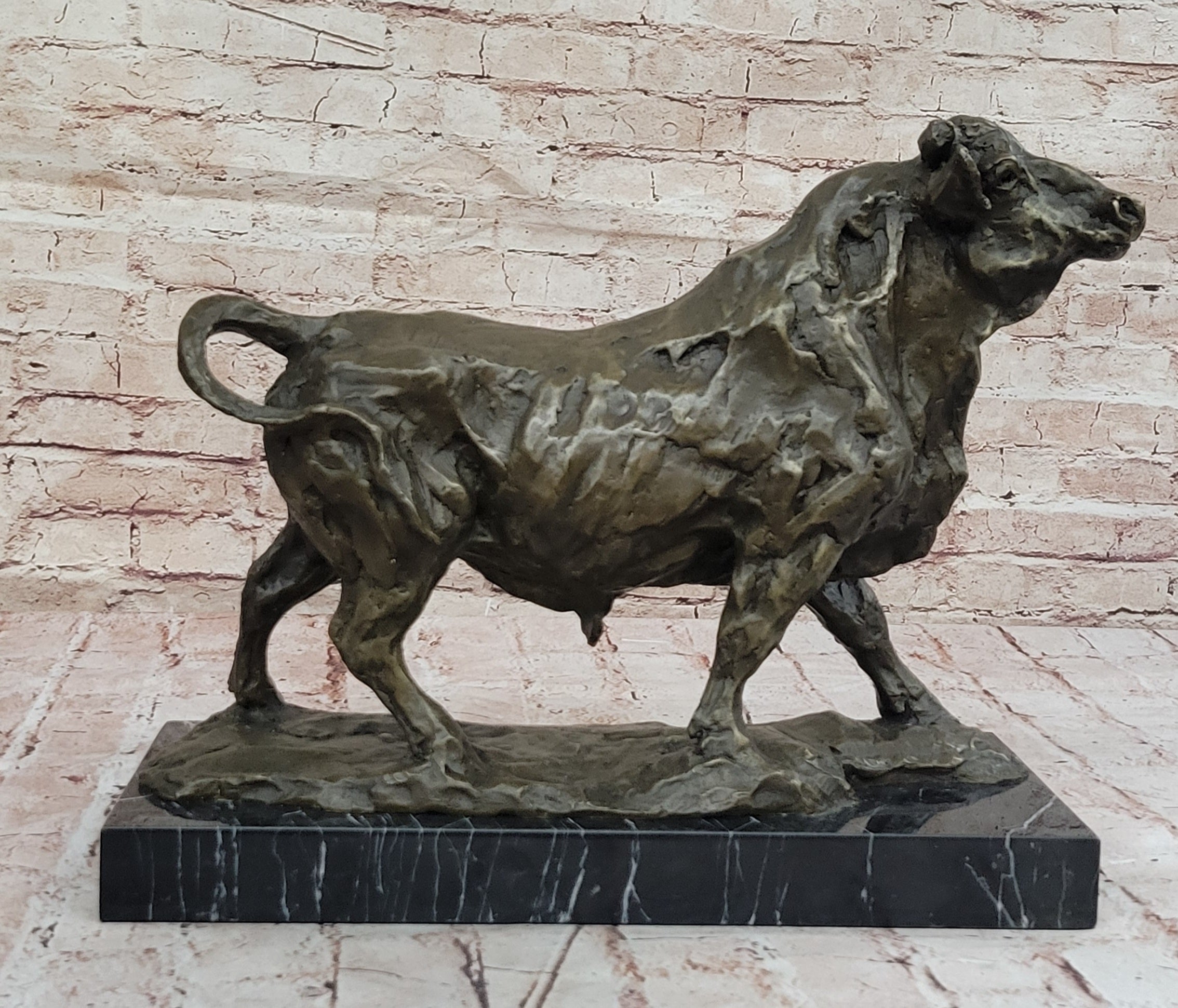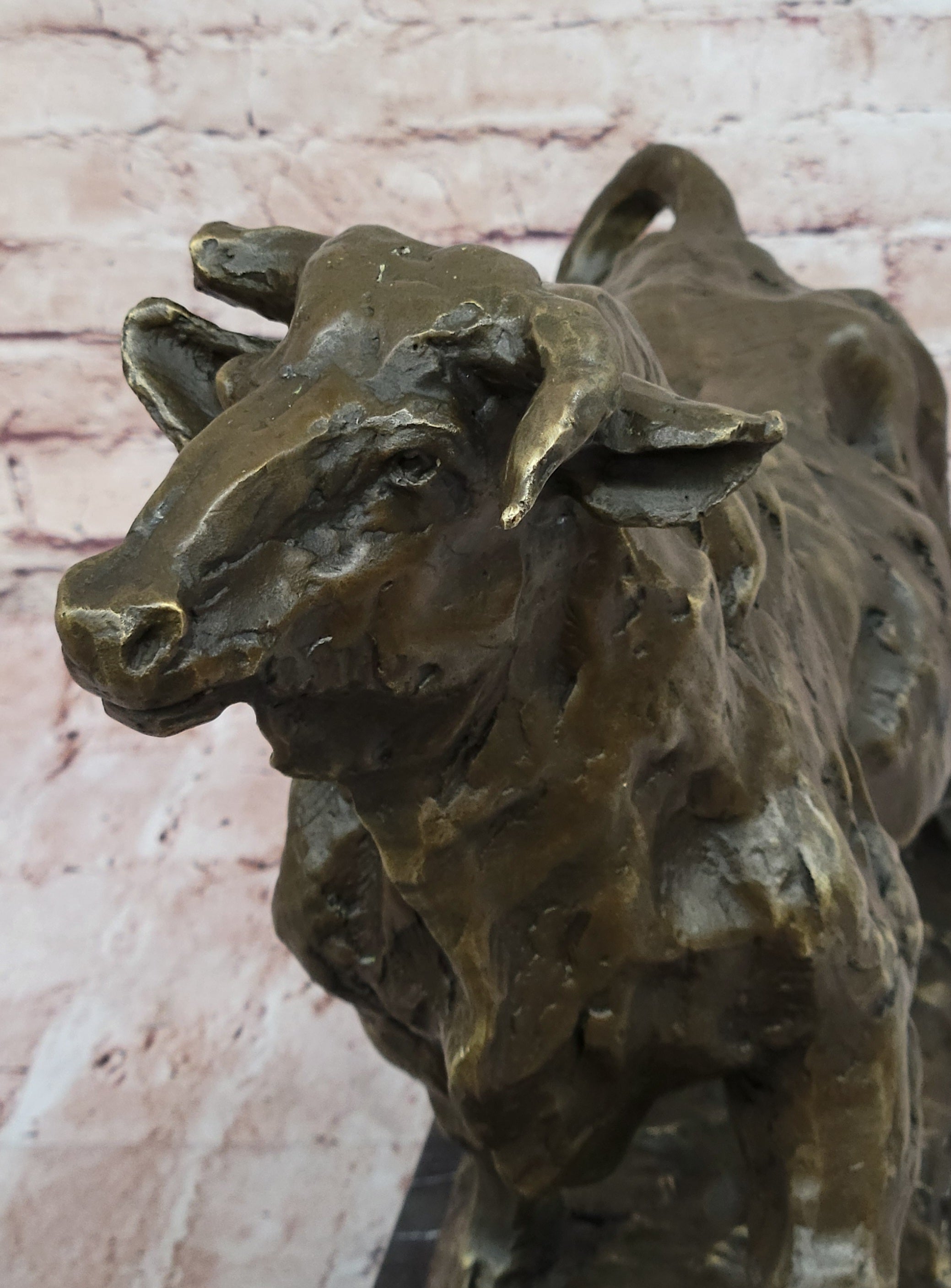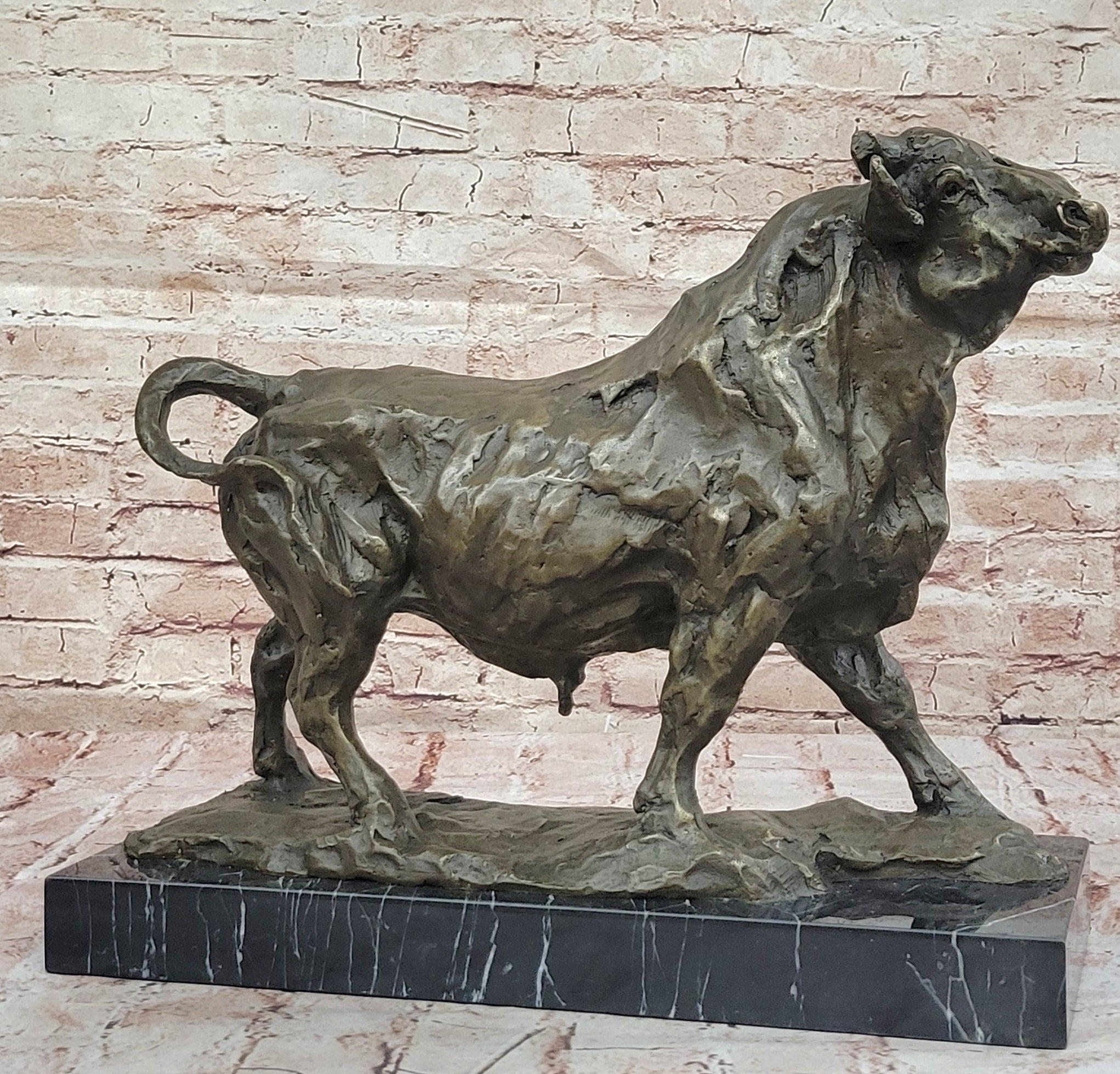 This magnificent bronze sculpture captures the raw power and intensity of a charging bull in action. With his head lowered and nostrils flared, the bull prepares to unleash his strength. His muscles are tensed, and his body vibrates with energy as he stomps the ground in anticipation. Every detail, from the sharpness of his horns to the thick, protective rolls of muscle around his neck, reflects his readiness for battle. He is an embodiment of force and determination, driven by rage, with eyes fixed on his opponent.