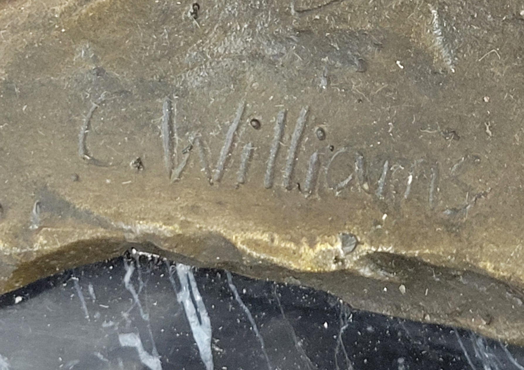 The sculpture rests upon a solid black marble base, providing a sturdy and elegant foundation that enhances its dramatic presence. Signed by artist Williams, this stunning piece is not only a testament to the majesty of the bull but also a fine work of art that will add strength and character to any collection or space. Perfect for lovers of animal sculptures or anyone who appreciates the representation of pure, unbridled power.Bronze Dimensions with Marble Base :Height 14" X Width 17"
