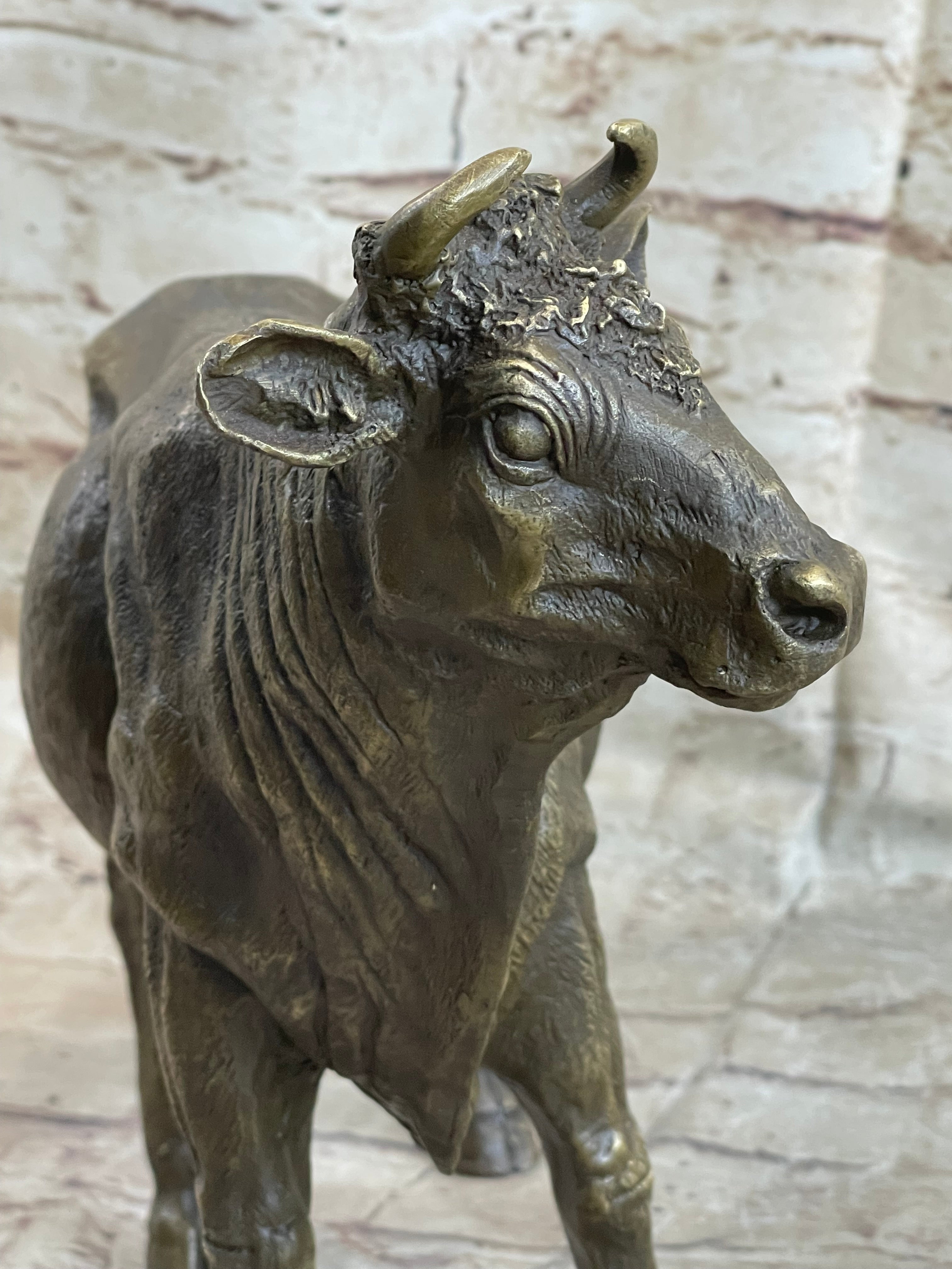 Crafted using the time-honored lost wax method, this bronze masterpiece embodies the essence of the female cattle's natural physicality. Each curve and contour is meticulously sculpted to convey the animal's strength and grace. The signature of the esteemed artist Milo further authenticates the artwork, adding to its value and collectibility.
