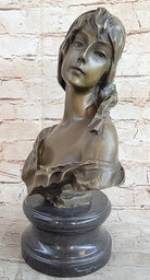 Immerse yourself in the timeless elegance of this breathtaking bronze bust sculpted by the renowned Portuguese artist Miguel Lopez, affectionately known as Milo. This remarkable masterpiece transports you into the world of a contemplative maiden, expertly captured with intricate details and a profound emotional depth.