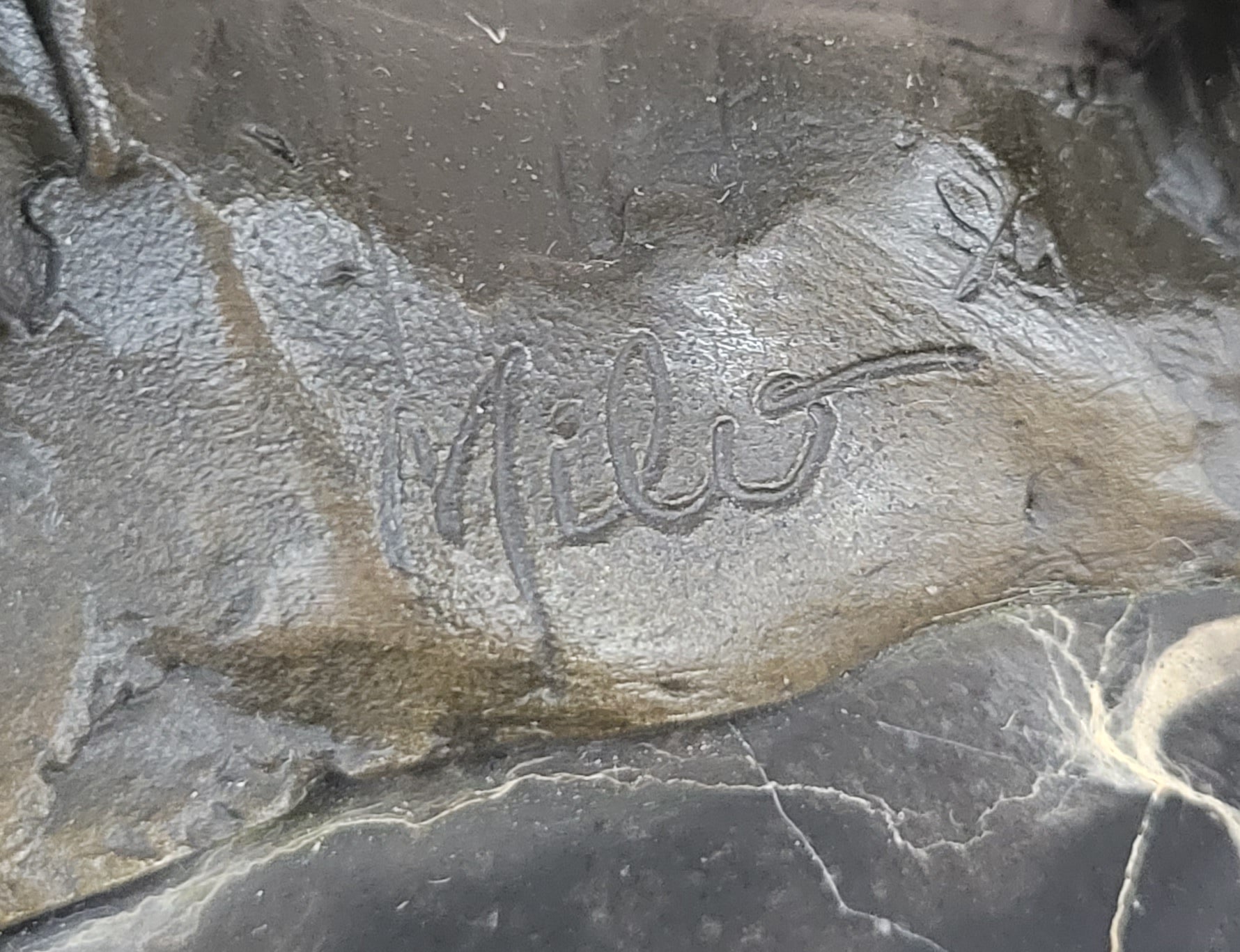 To authenticate its origin and artistic merit, the sculpture is signed by the renowned artist, Milo. His signature not only adds value to the piece but also reflects his artistic vision and mastery. This stunning elephant sculpture is a remarkable addition to any art collection or home decor. It serves as a captivating centerpiece, sparking conversations and evoking a sense of wonder and admiration. Its presence will infuse any space with a touch of grandeur and a reminder of the inherent beauty found in nature. A true masterpiece, it promises to mesmerize and inspire all who behold it, making it an exquisite addition to any art collection or home decor.Bronze Dimensions with Marble Base: Height 9" X Width 8"