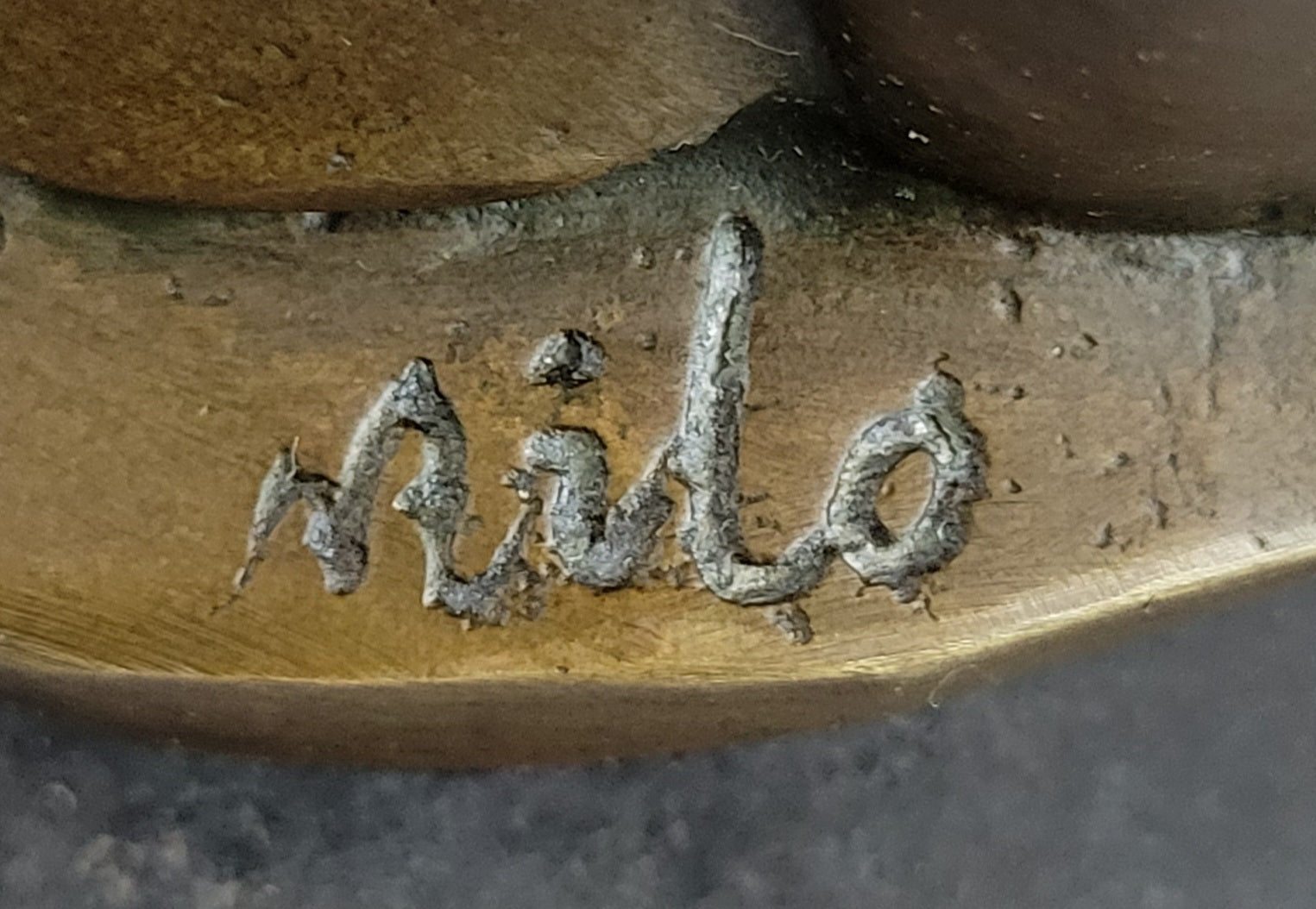 The sculpture's portrayal of the husband's gentle kiss on his wife's head serves as a poignant tribute to the shared journey of their marriage, while the presence of their sleeping newborn child symbolizes the embodiment of their enduring love and the continuation of their legacy. The rich brown patina finish adds a touch of timeless elegance and sophistication to the piece, enhancing the nuanced details of the couple's expressions and gestures. Mounted on a sleek black marble base and bearing the signature of the esteemed artist Milo, the sculpture stands as a testament to the enduring power of love and the profound joy found in the union of marriage and family.