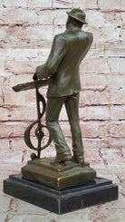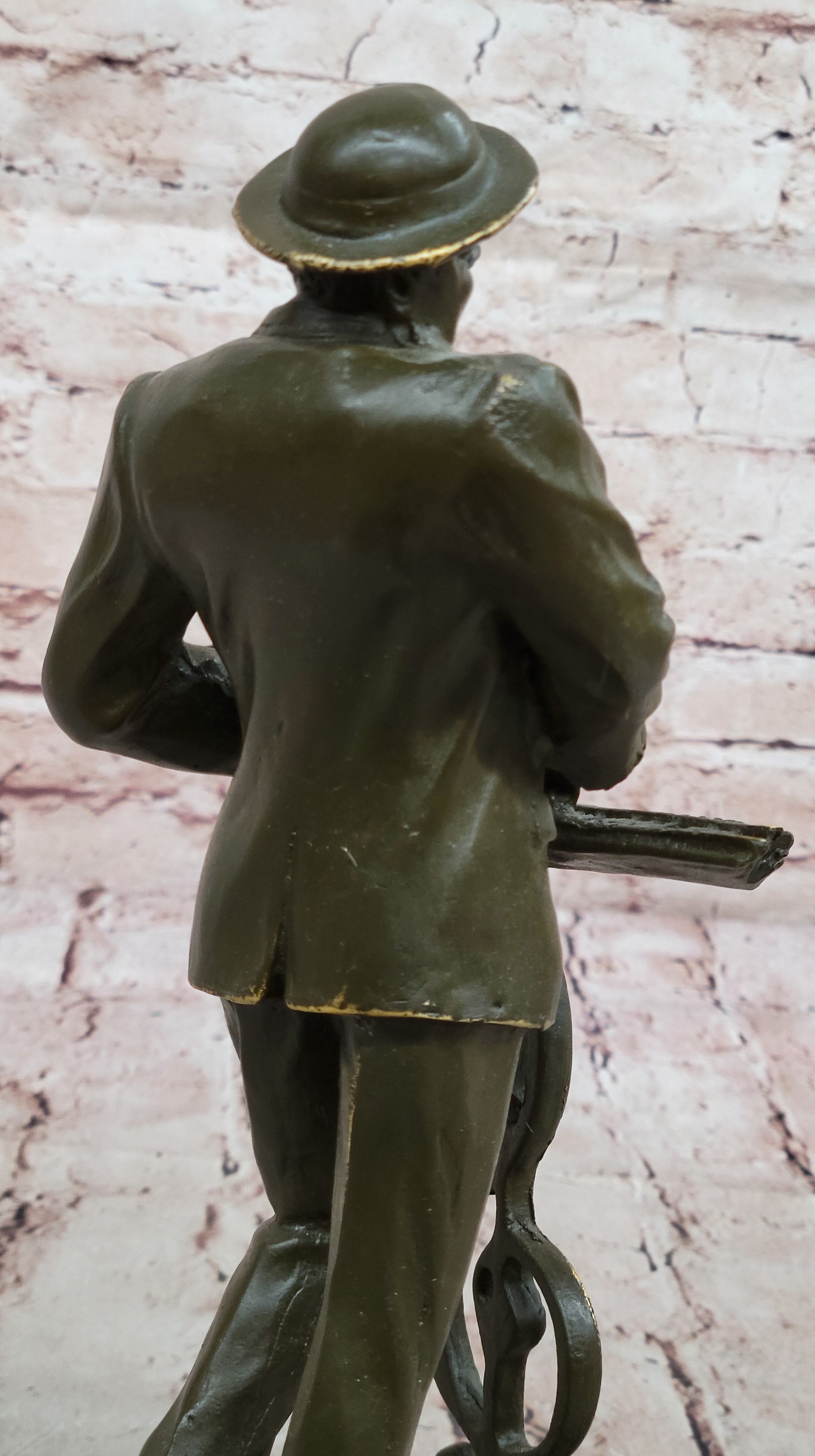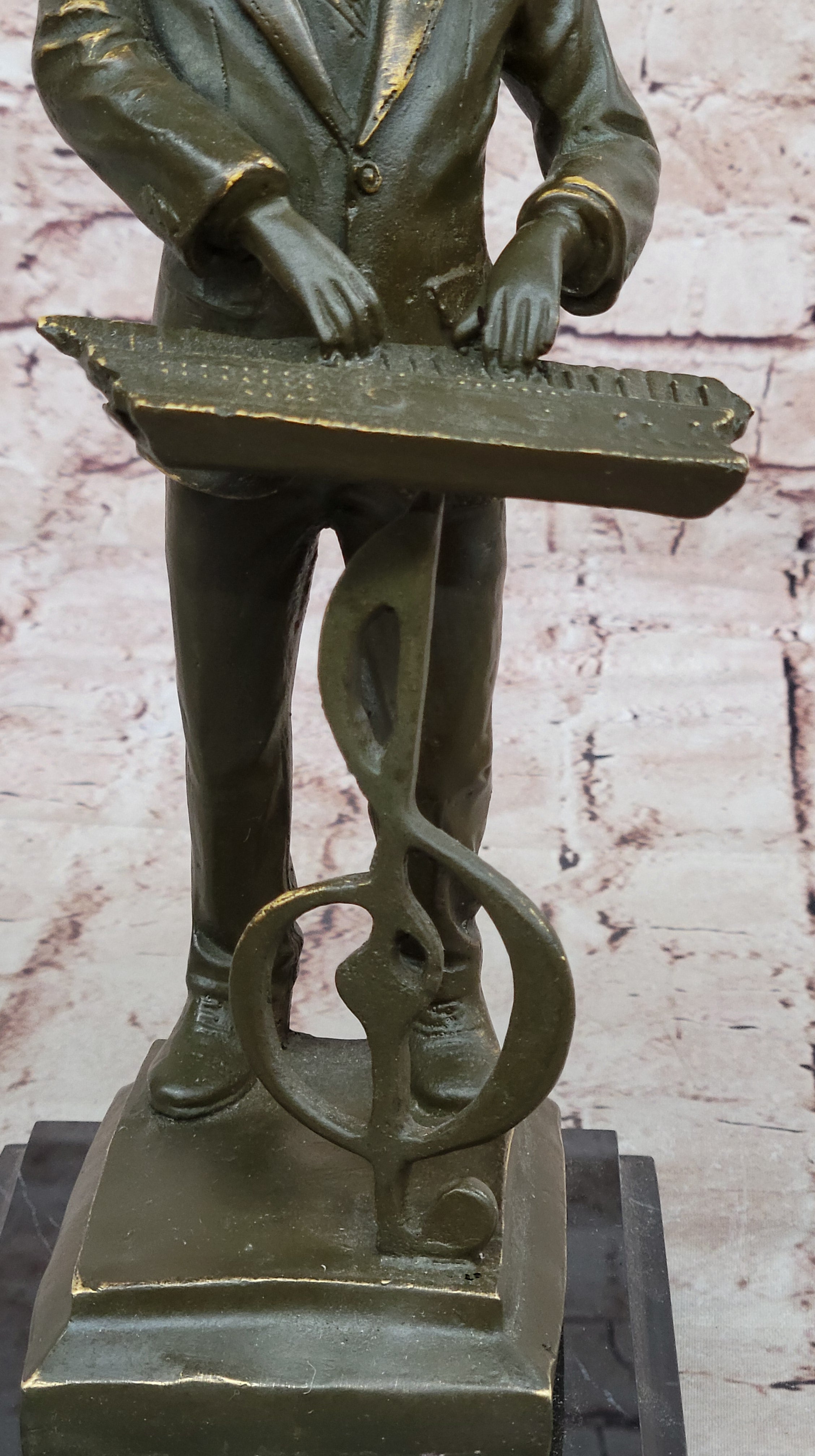 Handmade using the lost wax method, the statue is rich in detail and texture, showcasing the folds of his clothing, the lines of the keyboard, and the subtle features of his face. The brown patina finish adds warmth and character to the work, enhancing its lifelike presence while honoring the timeless appeal of bronze as a medium.