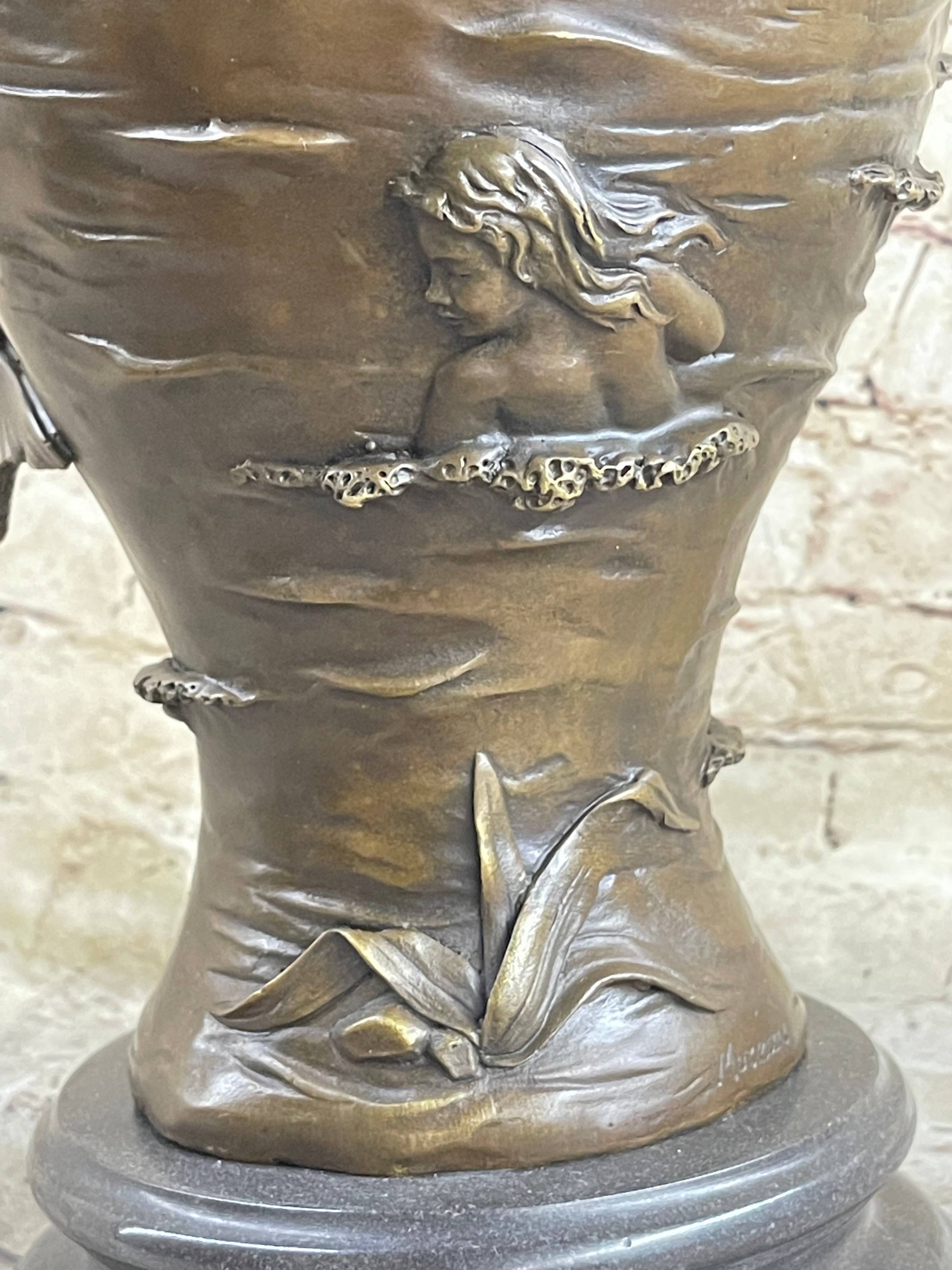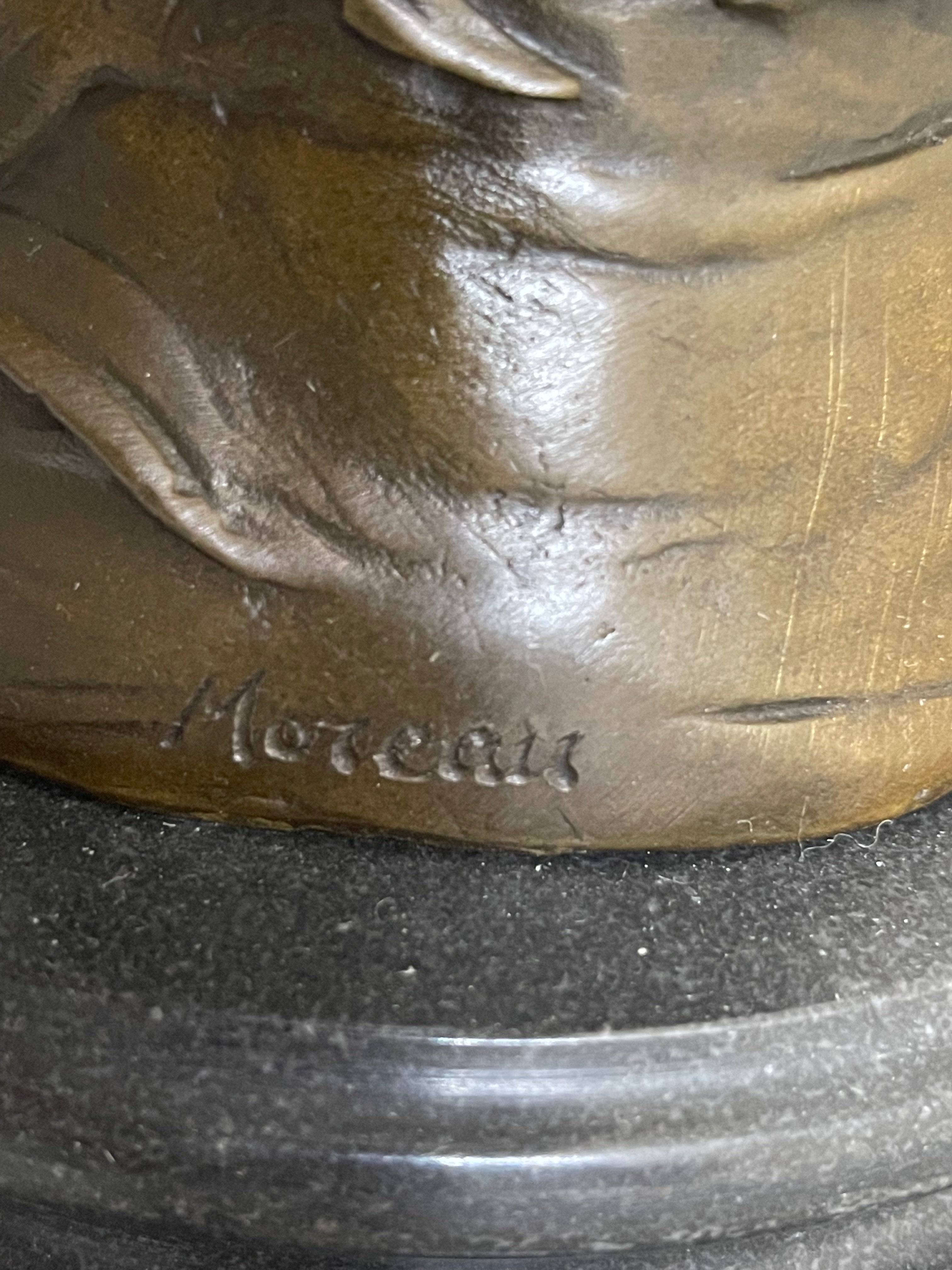 This exquisite bronze sculpture is rich in ancient Greek folklore and crafted using the esteemed ancient method of lost-wax casting. It exudes a captivating allure with a brown patina tarnish finish, further accentuating the intricate details and symbolic narrative. Resting upon a black marble base, it bears the European Bronze Finery stamp of quality and proudly showcases the signature of the renowned artist Moreau.
