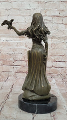 Crafted as a limited edition using the revered lost wax method, the sculpture showcases a warm brown patina that enhances its depth and character. Every element, from the texture of her clothing to the bird at her side, is finely detailed, demonstrating exceptional artistry and precision in bronze casting.