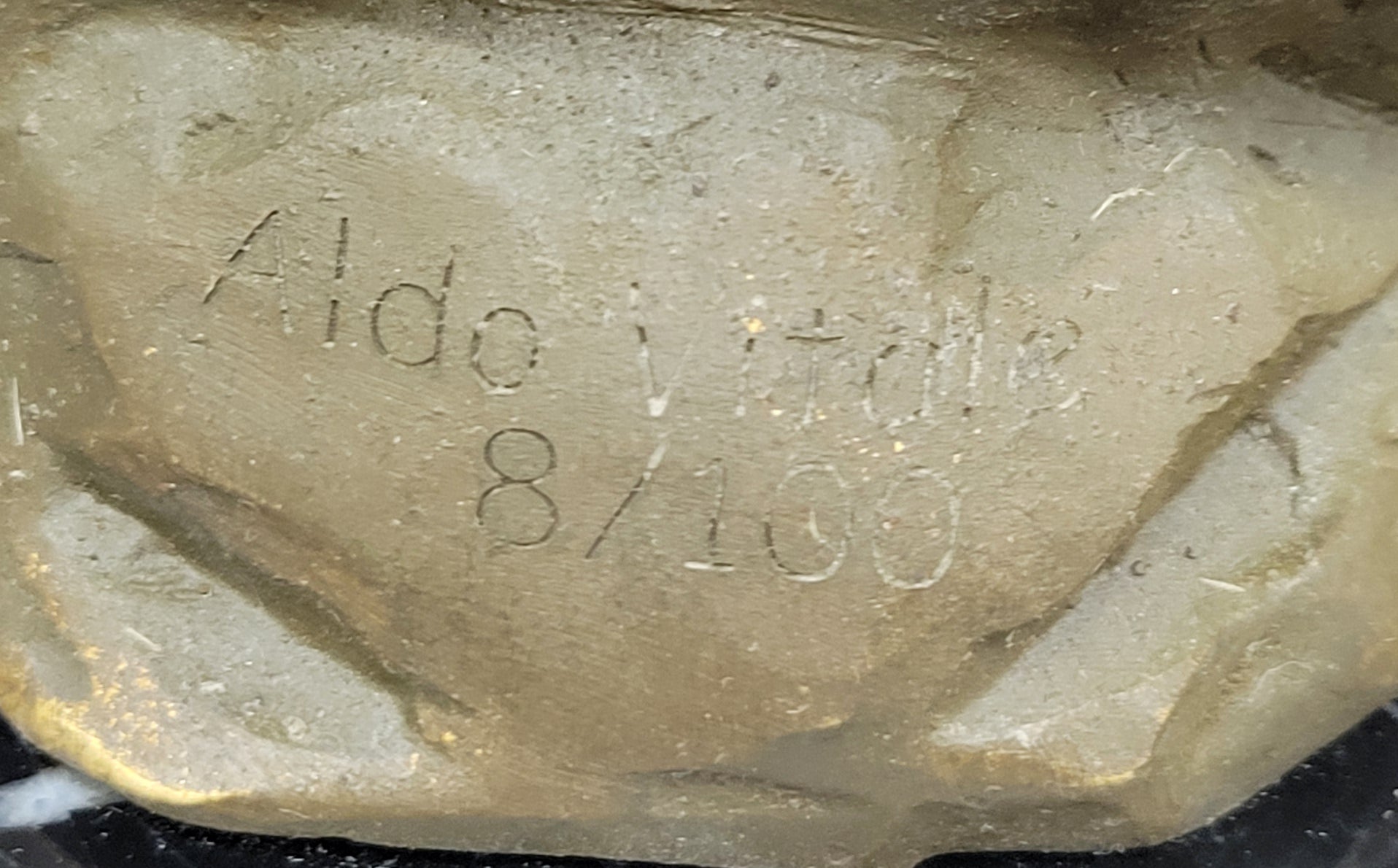 Mounted on a round black marble base and signed by Aldo Vitaleh, this piece offers a compelling blend of mythology, strength, and beauty. It makes a meaningful addition to any collection, honoring both ancient legend and modern craftsmanship.Bronze Dimensions with Marble Base: Height 13" X Width 9"