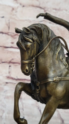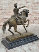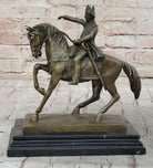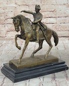 Cast using the traditional "Lost Wax Method," this bronze sculpture is a masterful reproduction that pays homage to the historical significance of Napoleon's campaign. The piece is meticulously detailed, from the commanding posture of Napoleon to the powerful stance of his rearing horse. The brown patina finish enhances the sculpture's depth and historical character, giving it an authentic, timeless appeal. Mounted on a solid black marble base, the sculpture is not only a work of art but also a conversation piece that will captivate the attention of history enthusiasts and art lovers alike. The artist's signature on the piece further attests to its craftsmanship and authenticity.