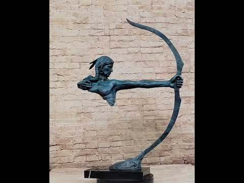 From the right side, the Native American warrior commands attention with his piercing gaze, focused on the trajectory of his just-released arrow, reminiscent of a hawk tracking its prey. With his right hand pulled back to his chest and his left arm extending firmly to hold the bow, every detail of his poised stance is exquisitely portrayed. The ancient lost-wax casting method brings this powerful sculpture to life, and a striking green patina finish enhances its timeless allure.