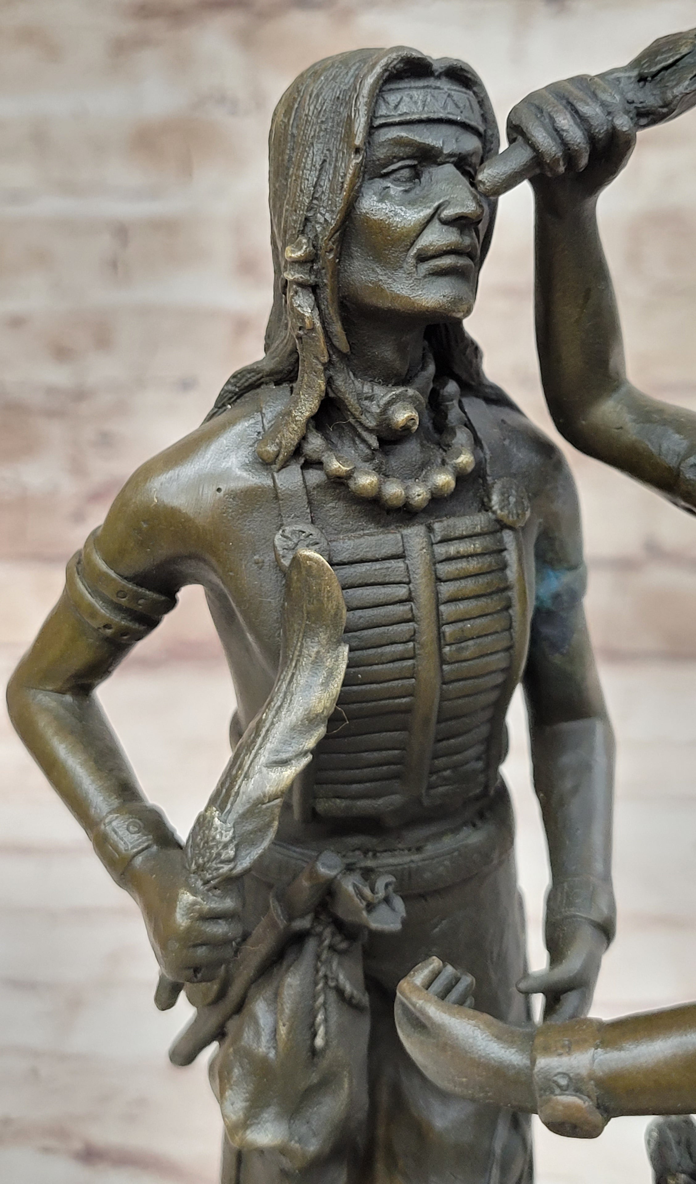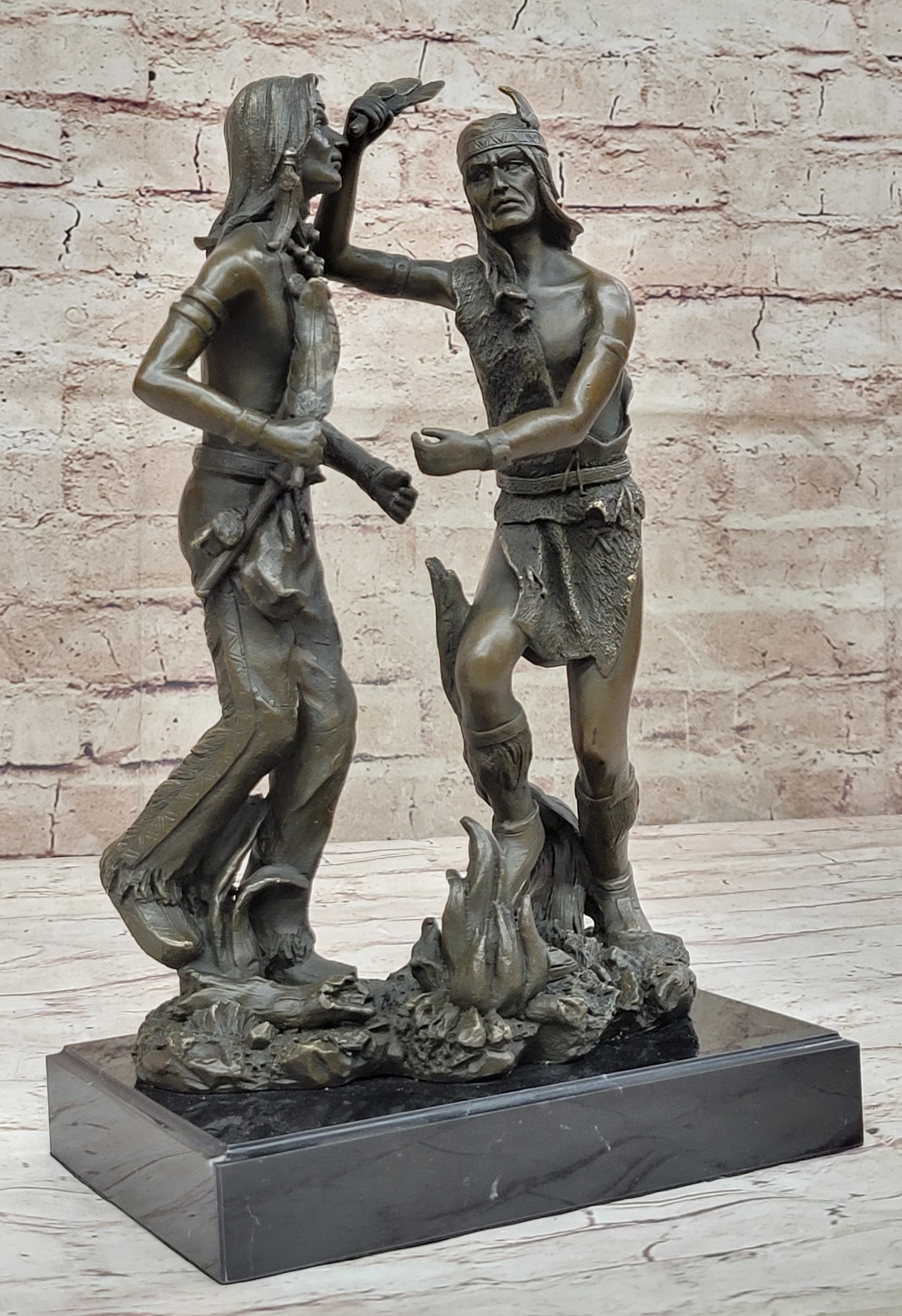 Experience the cultural heritage and beauty of the Native American tradition through this breathtaking bronze sculpture. Its presence evokes a sense of reverence and admiration, making it a perfect centerpiece for art enthusiasts and collectors who appreciate the depth of human expression and the power of artistic storytelling.Bronze Dimensions with Marble Base: Height 12" x Width 7"