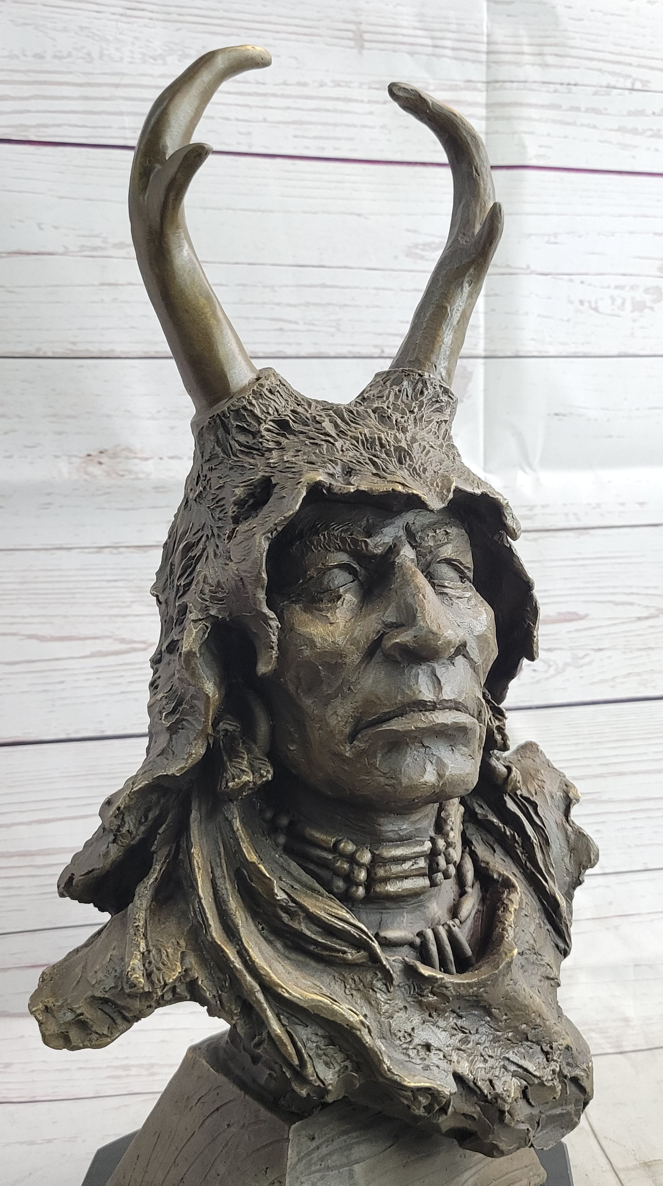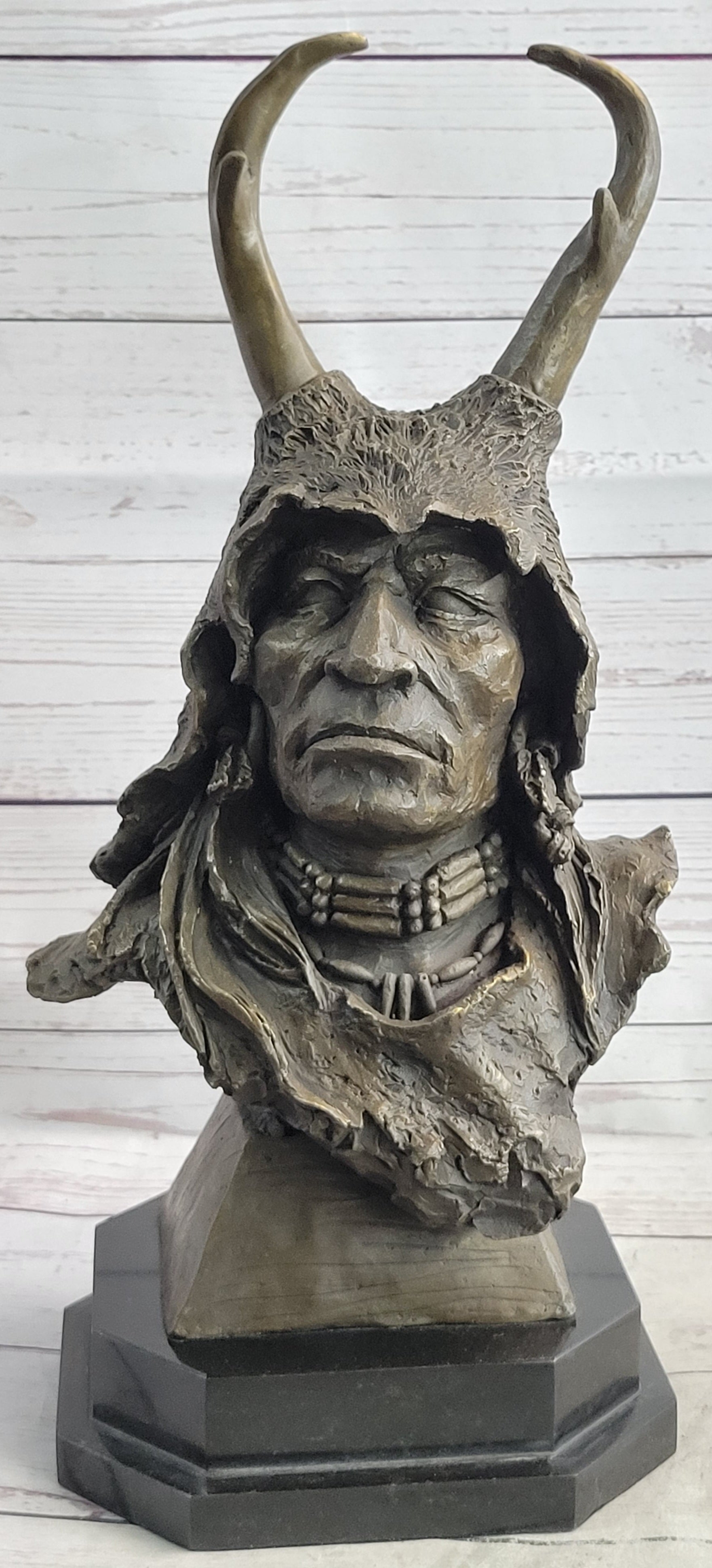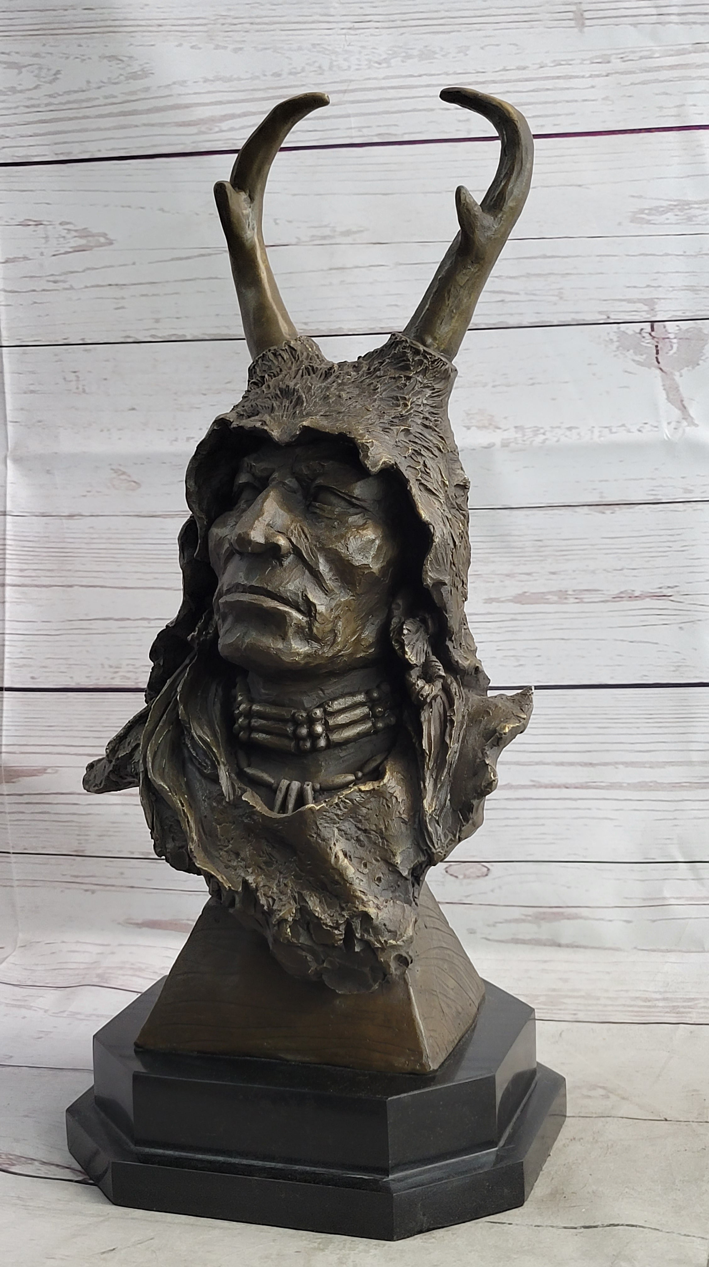 Native American Indian Shaman Man in Antler Headdress Bronze Sculpture Statue on Marble Base
