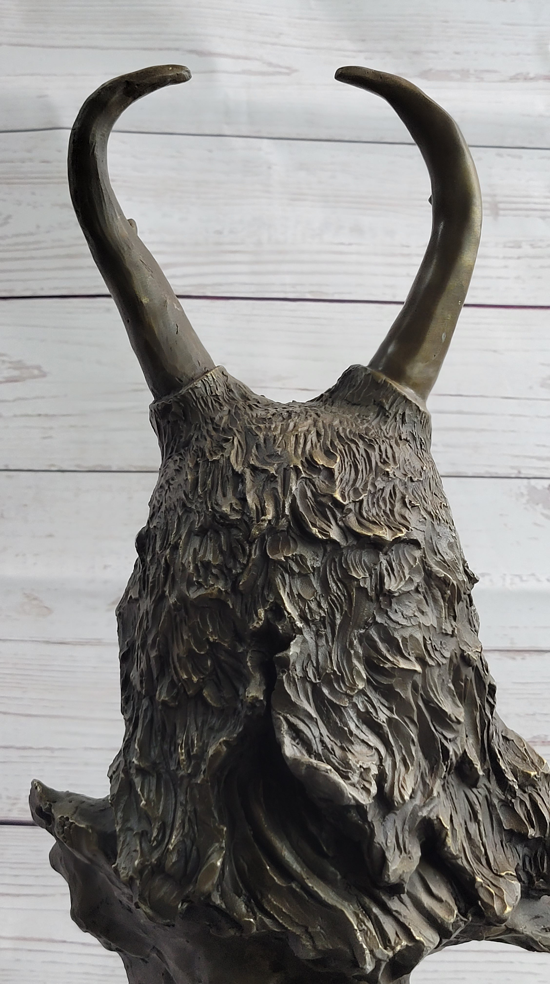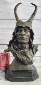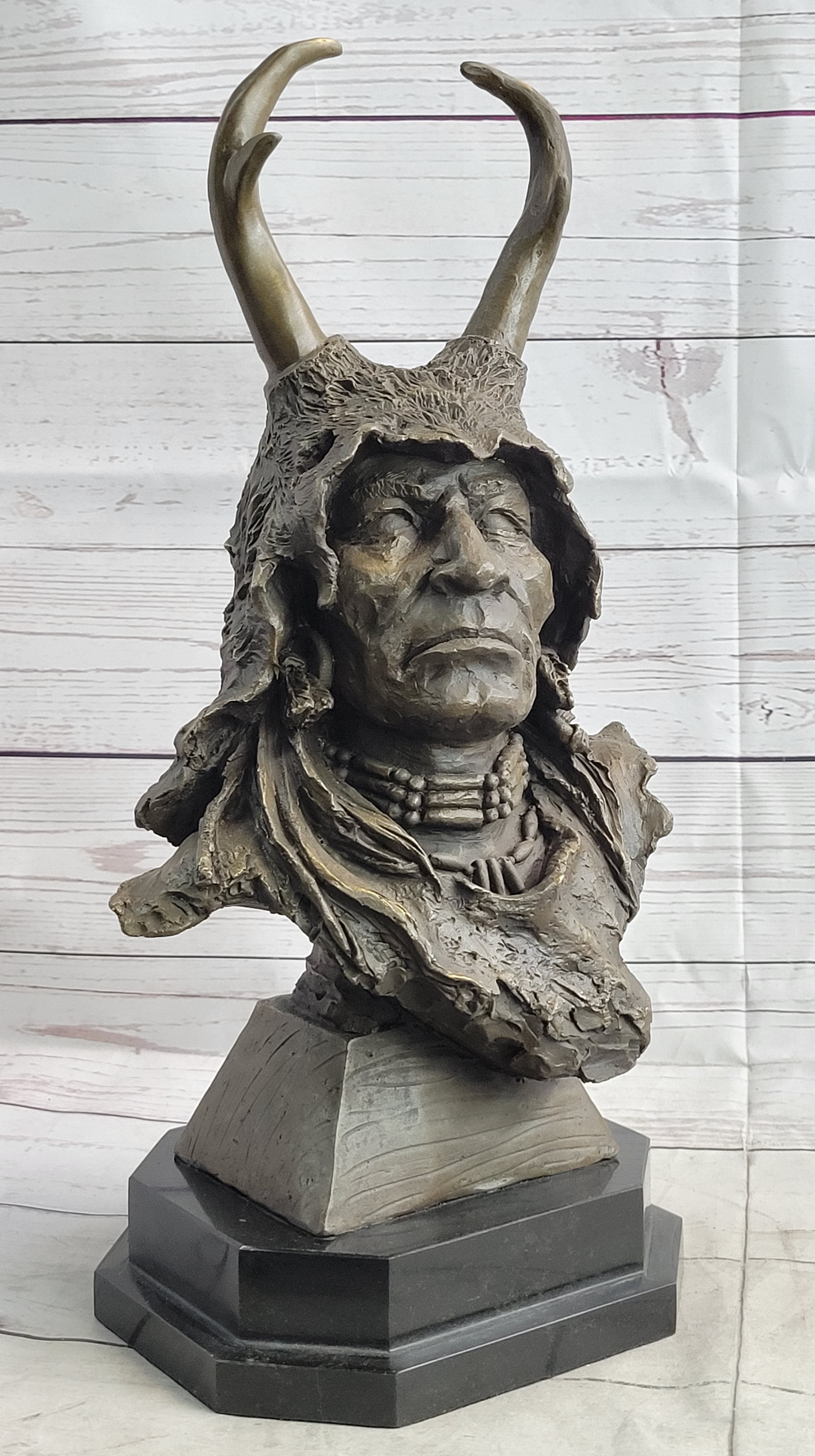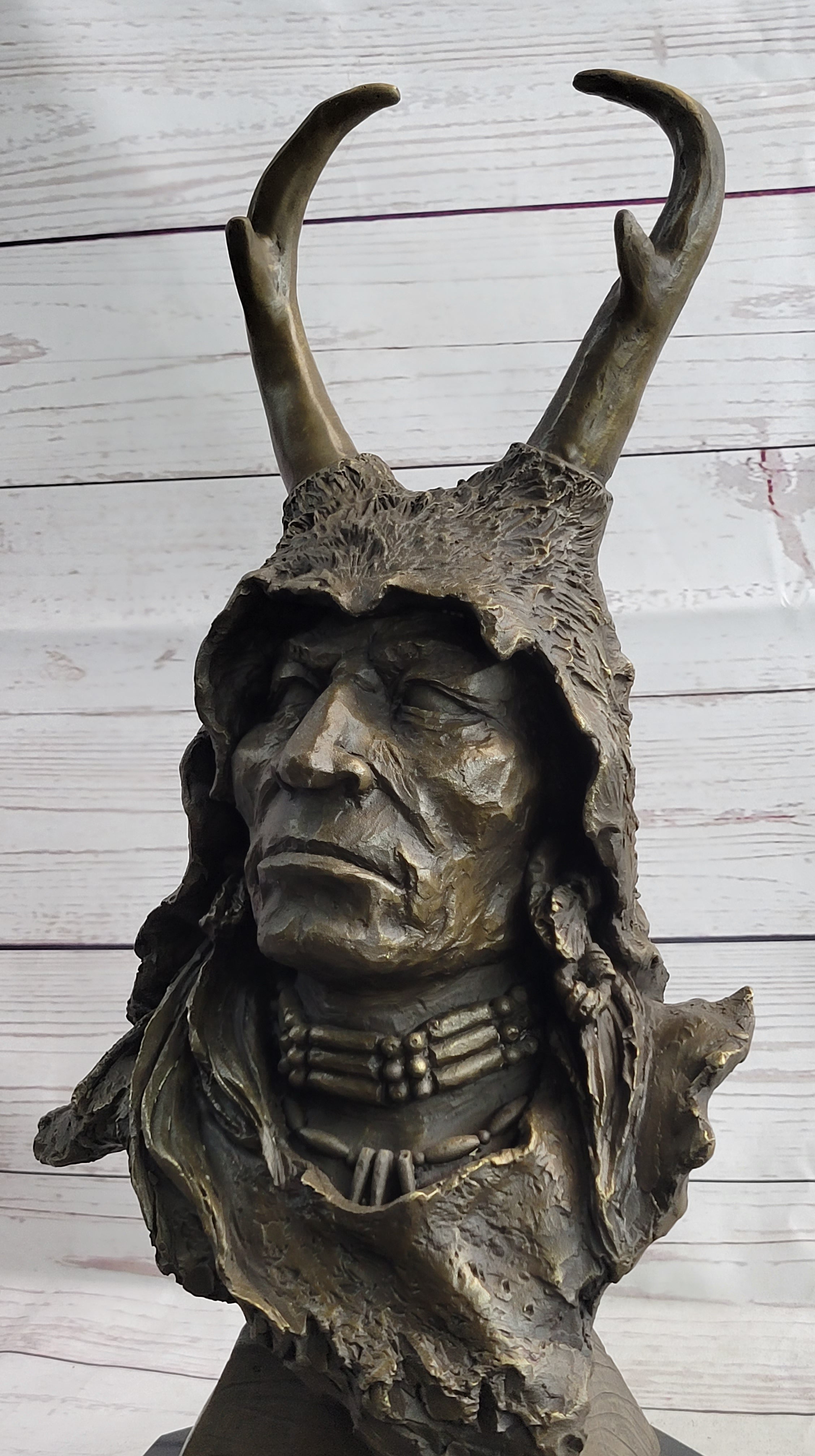 Native American Indian Shaman Man in Antler Headdress Bronze Sculpture Statue on Marble Base