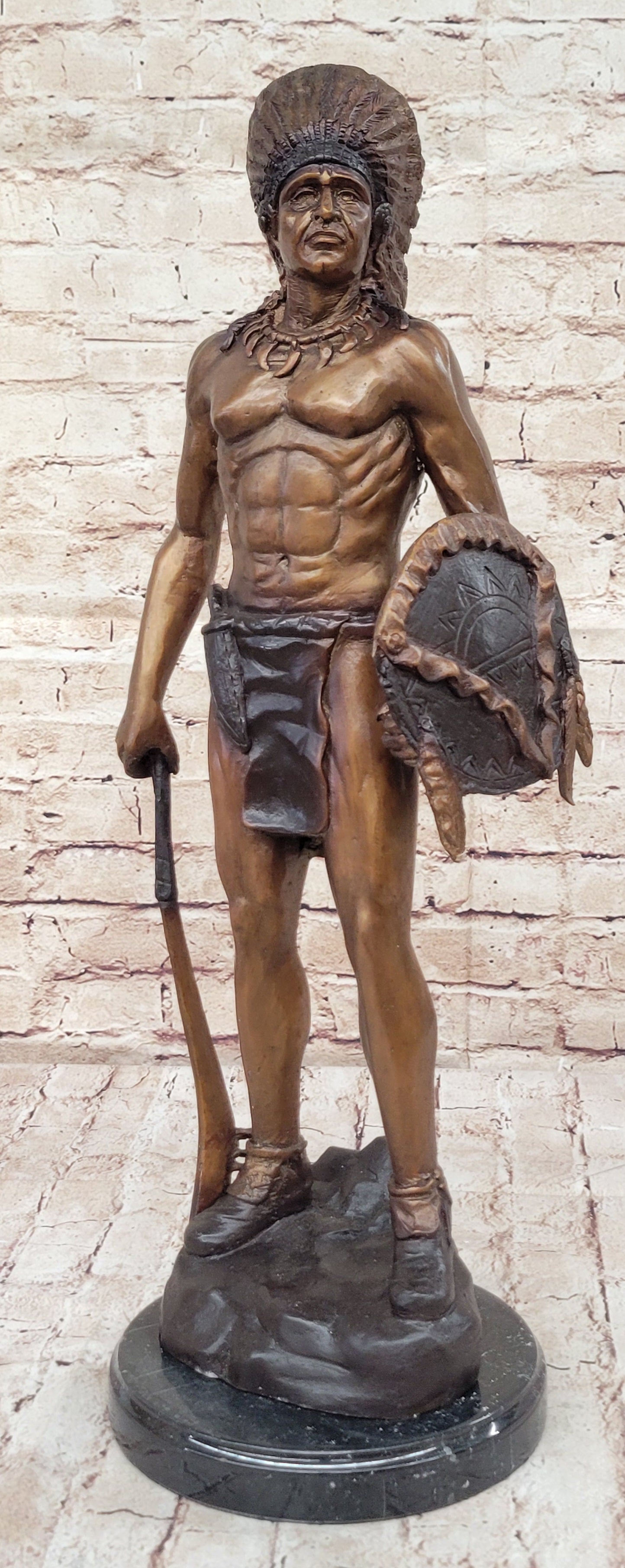 Native American Indian Warrior Bronze Metal Statue Sculpture on Marble Base CM Russell