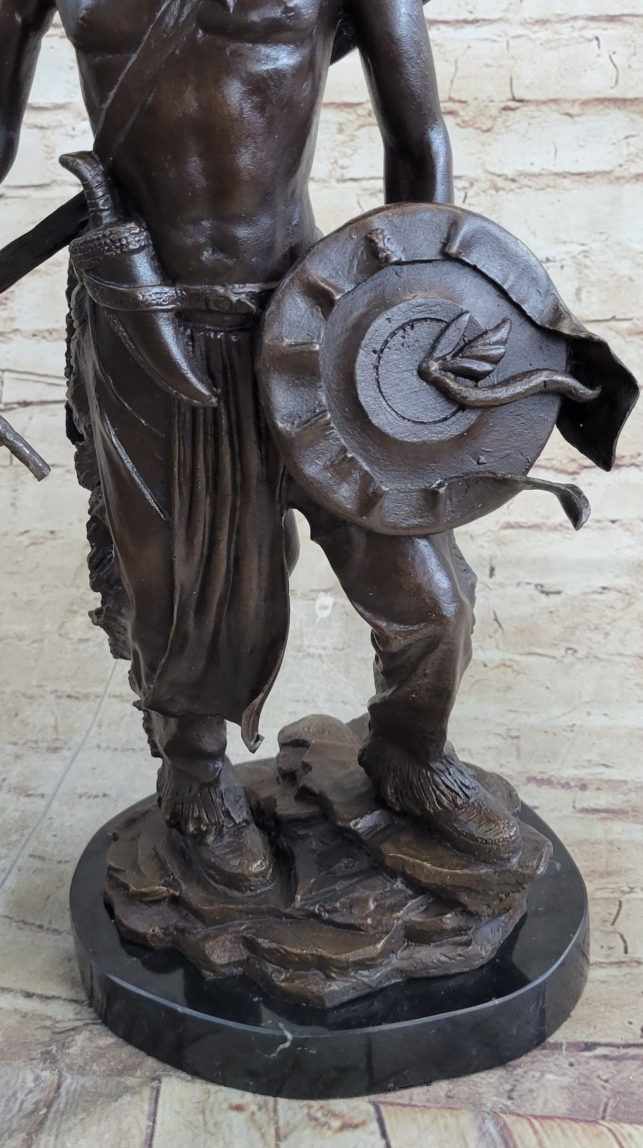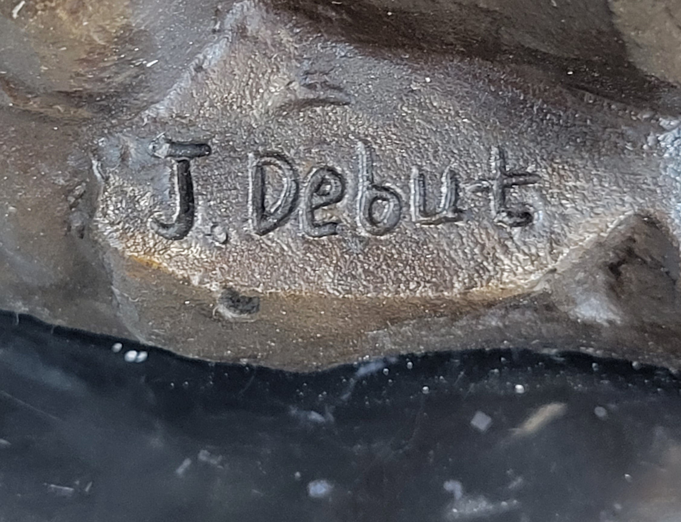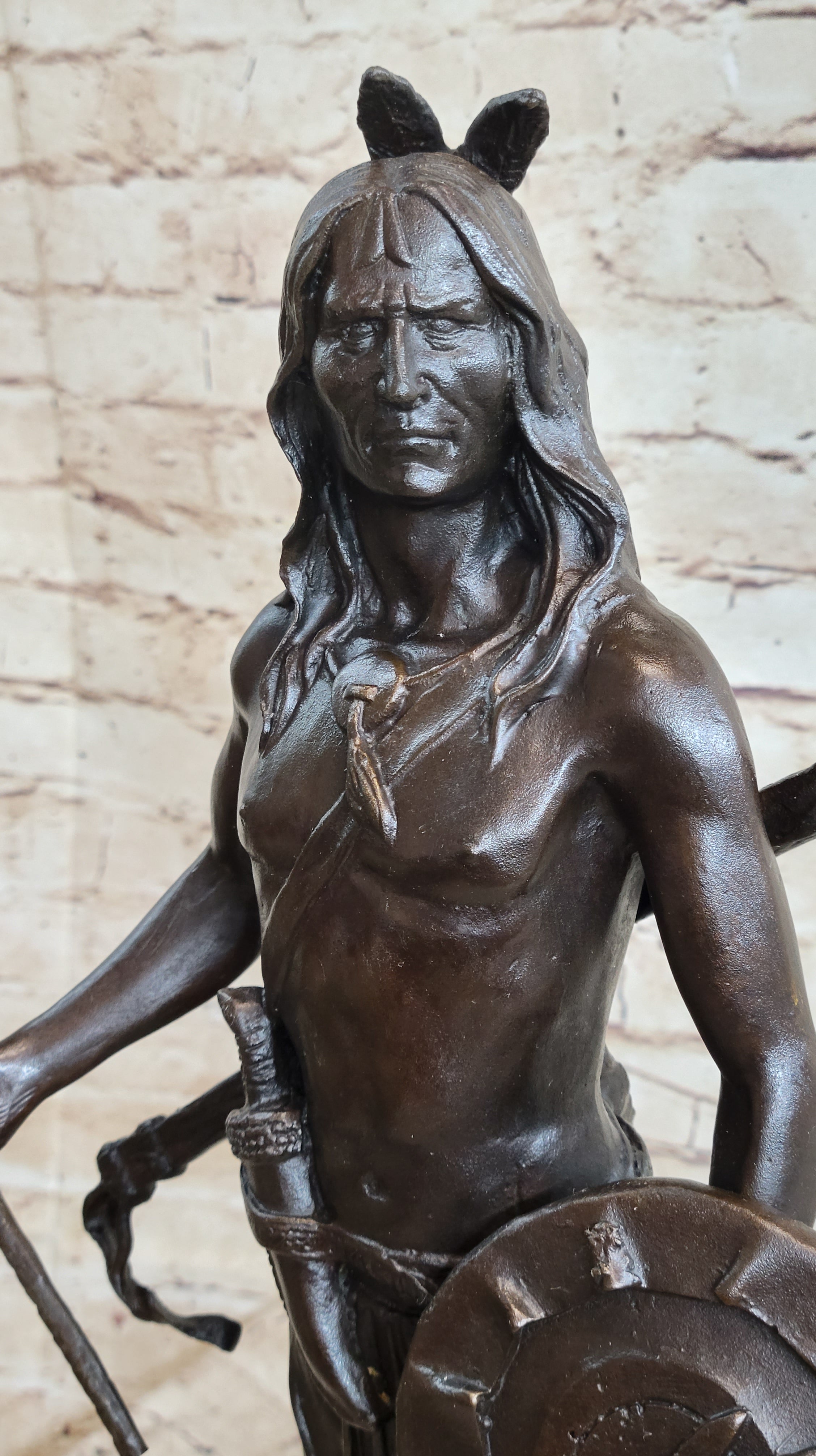Mounted on a sleek black marble base, this artwork is a testament to the rich history and cultural significance of Native American heritage. The signature of the artist J. Debut confirm its quality, making it a distinguished piece for any collector. This stunning bronze figure serves as a timeless tribute to the bravery, strength, and wisdom of Native American leaders.Bronze Dimensions with Marble Base: Height 20" X Width 12"