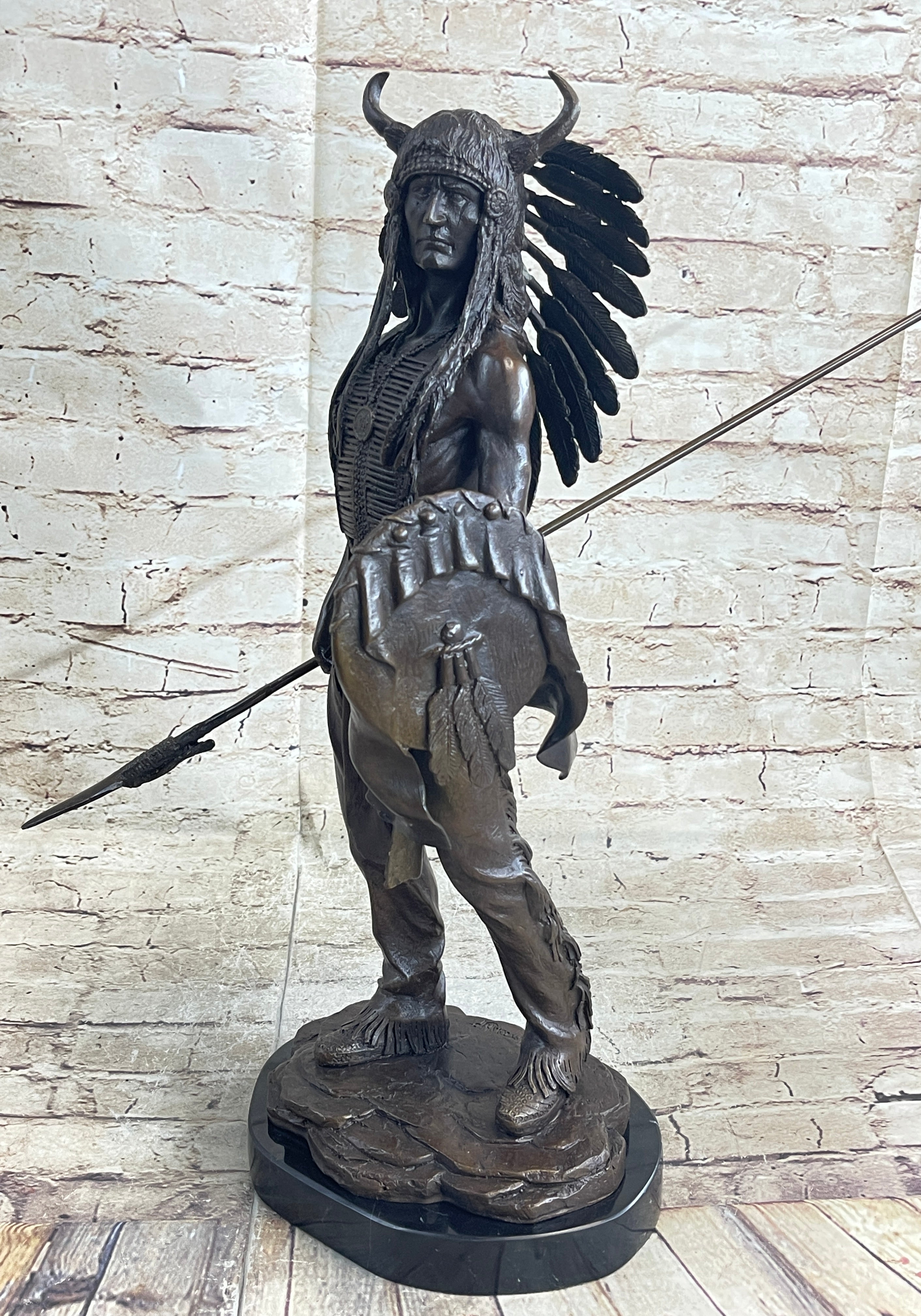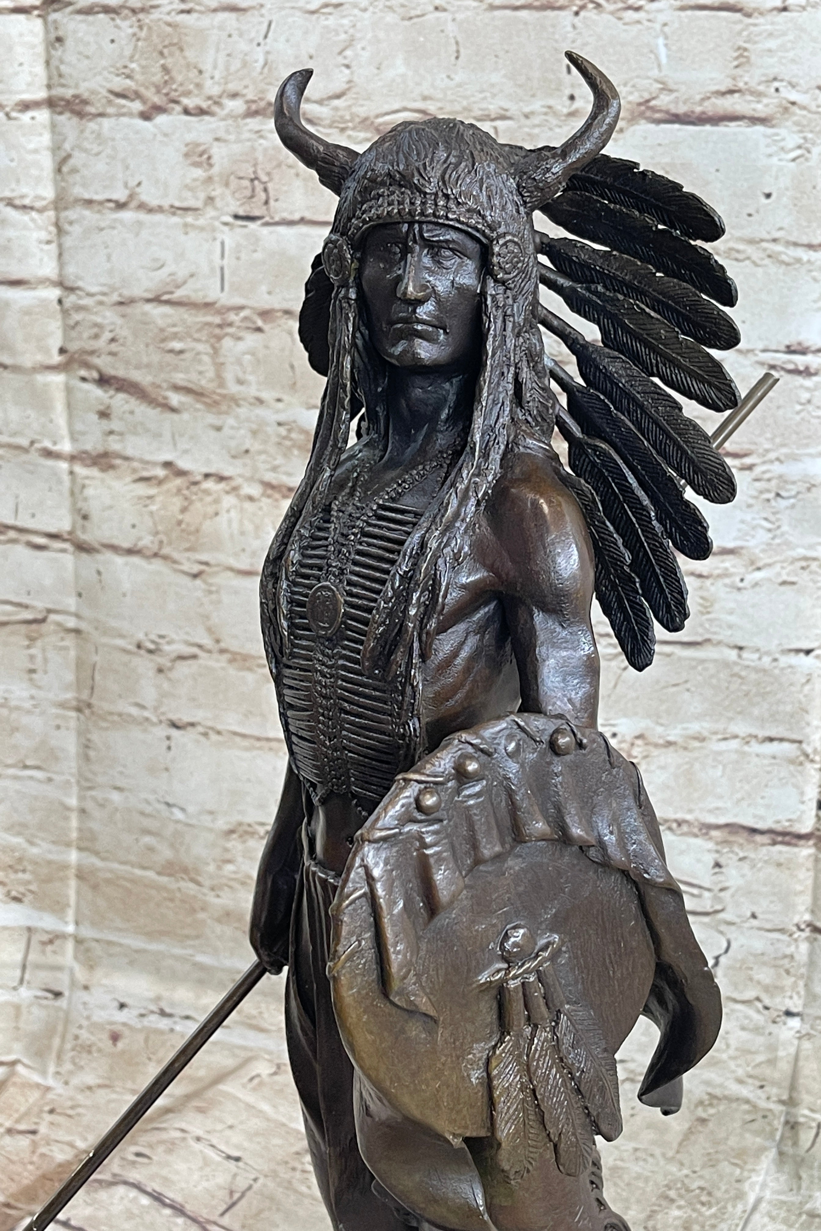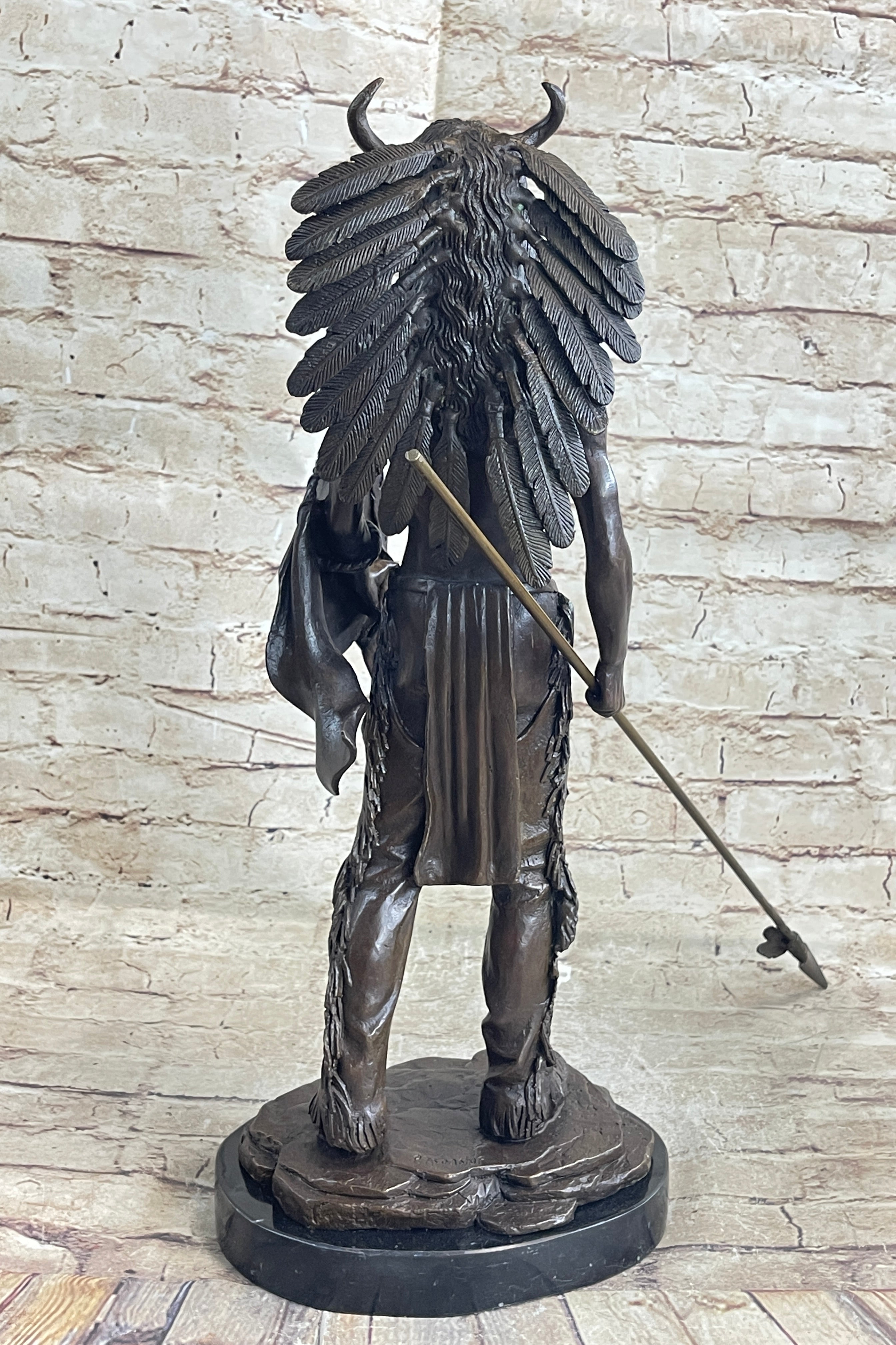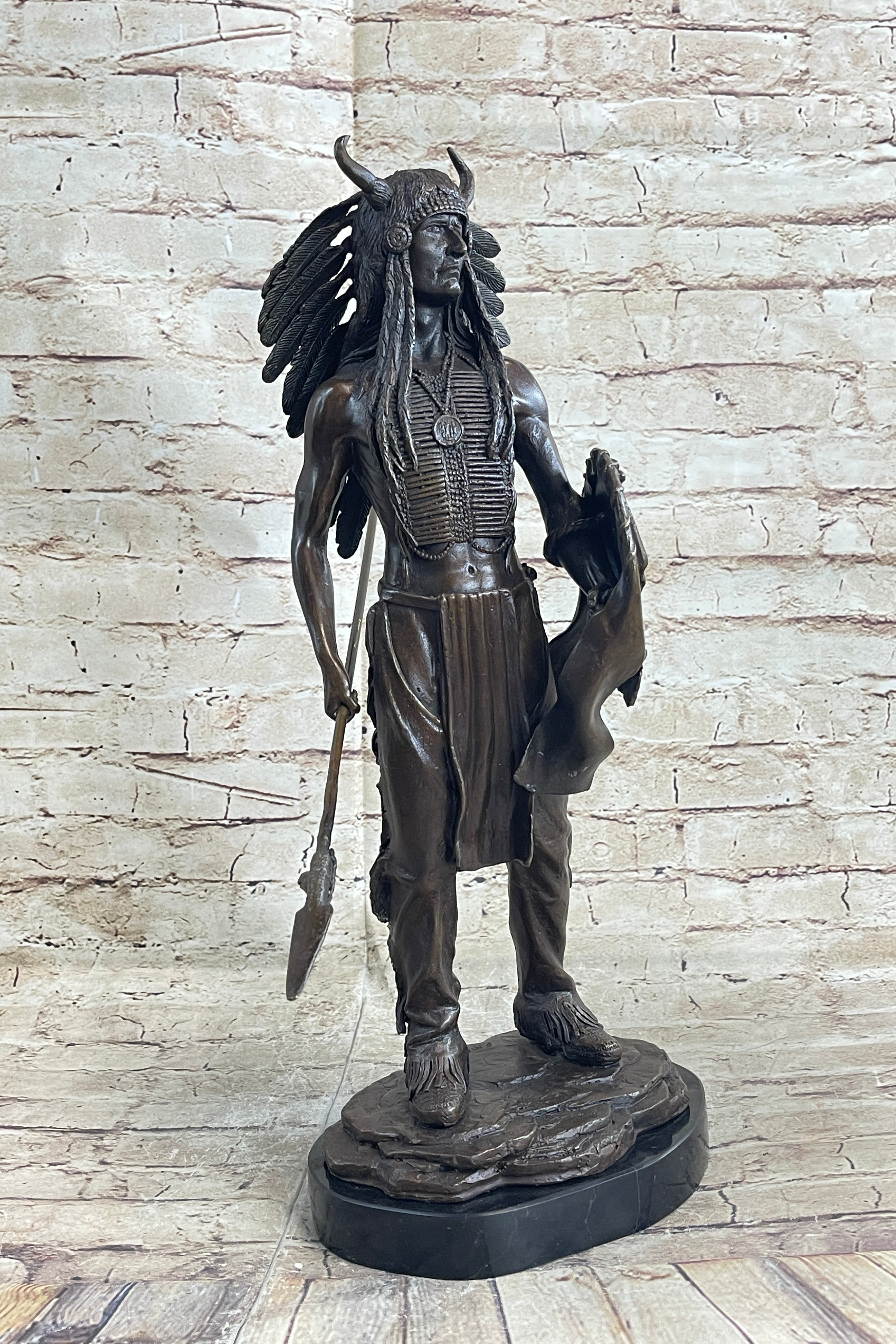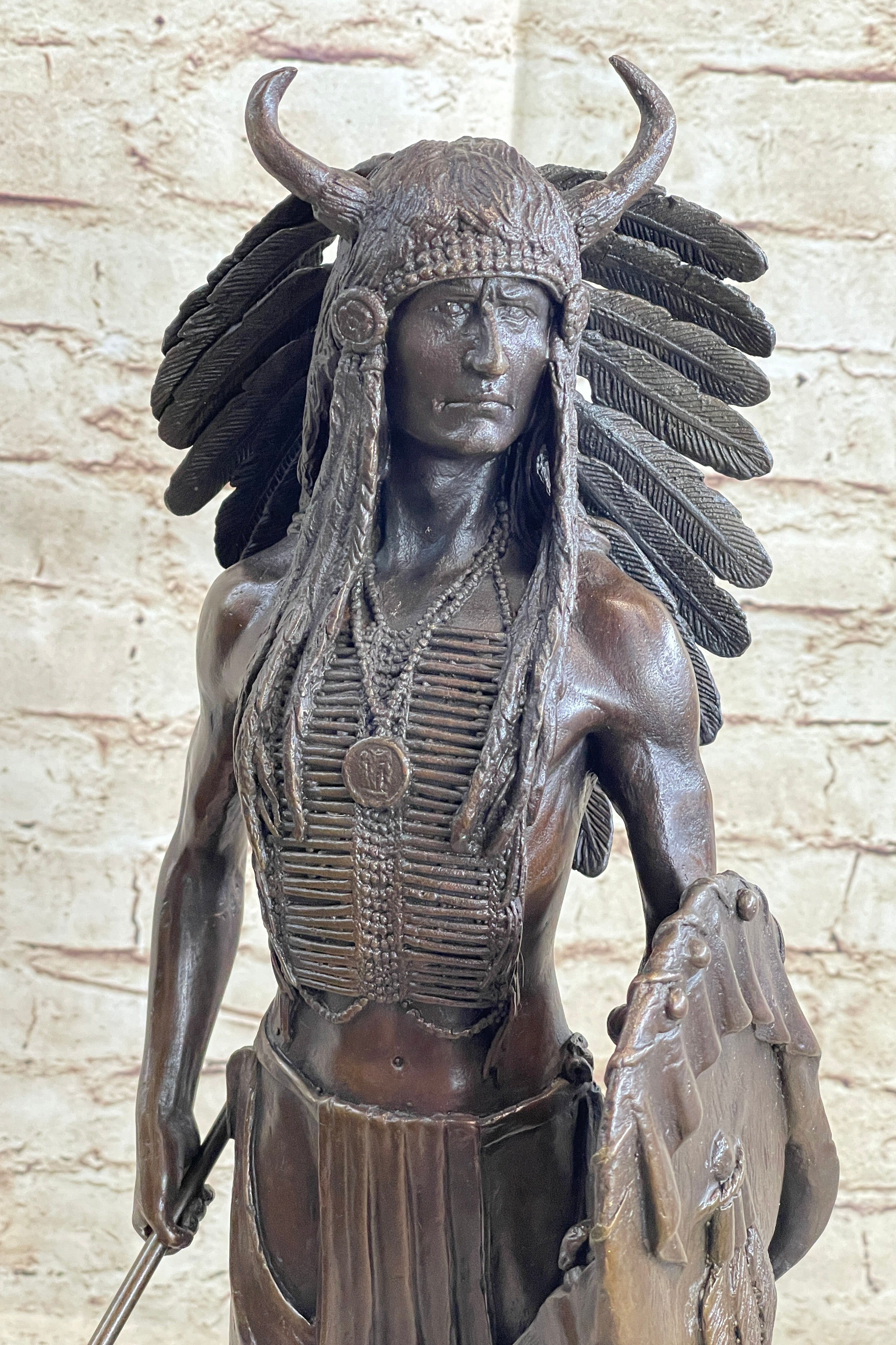 This exquisite bronze sculpture captures the chief's commanding presence through the ancient art of lost-wax casting, a technique renowned for its ability to produce detailed and lifelike representations. The piece is finished with a rich brown patina, enhancing its visual depth and timeless appeal. Mounted on a black marble base, the sculpture stands as a powerful tribute to the rich cultural heritage and spiritual significance of the Native American warrior tradition. This artwork not only celebrates the chief's strength and dignity but also serves as a beautiful and meaningful addition to any collection.Bronze Dimensions with Marble Base: Height 20" X Width 8"