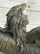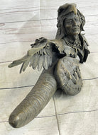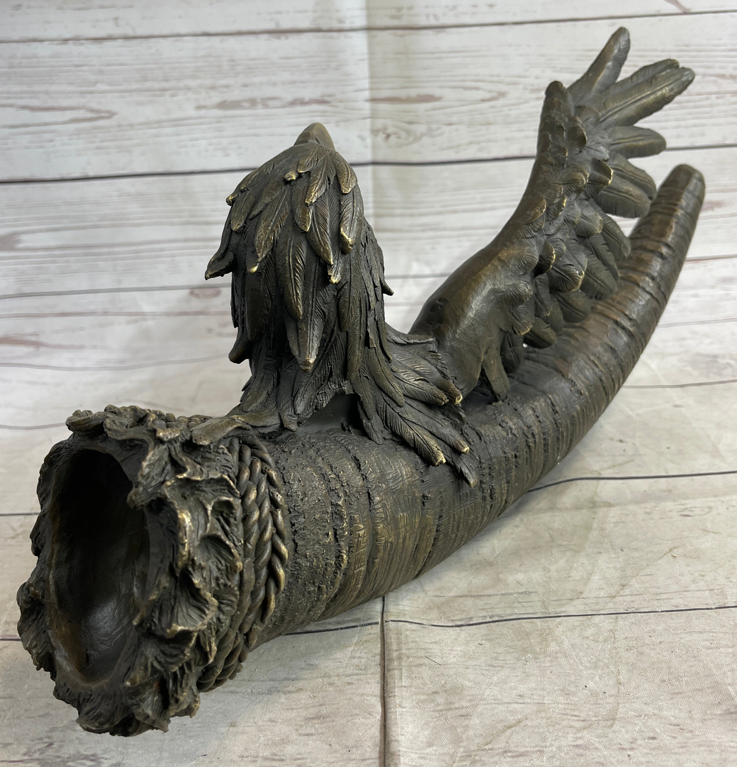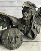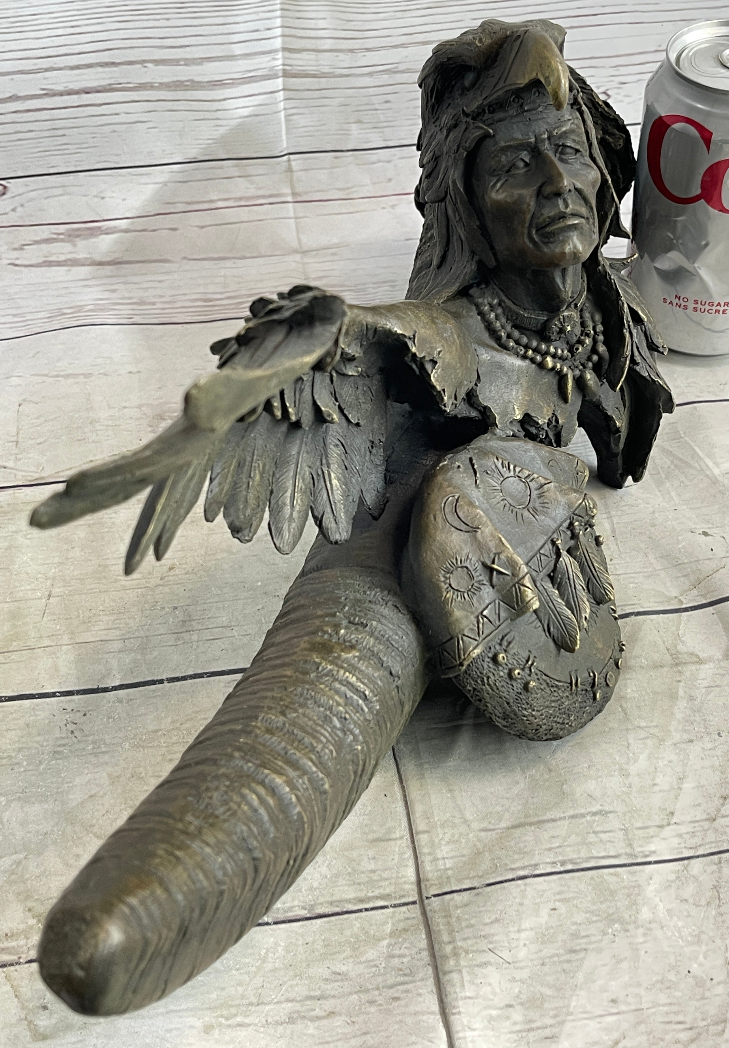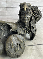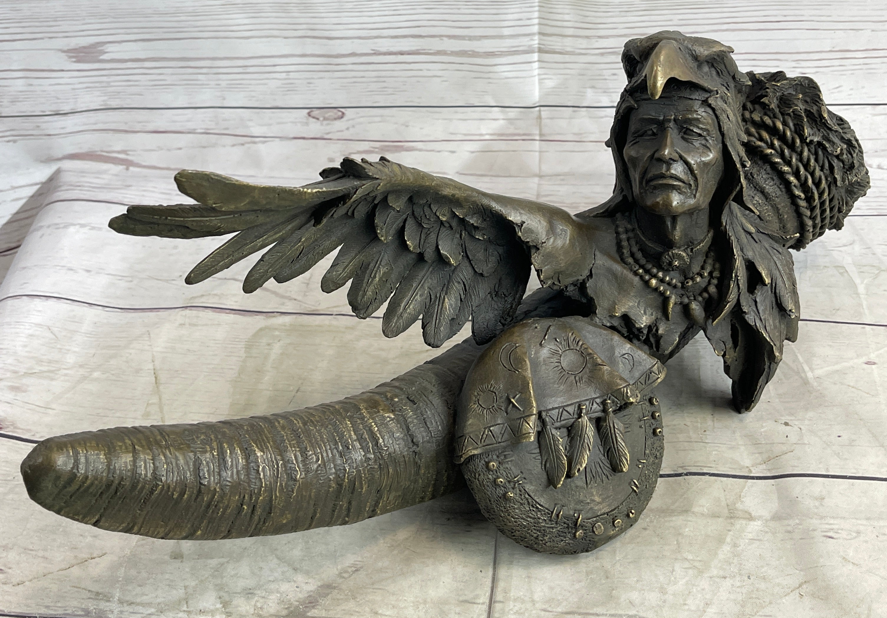 Native American Warrior With Eagle Headdress And Horn Bronze Sculpture Figurine