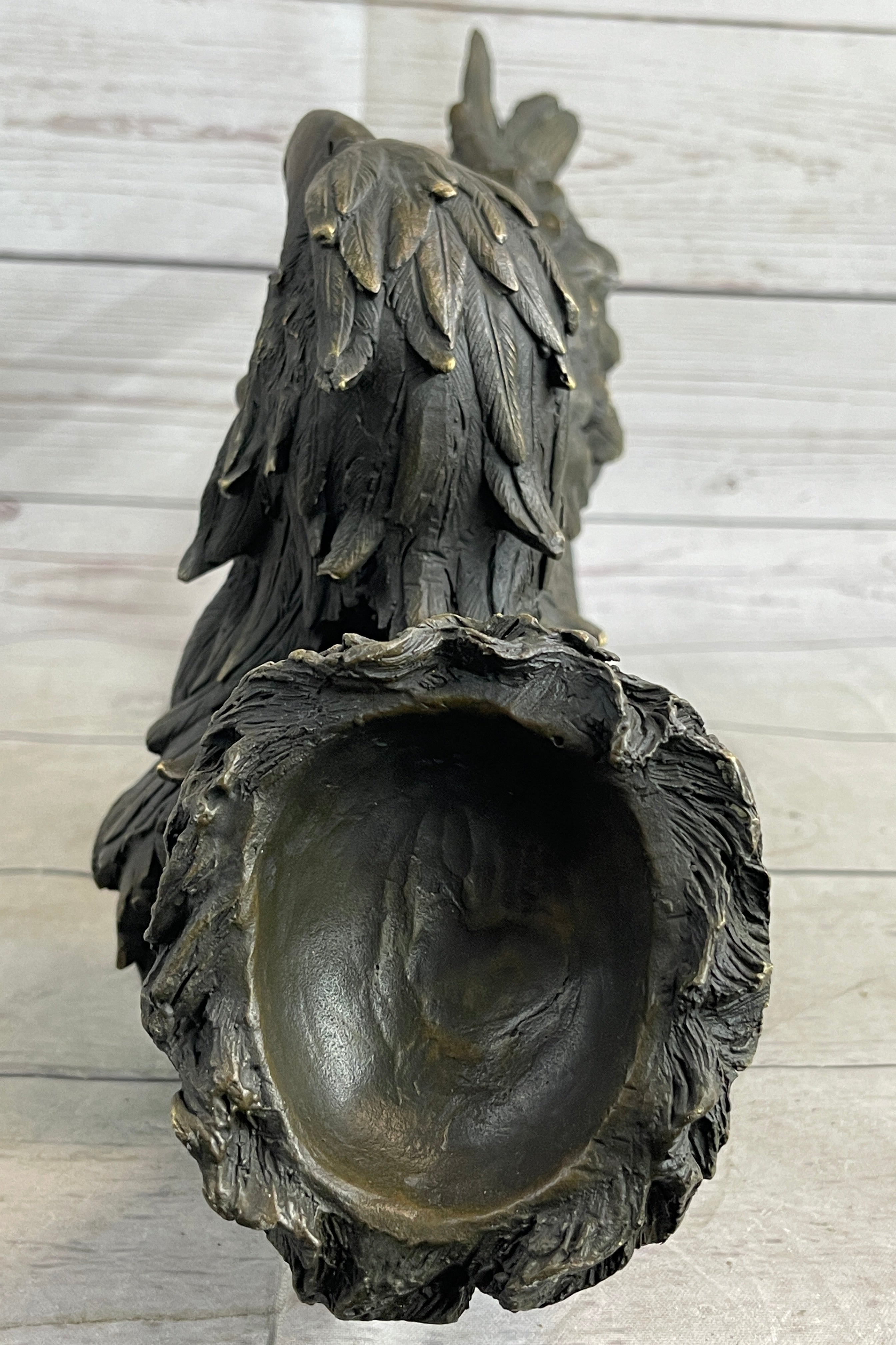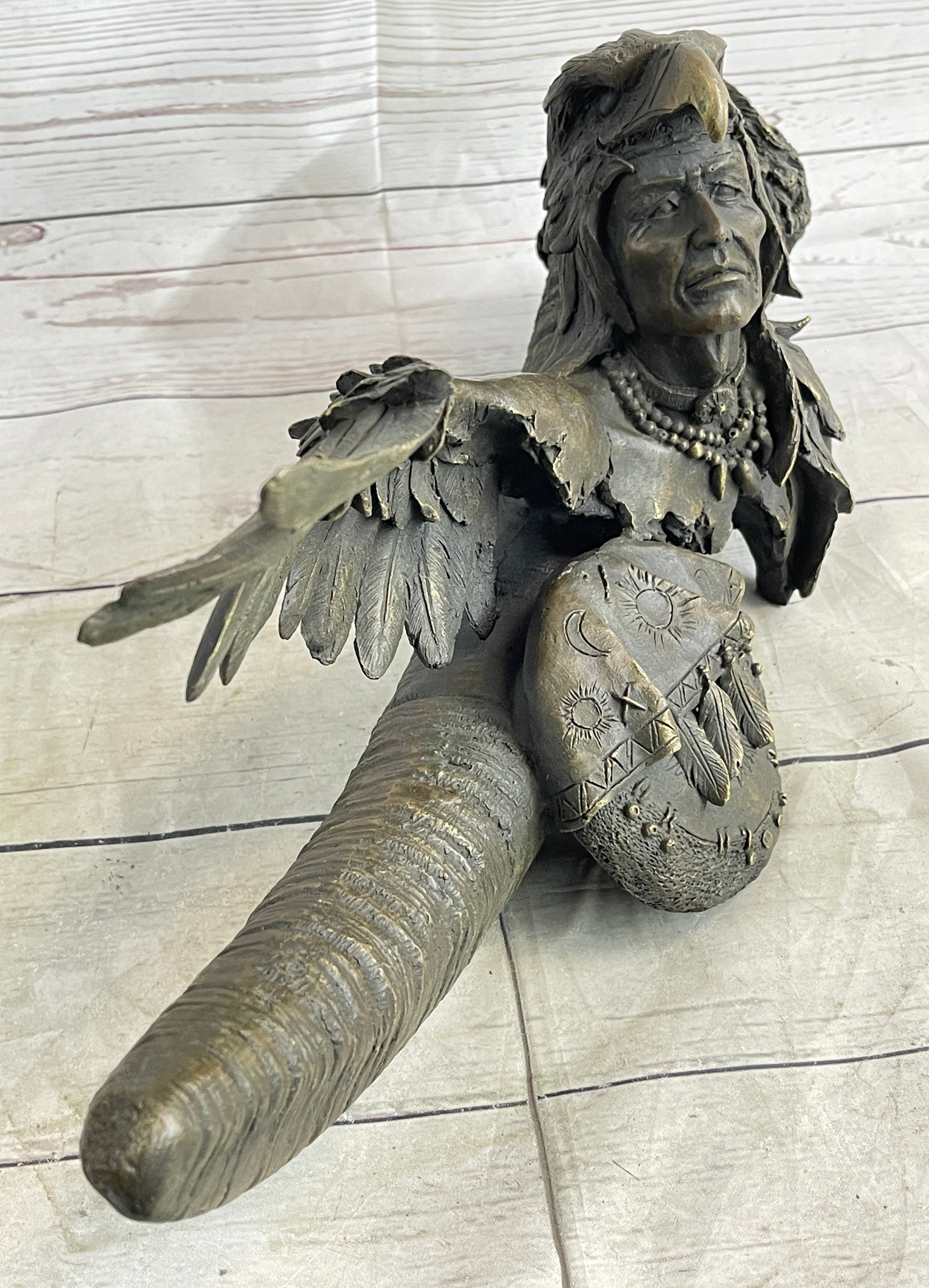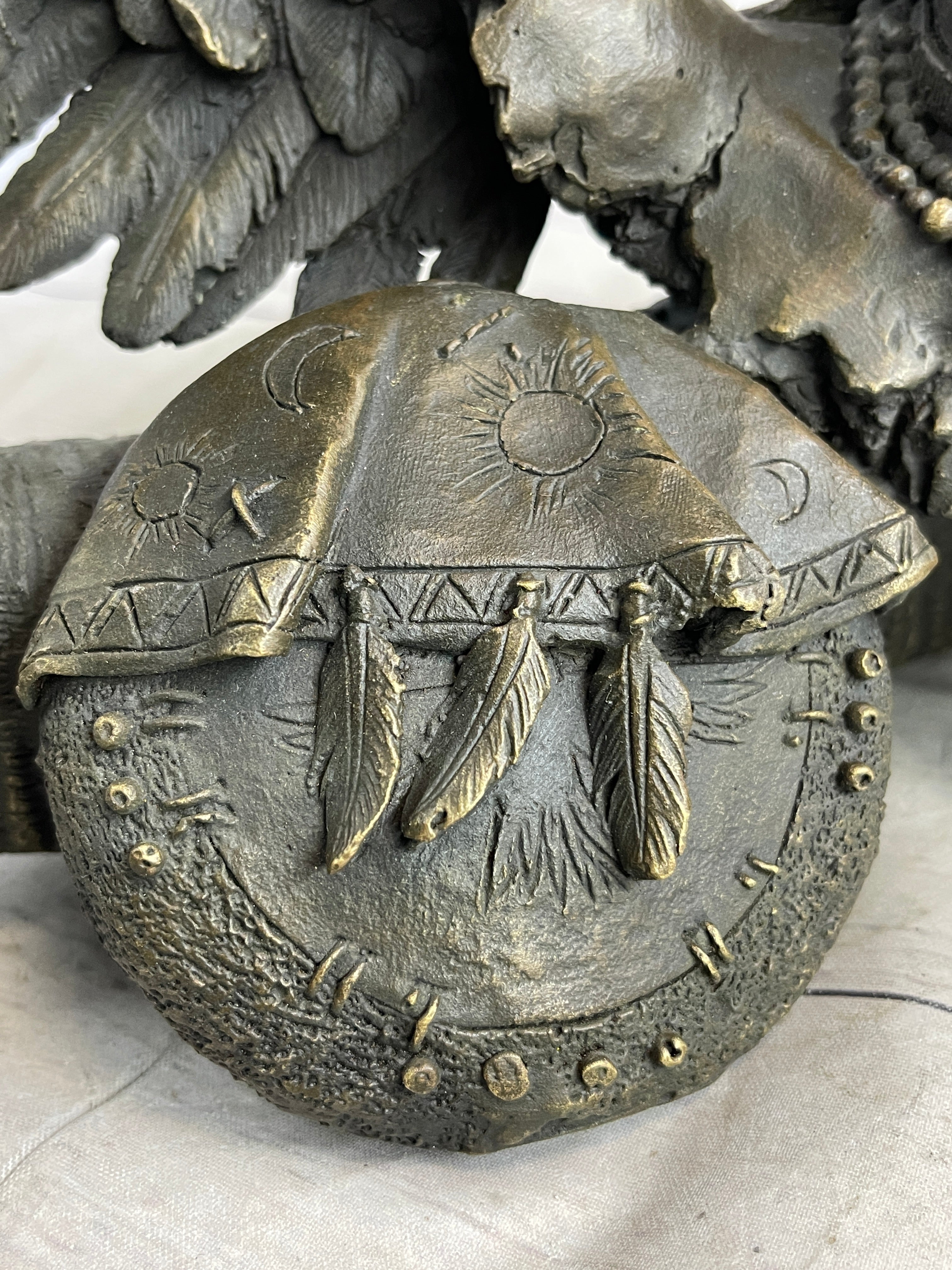 Cloaked in the sacred feathers of the eagle, a revered bird in Native American culture, this sculpture encapsulates the timeless narrative of a mediator to the spirit world. The artist draws inspiration from the rich traditions of Southwest tribal customs, skillfully crafting a museum-quality warrior with intricate detail. The feathers, symbolizing spiritual connection and strength, create a visually striking and culturally significant representation. Every aspect of this magnificent work of art, from its inspired design to its meticulous execution, reflects a deep respect for the heritage and symbolism embedded in Native American traditions.