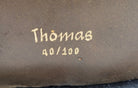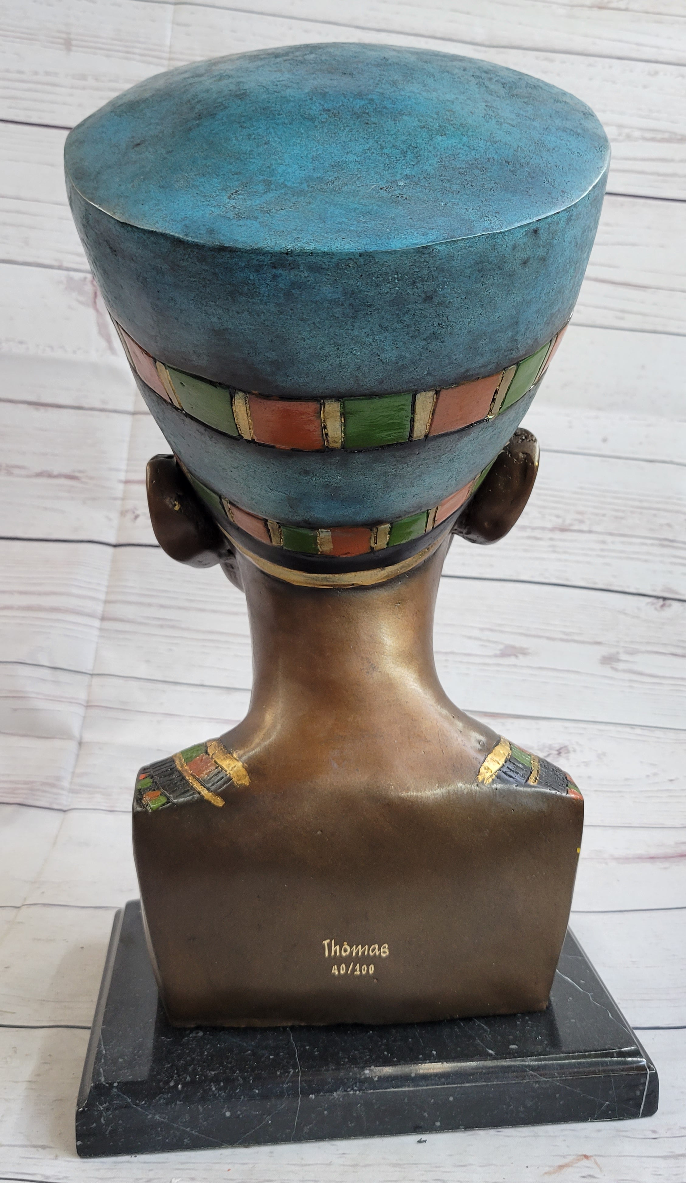 From the meticulously crafted facial features, including the pronounced chin, straight and slender nose, and the captivating gaze of her eyes, to the finely sculpted cheekbones and the intricate detailing of her ears, every element reflects the exquisite artistry of ancient Egypt. The statue also showcases a stunning collar necklace, resplendent with a vivid array of patina colors, replicating the royal adornments worn by the legendary queen. Crafted with meticulous care and attention to detail, this limited edition sculpture, signed and numbered by the esteemed artist Thomas, serves as a timeless tribute to Nefertiti's enduring legacy and the rich artistic heritage of ancient Egypt.