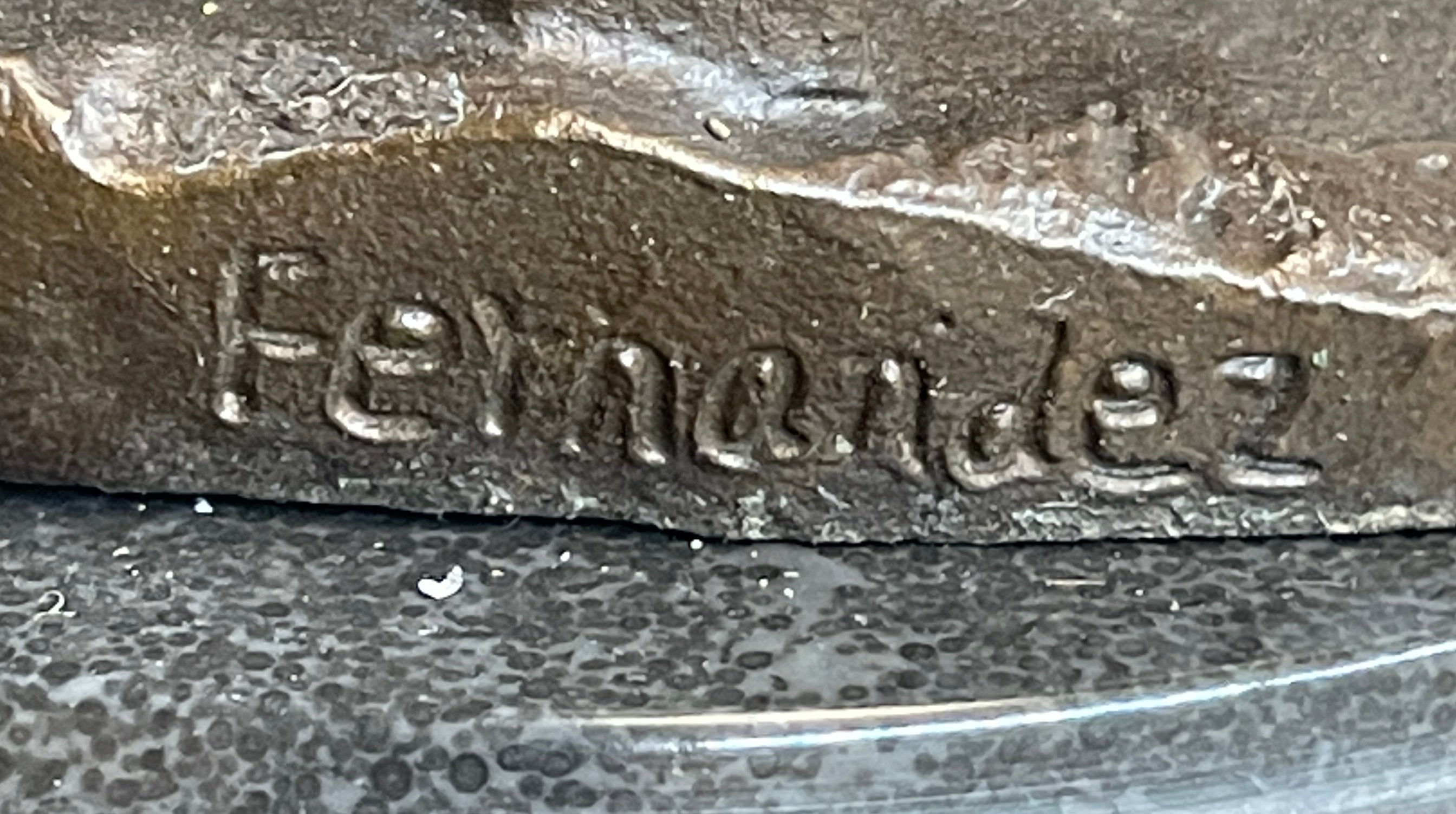 This bronze reproduction, created using the lost-wax casting method, faithfully mirrors the original statue's elegance, enhanced by a brown patina finish. Mounted on a black marble base and signed by the artist Fernandez, this piece allows admirers of Greek mythology and classical art to appreciate this enduring symbol of triumph in their own space.Bronze Dimensions with Marble Base: Height 18" x Width 7"
