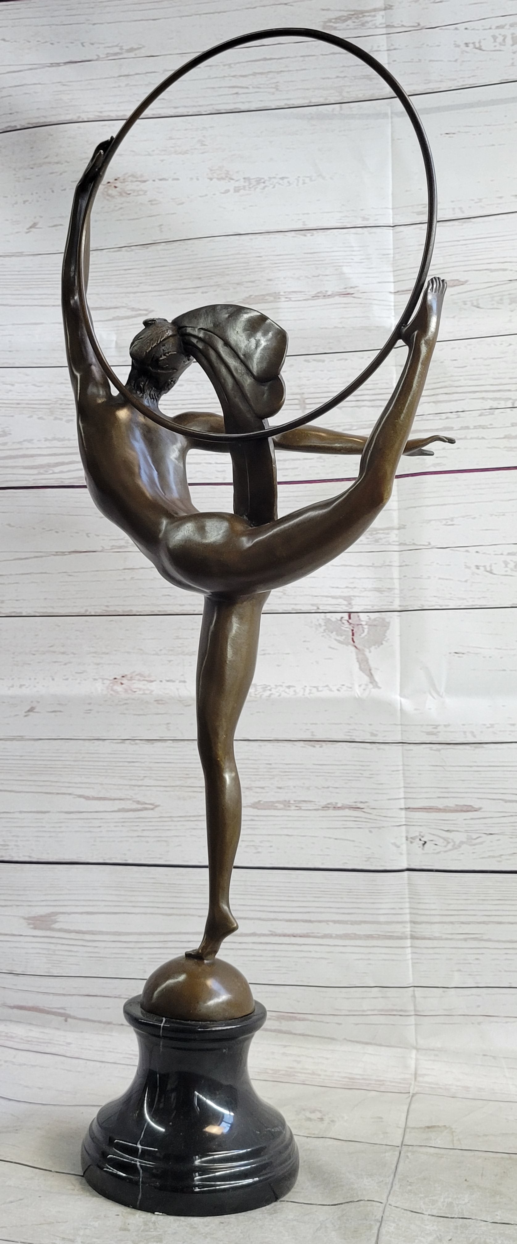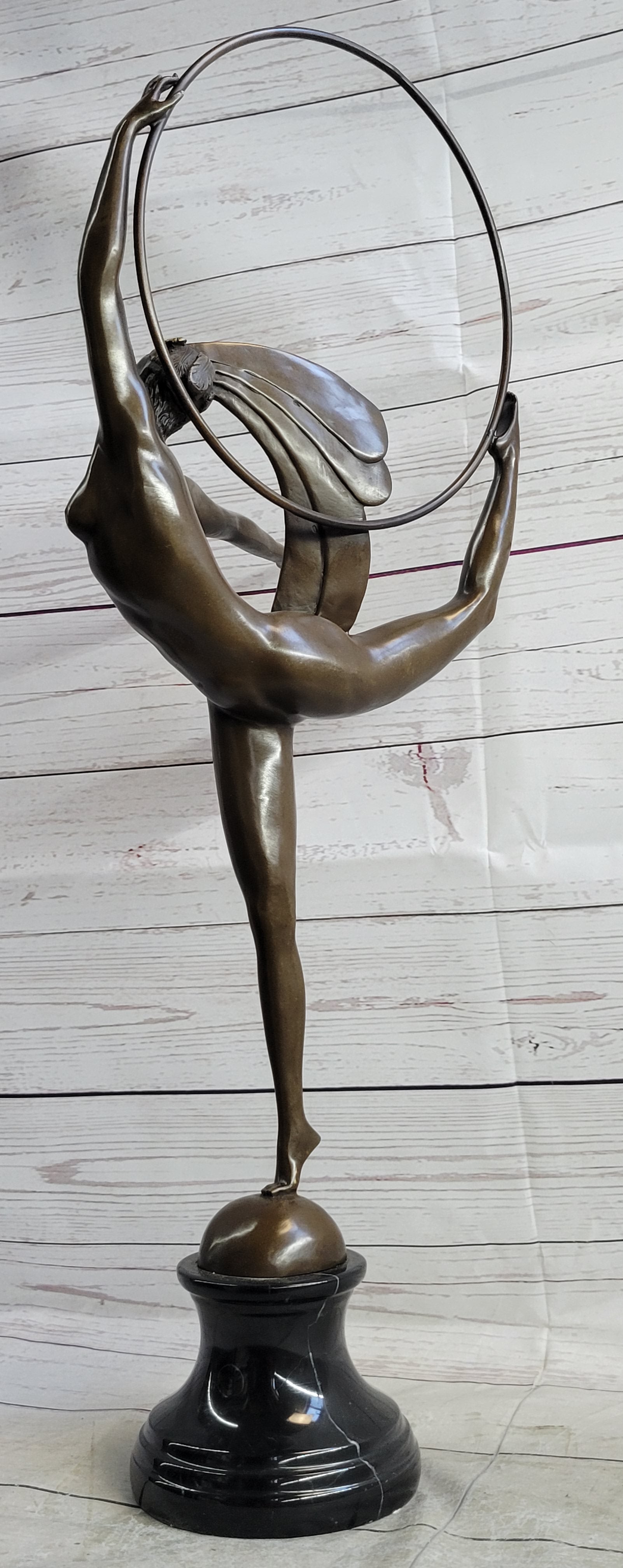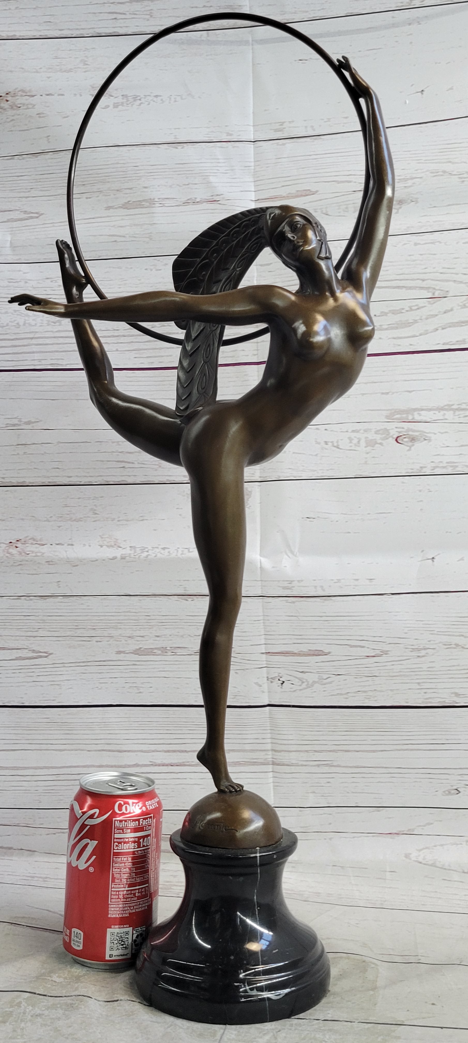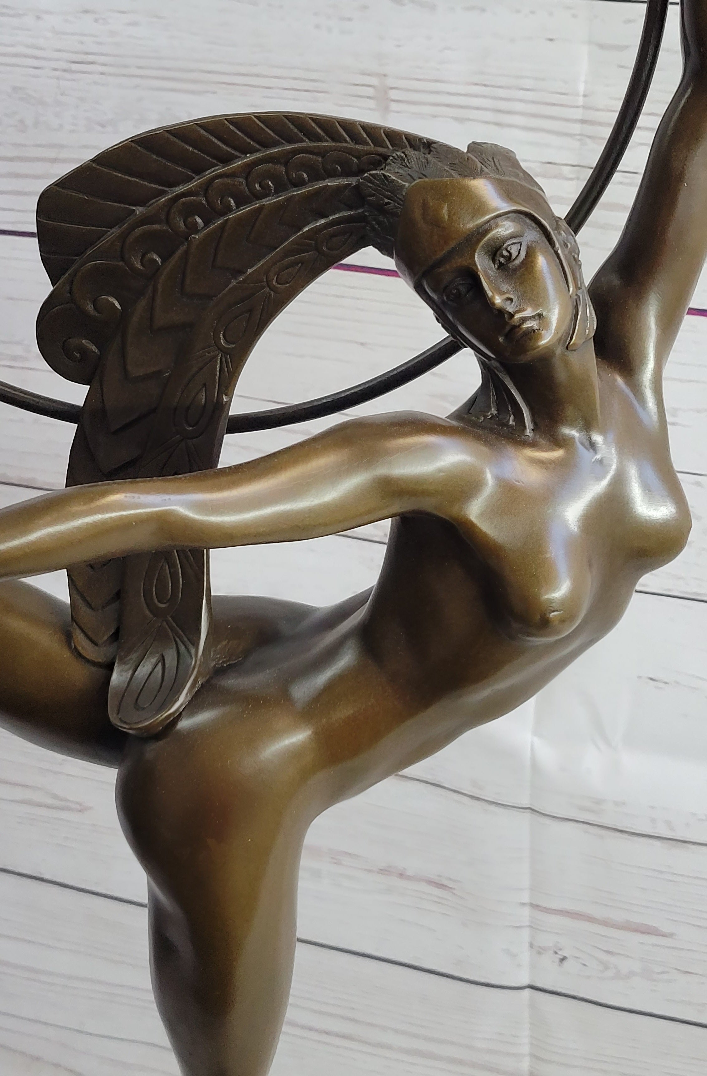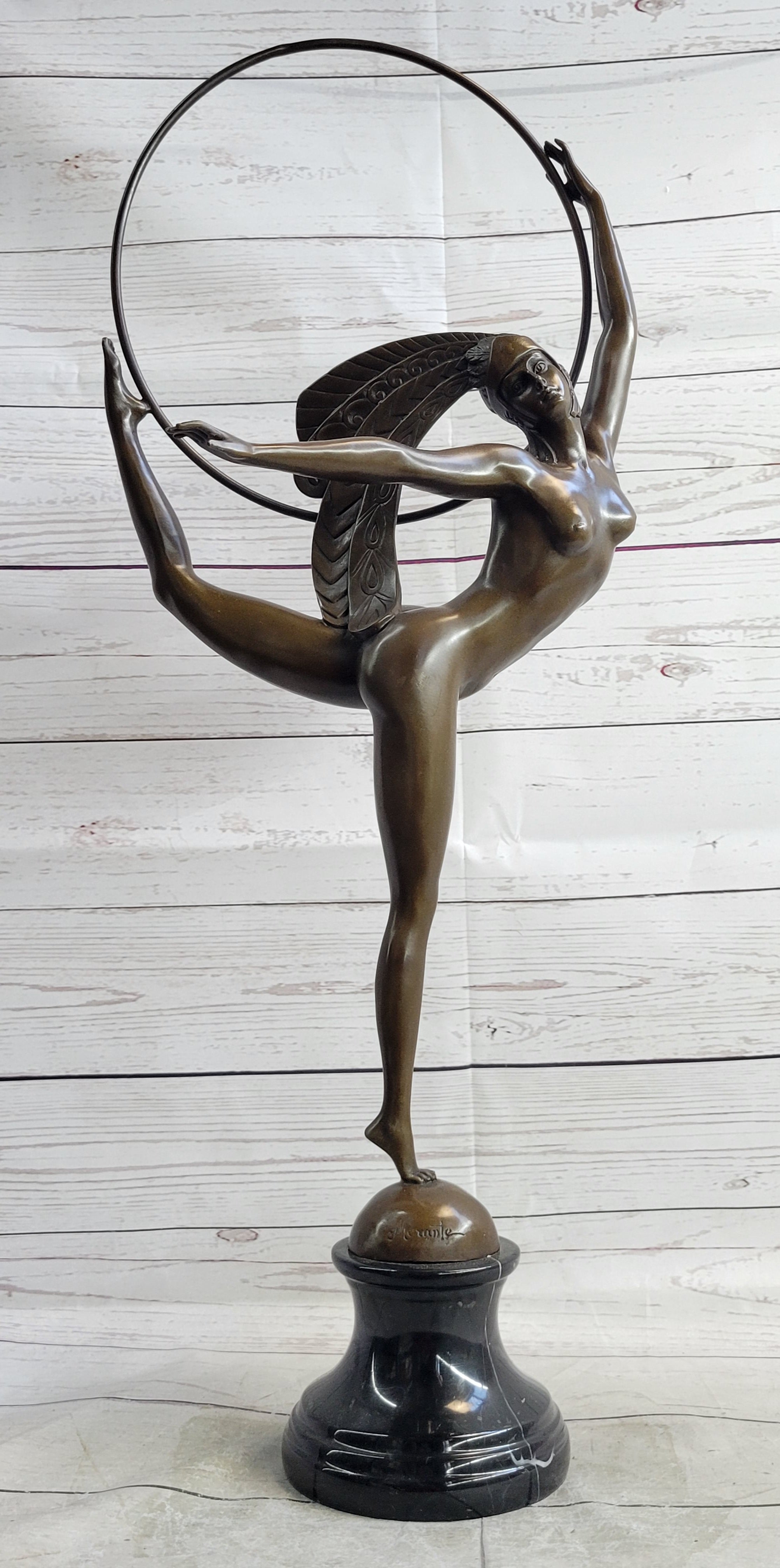 Experience the captivating allure of this exquisite bronze sculpture, a mesmerizing depiction of a skilled dancer elegantly performing a sophisticated dance routine. With her poised back leg extended and her arm gracefully outstretched, she exudes confidence and finesse as she delicately balances on one foot, skillfully maneuvering a hoop with both her hand and lifted foot. The intricate details of her striking feathered headdress, adorned with elaborate designs, further accentuate the elegance and sophistication of this remarkable piece.