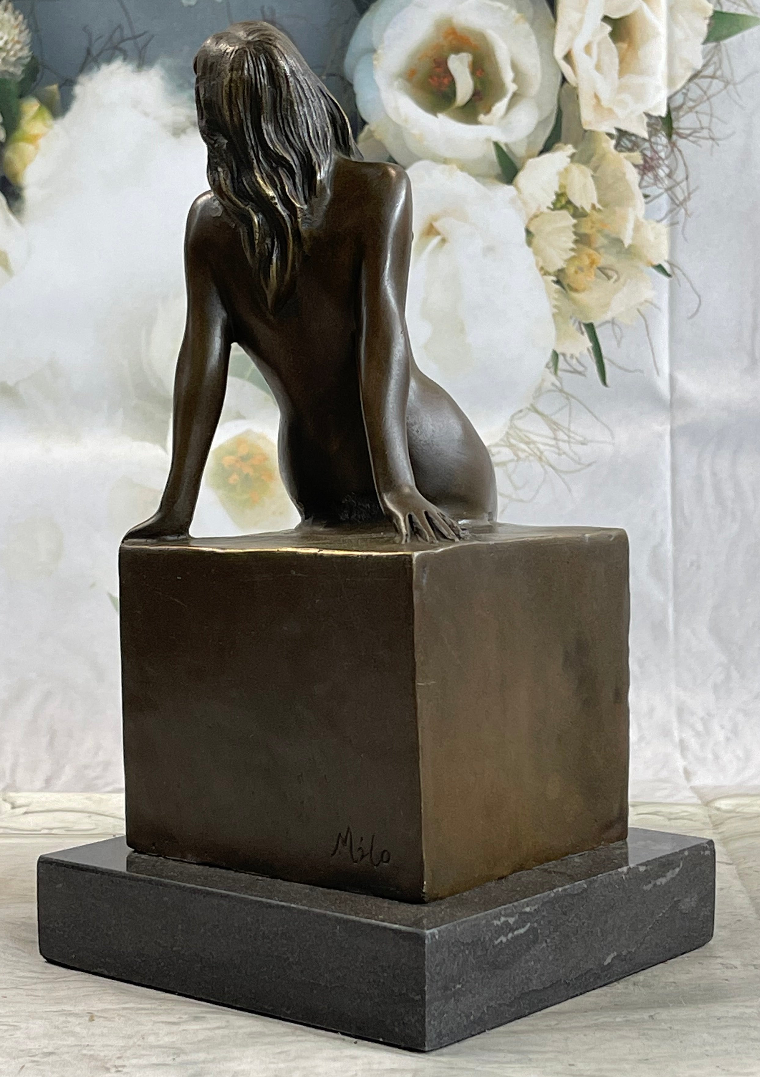The exquisite attention to detail in the girl's face, hair, and body adds to the overall beauty of this piece. The flowing lines and contours of her figure create a sense of elegance and grace that would enhance the ambiance of any space. Crafted using the lost wax method, this sculpture ensures a high level of detail and precision. It is mounted on a sturdy black marble base and bears the signature of the artist, Milo, further confirming its authenticity and quality. This sculpture is a captivating addition to any art collection and brings a touch of coastal serenity to its surroundings.Bronze Dimensions with Marble Base: Height 11" X Width 5"