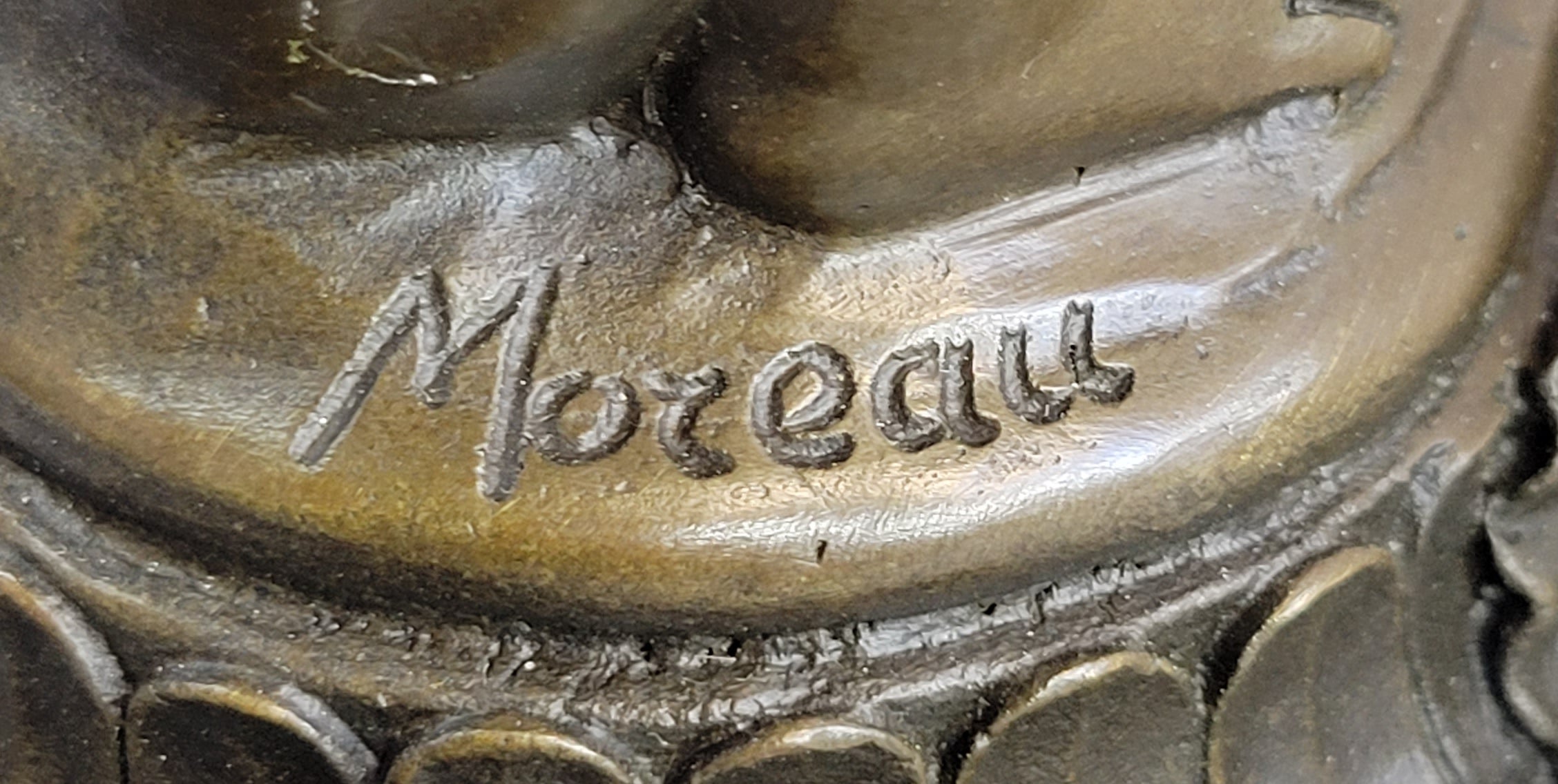 Dressed in a charming red patina outfit, complete with a matching hat and shoes, the fairy's every step falls delicately on the green patina grass beneath her. The meticulous attention to detail in both her attire and surroundings brings the sculpture to life, evoking a sense of innocence and wonder. Crafted with care and precision, this 100% bronze sculpture is a testament to the timeless artistry achieved through the revered "Lost Wax Method." Mounted on a marble base and signed by the artist Moreau, this whimsical creation is not just a piece of art but a magical addition that would delight any little girl's room, creating a dreamlike atmosphere filled with fantasy and imagination.Bronze Dimensions :Height 9" x Width 4"