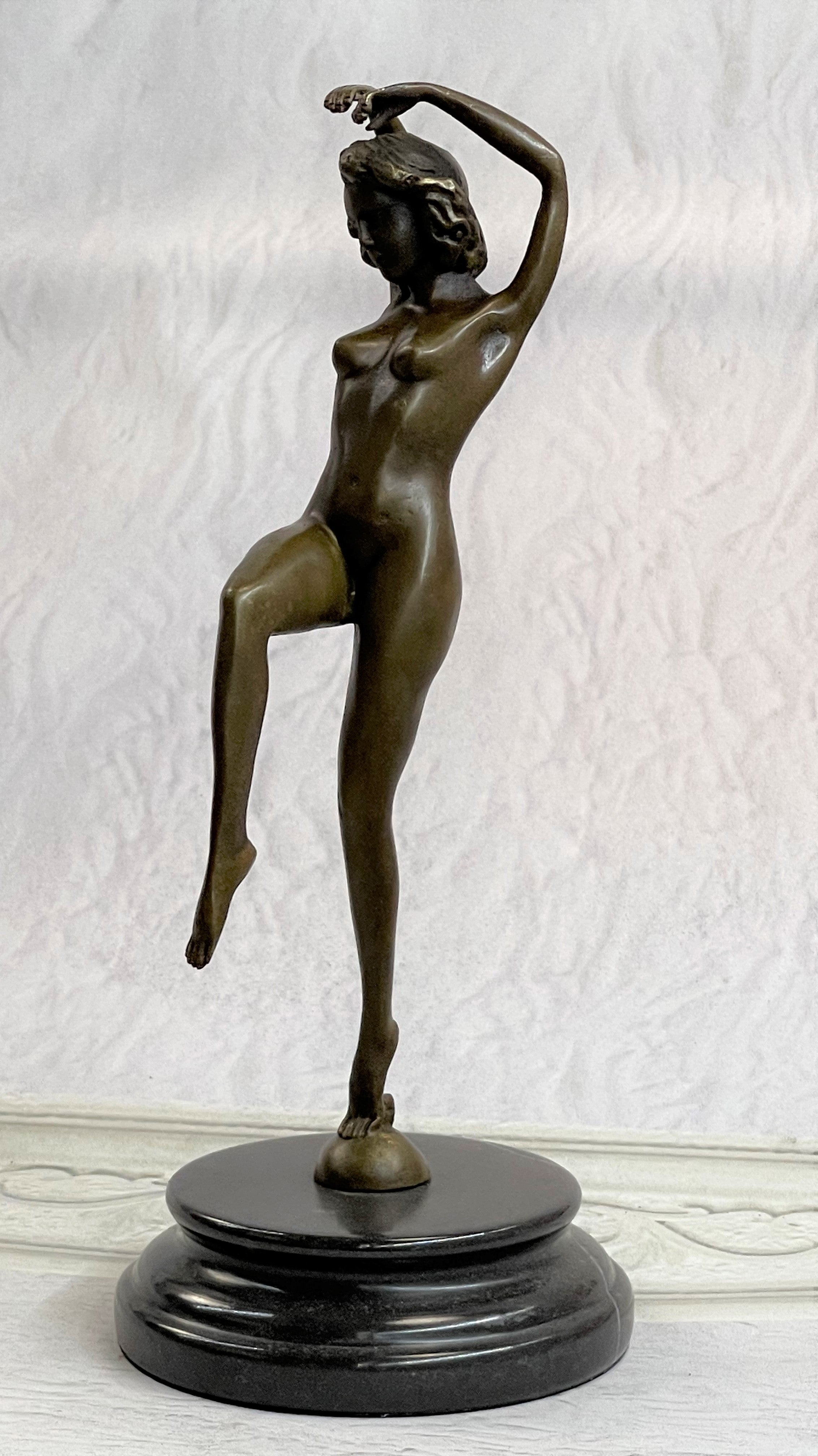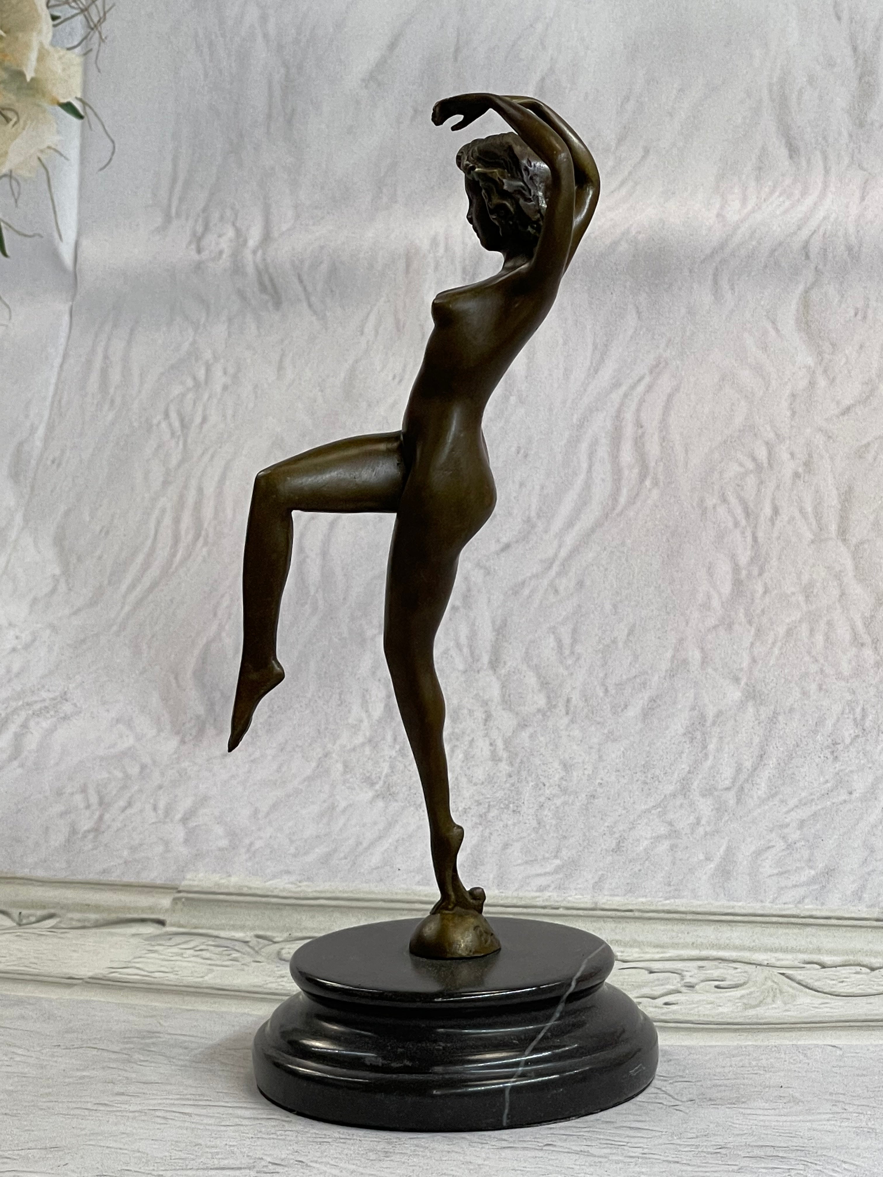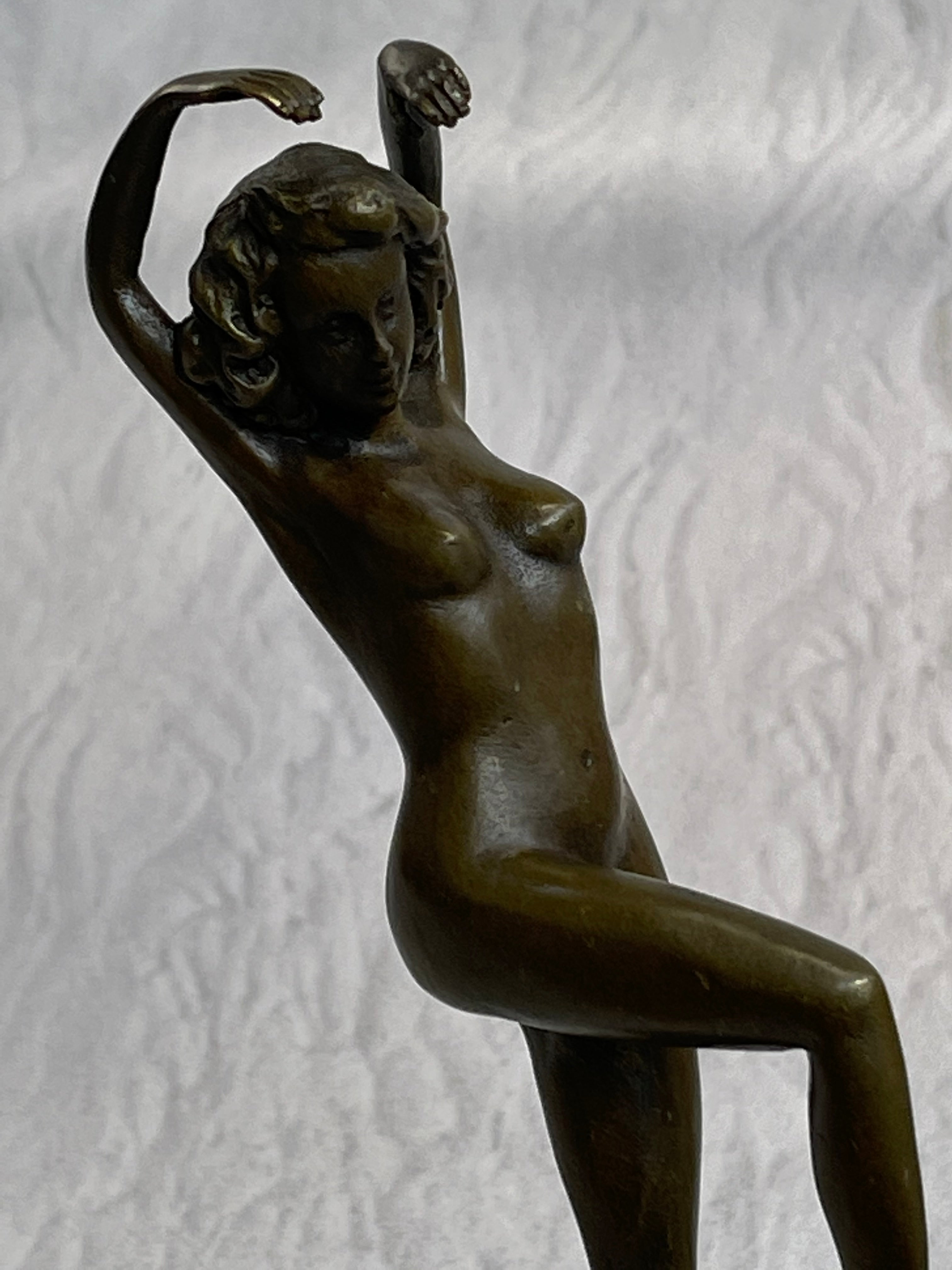 This is a depiction of a nude girl standing in a manner very reminiscent of a yoga pose. She adopts a wonderful exotic stance that allows her to hunch over backwards with her arm fully raised. She rests her head to the side with a look of absolute contentment as she concentrates on her movement. Her face is exquisitely detailed and her short boy hair cut delicately frames her slender face. This piece forms a beautiful image of enticing lines and contours and would definitely be a great addition to any space. This is truly a delightful piece, casted using the lost wax method, founded thousands of years ago, ensuring an exquisitely detailed sculpture that will add grace and beauty to your business or homeBronze Dimensions with Marble Base:Height 11" x Width 4 1/2"