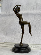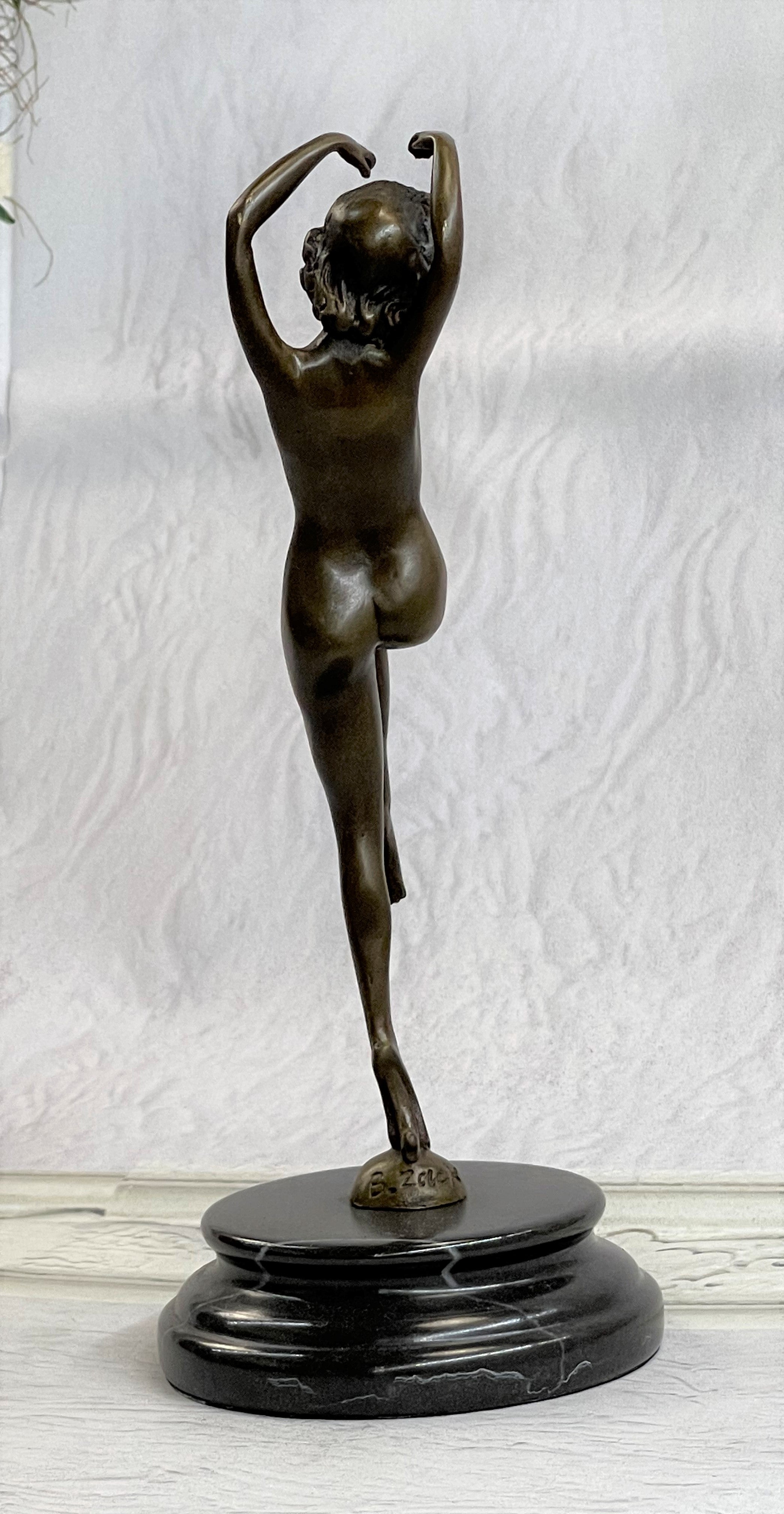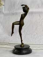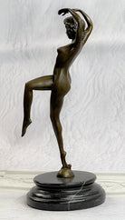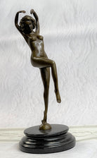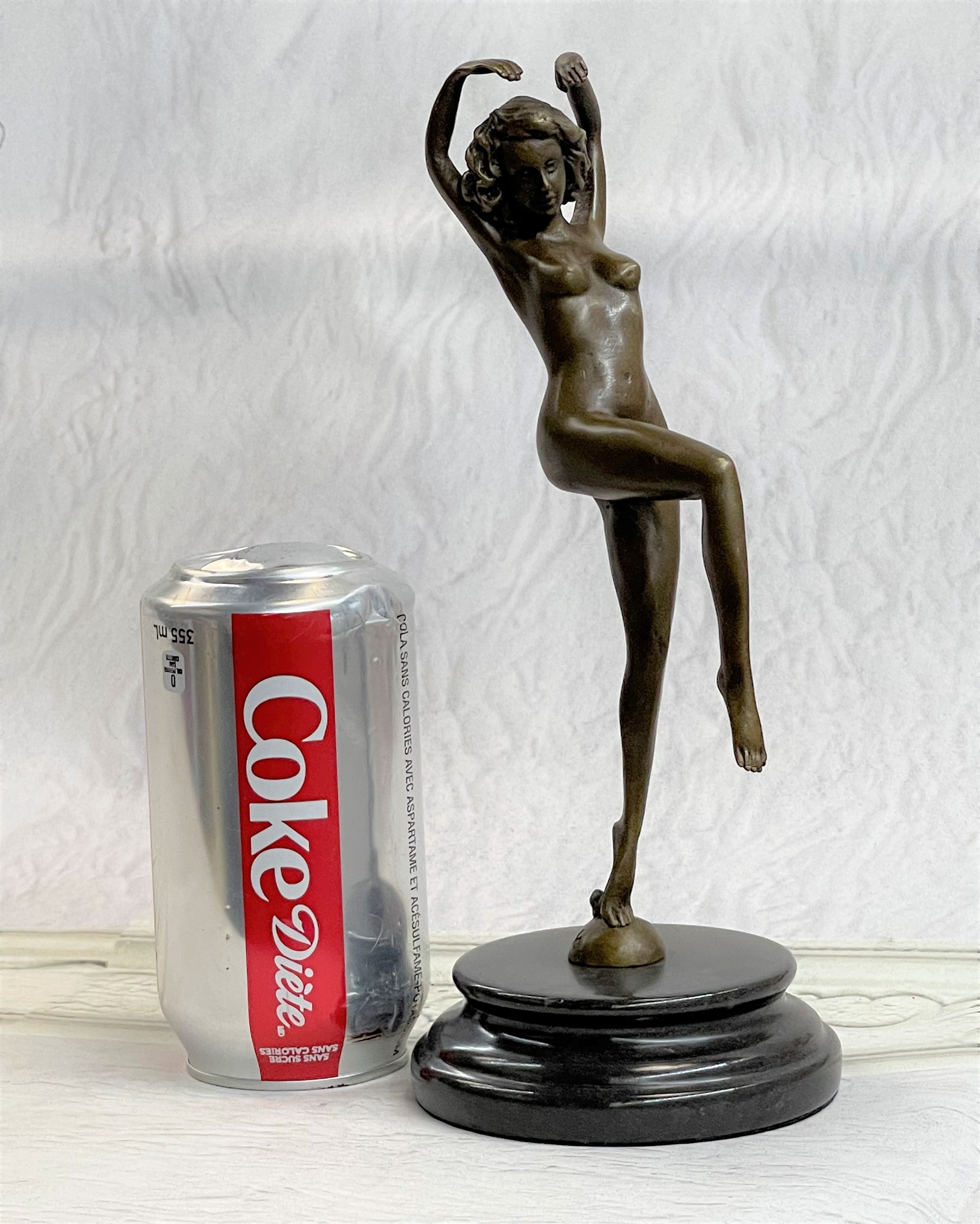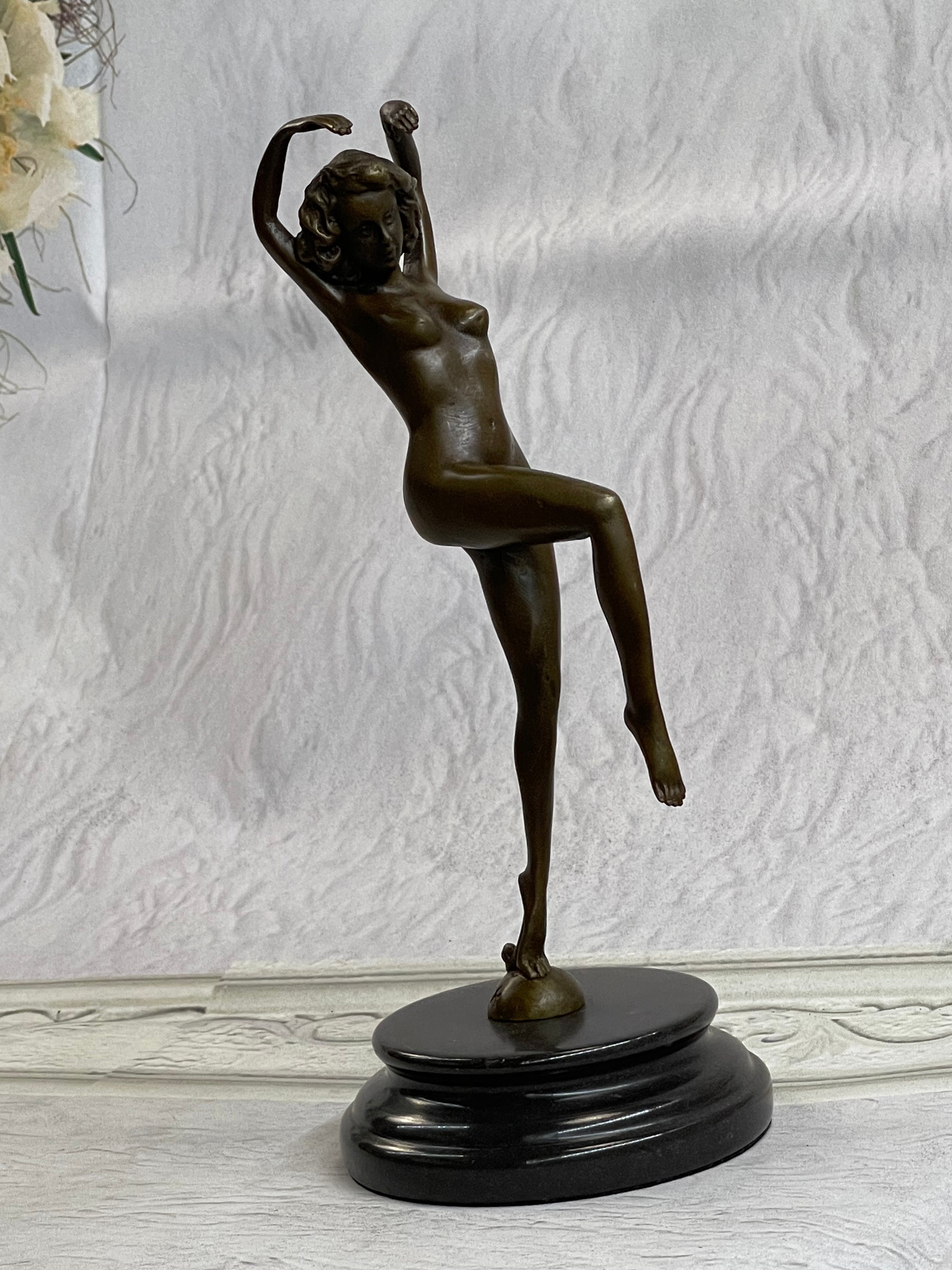 This is a depiction of a nude girl standing in a manner very reminiscent of a yoga pose. She adopts a wonderful exotic stance that allows her to hunch over backwards with her arm fully raised. She rests her head to the side with a look of absolute contentment as she concentrates on her movement. Her face is exquisitely detailed and her short boy hair cut delicately frames her slender face. This piece forms a beautiful image of enticing lines and contours and would definitely be a great addition to any space. This is truly a delightful piece, casted using the lost wax method, founded thousands of years ago, ensuring an exquisitely detailed sculpture that will add grace and beauty to your business or homeBronze Dimensions with Marble Base:Height 11" x Width 4 1/2"