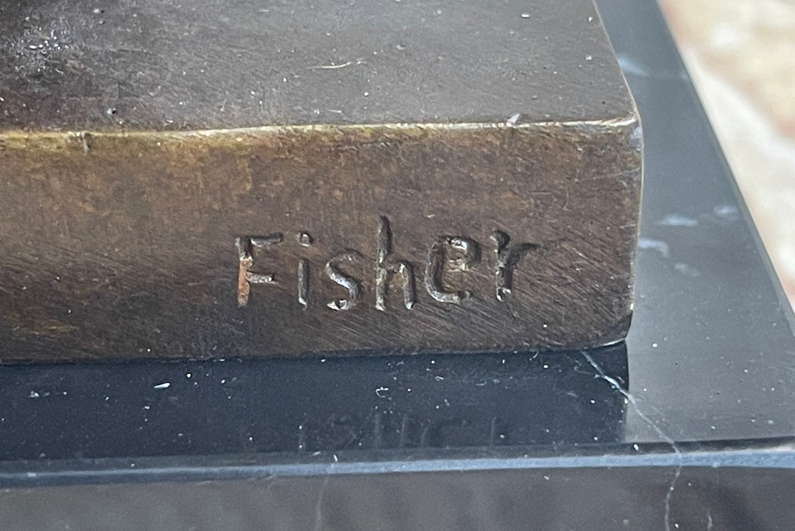 Poised on a sleek black marble base, this sculpture becomes a focal point in any collection of fine art. The marriage of the ancient casting technique with contemporary presentation elevates its aesthetic appeal, making it a timeless addition to your artistic ensemble. The artist Fisher's signature graces the piece, not only attesting to its authenticity but also adding a personal touch to this remarkable work of art. Investing in this stunning sculpture promises not only an immediate visual delight but also the enduring pleasure of enjoying its captivating beauty for years to come.