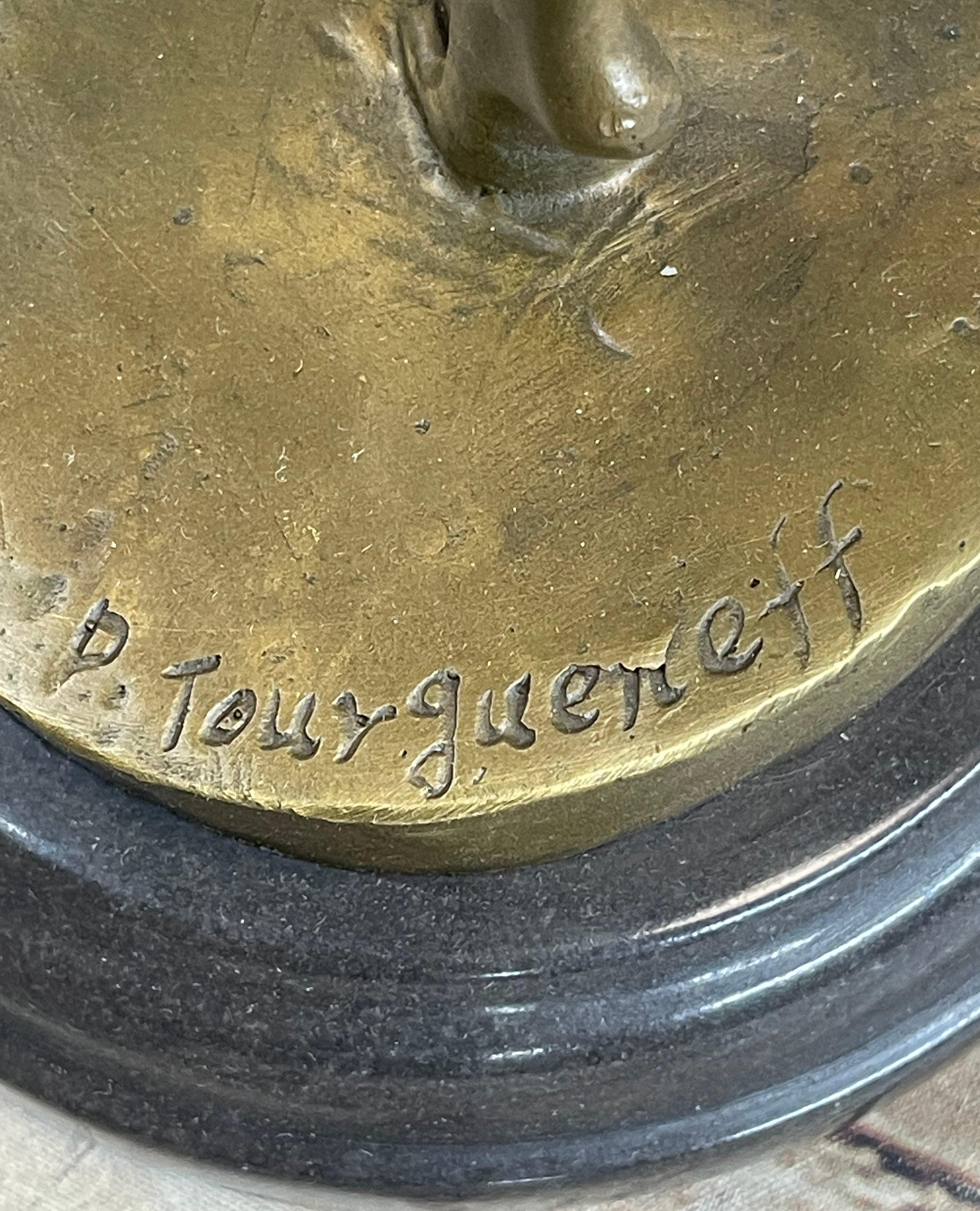 She Is An Artist`S Muse. She Is Comfortable Standing Before His Easel And Being The Inspiration For The Strokes Of His Paintbrush. She Strikes An Athletic Pose. She Stretches Back And Prepares To Throw A Baseball. She Is Fully Nude And Shows Off Her Slender Figure And Round Breasts.100% Bronze And Handmade, This Brown Patina Sculpture Was Cast Using The "Lost Wax Method" And Mounted On A Marble Base And Is Signed P. Tourgueneff .Bronze Dimensions with Marble Base: Height 15 1/2" x Width 11"
