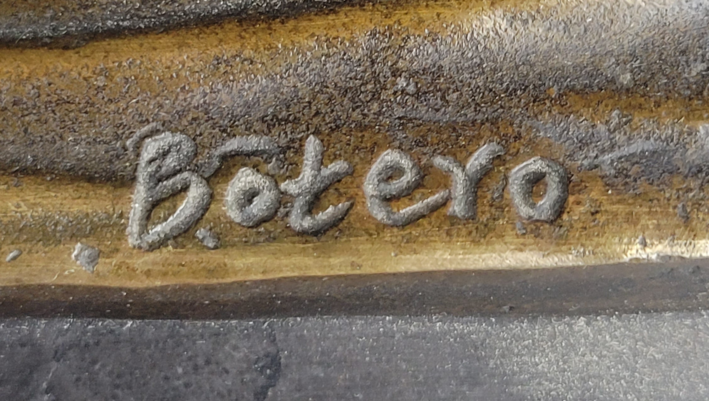 Crafted from 100% bronze and finished with a rich brown patina, this sculpture stands as a testament to Botero's unwavering dedication to his craft. It rests majestically on a black marble base, adding an element of sophistication to its presentation while ensuring its stability and endurance. The inclusion of Botero's signature serves as a seal of authenticity, affirming its place within the artist's esteemed body of work. Whether displayed as a cherished part of an art collection or as a striking centerpiece in an artful space, this sculpture invites viewers to immerse themselves in the unique aesthetic and artistic genius of the renowned Botero.Bronze Dimensions with Marble Base: Height 8.5" X Width 13"