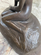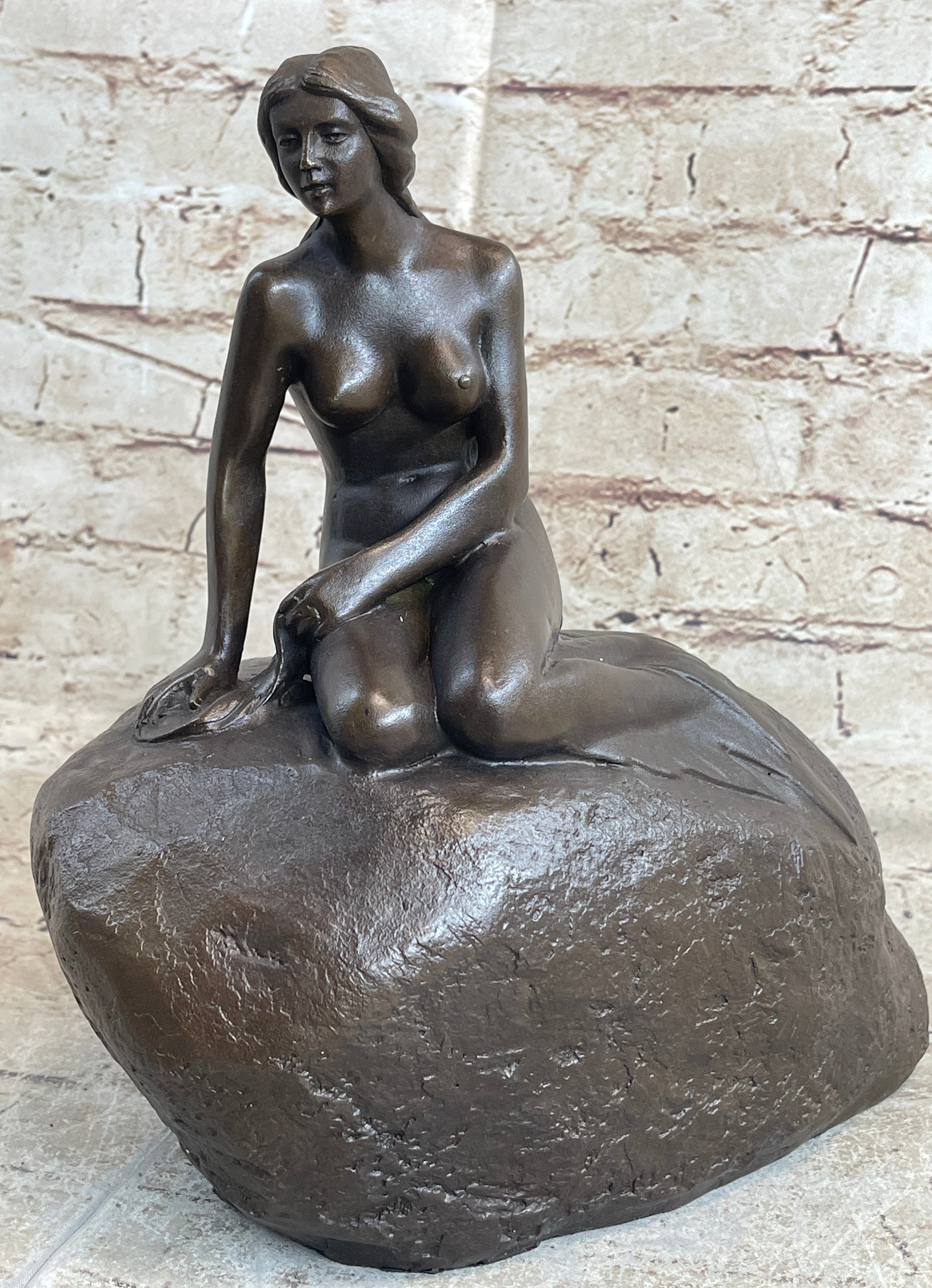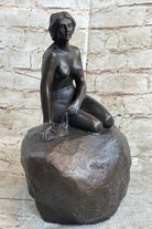 Nude Female Mermaid Figure Sitting on a Rock Bronze Statue Sculpture Signed Art