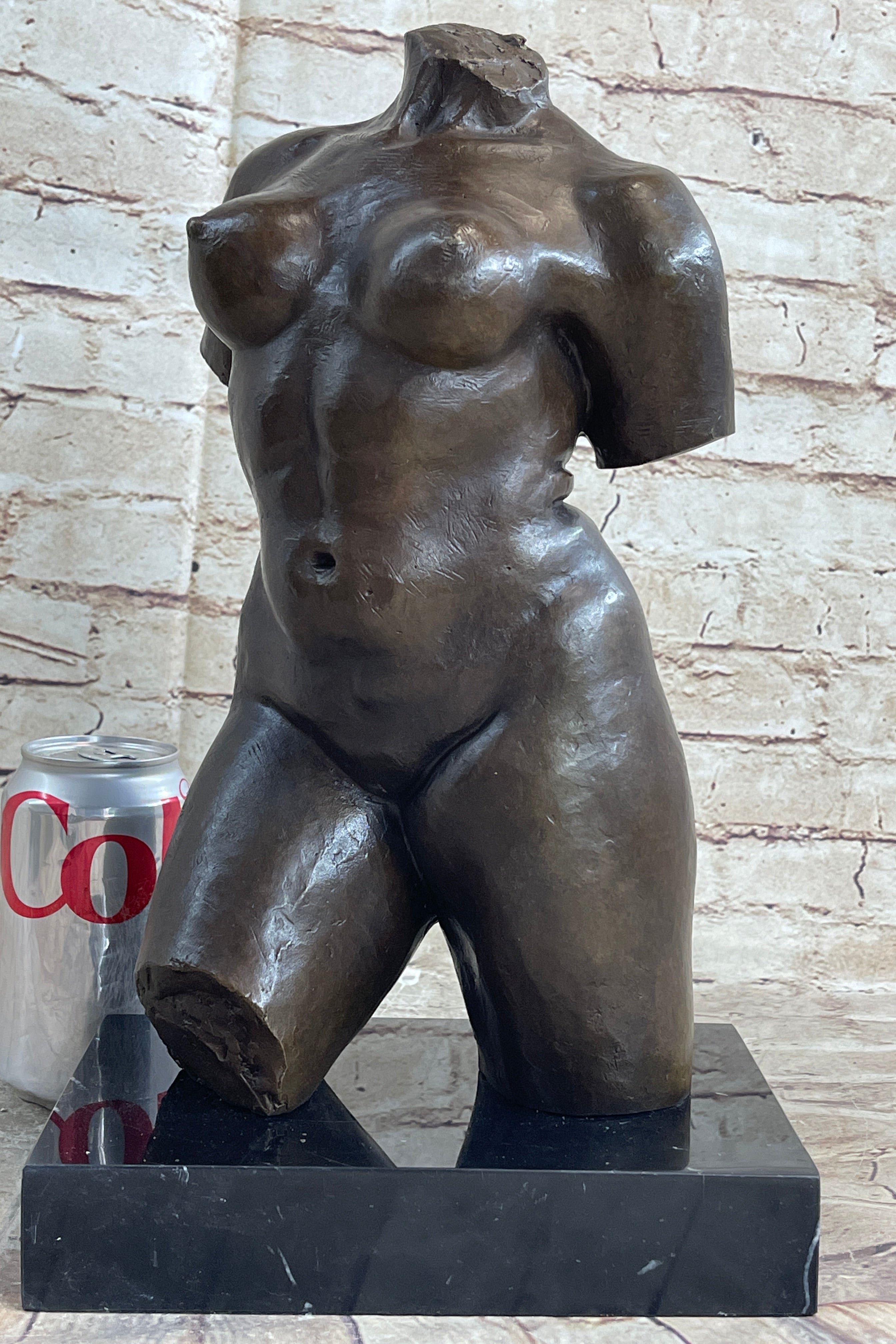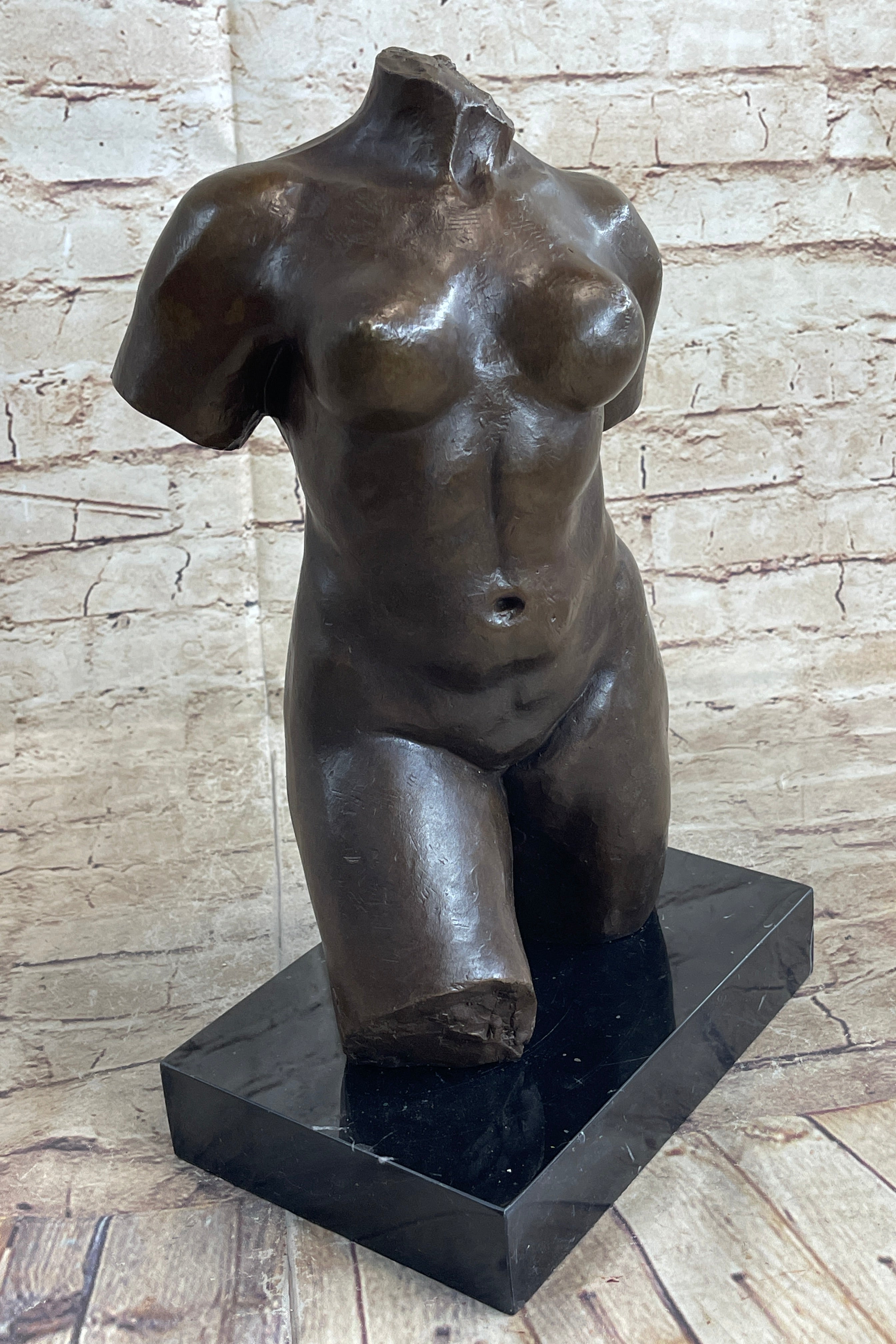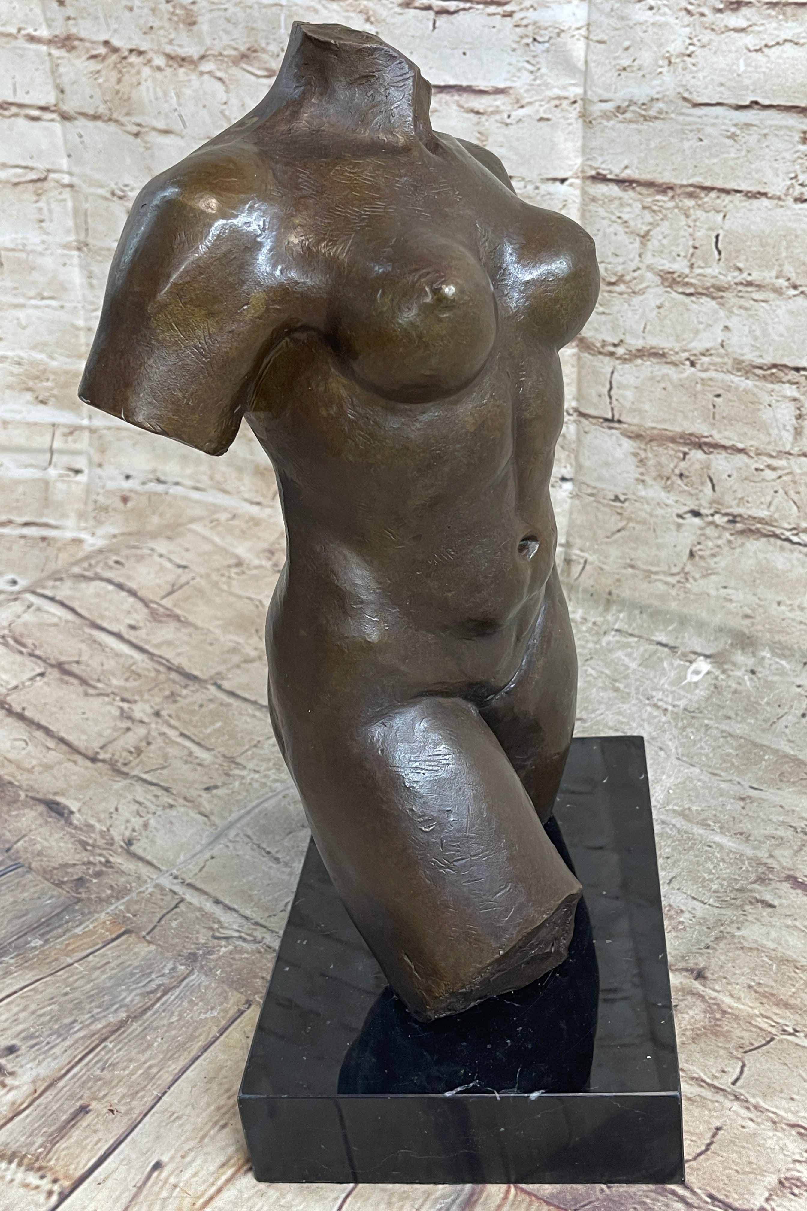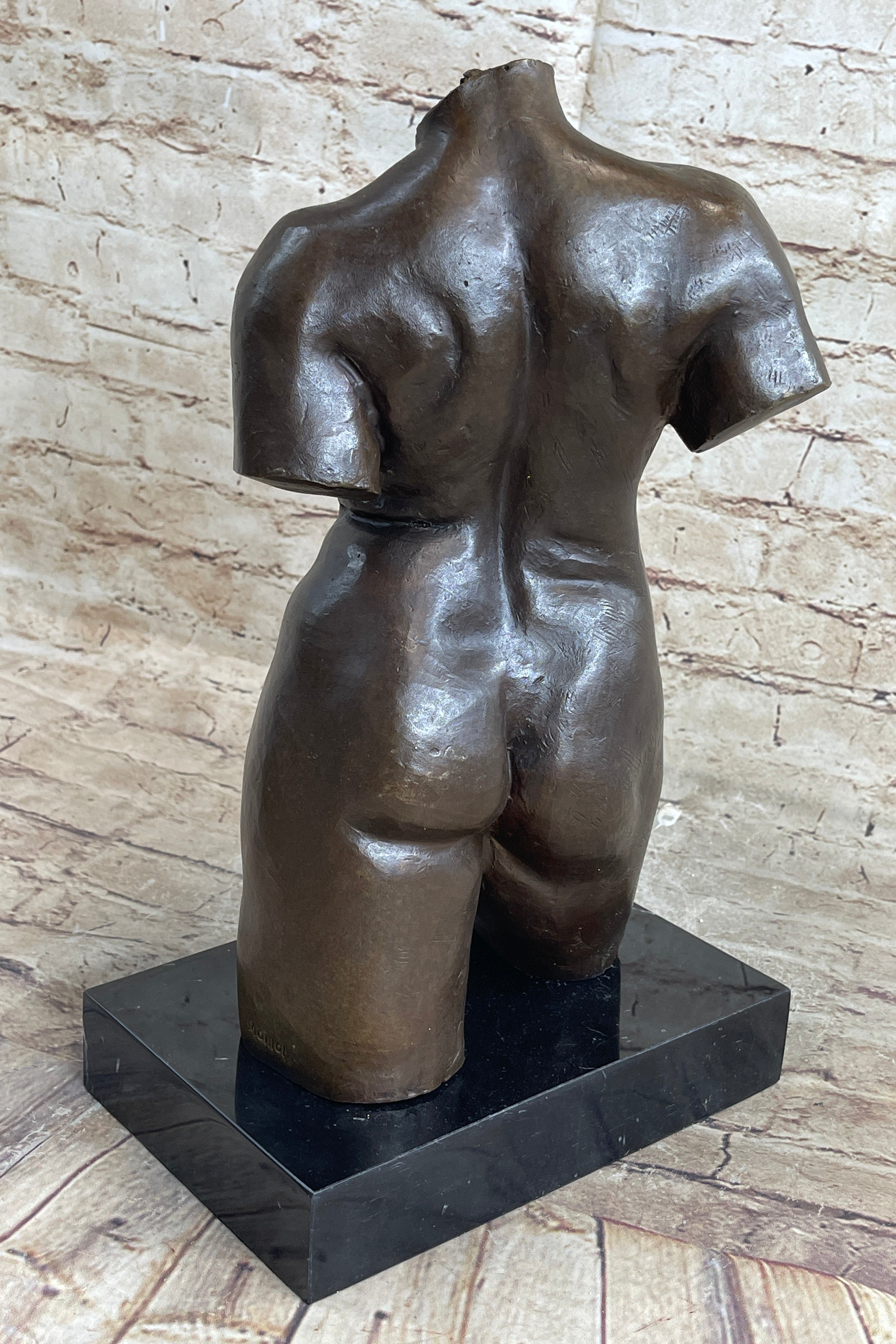 As an abstract representation of the female torso, this sculpture pays homage to the beauty and sensuality celebrated in Aristide Maillol's original masterpiece. The deliberate omission of certain elements invites viewers to focus on the purity of form and the emotional resonance conveyed through the curves and lines of the sculpture. Displayed on the black marble base, this artwork becomes a focal point, radiating a timeless elegance that transcends classical and contemporary aesthetics.Bronze Dimensions with Marble Base: Height 14" X Width 8"