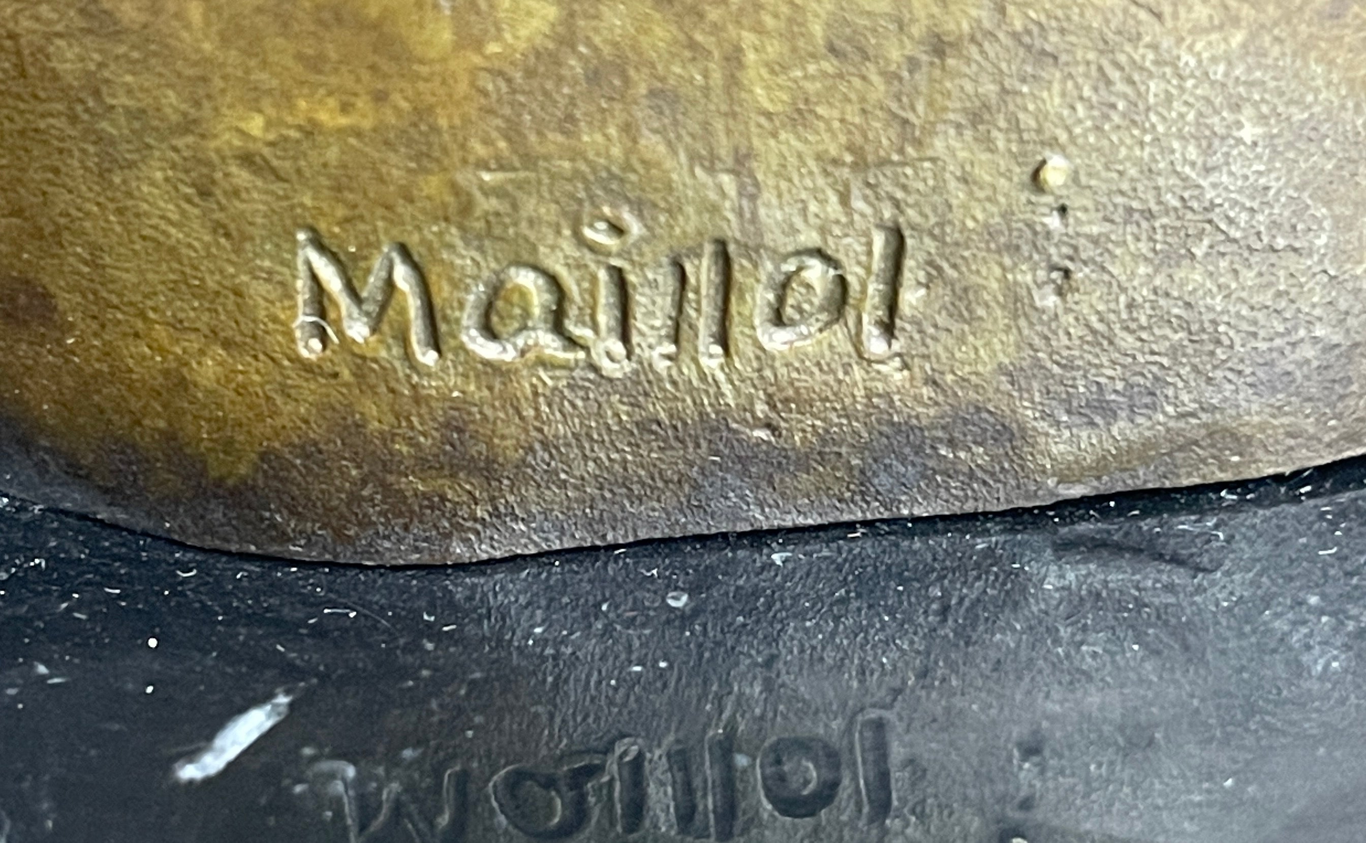 The sculpture stands proudly on a black marble base, providing a solid foundation that complements the sleek and abstract design. Crafted with precision and artistry, the piece is a product of the lost wax method, a technique that ensures the preservation of intricate details. The absence of certain features directs attention to the essence of the female form, creating a captivating visual experience. Signed by Maillol, the sculpture carries the artist's mark, attesting to its quality and connection to the renowned sculptor.